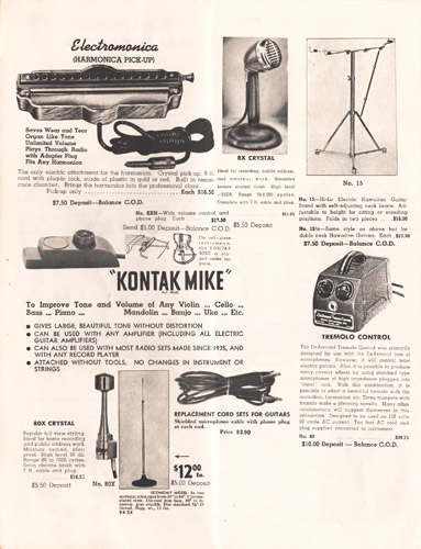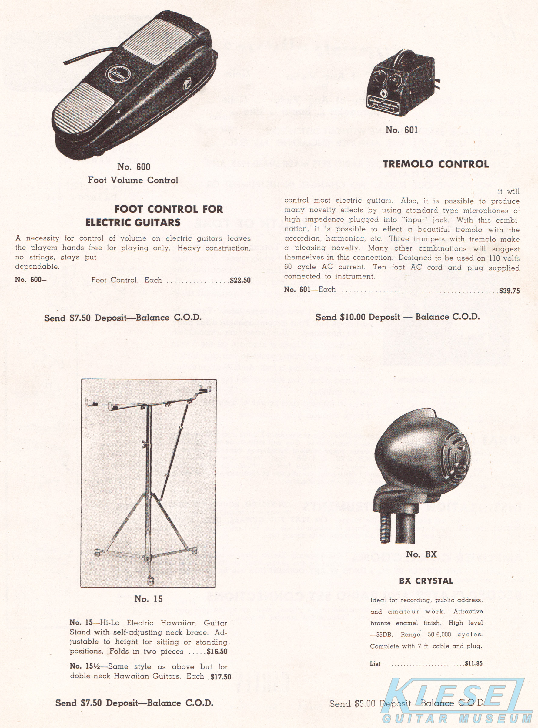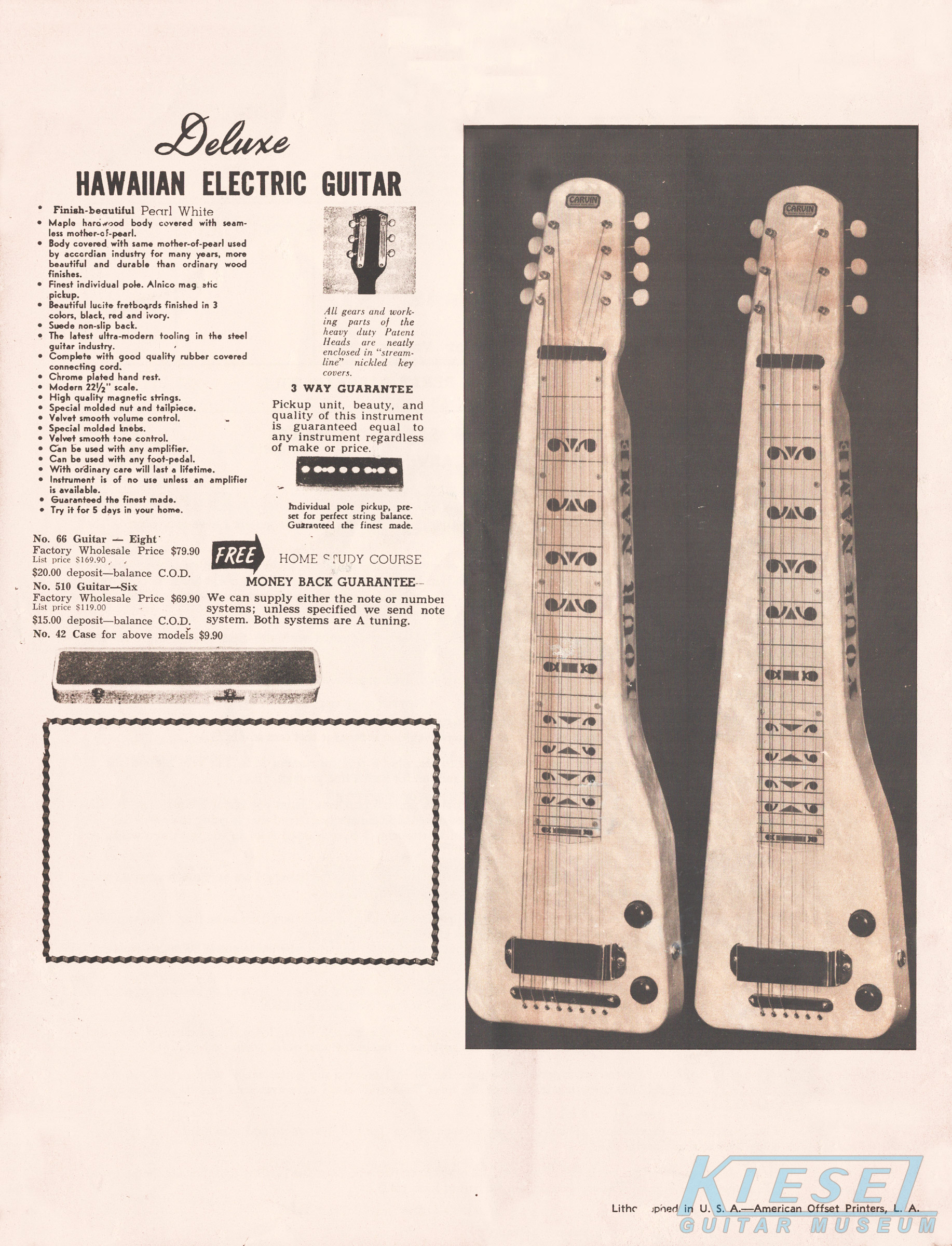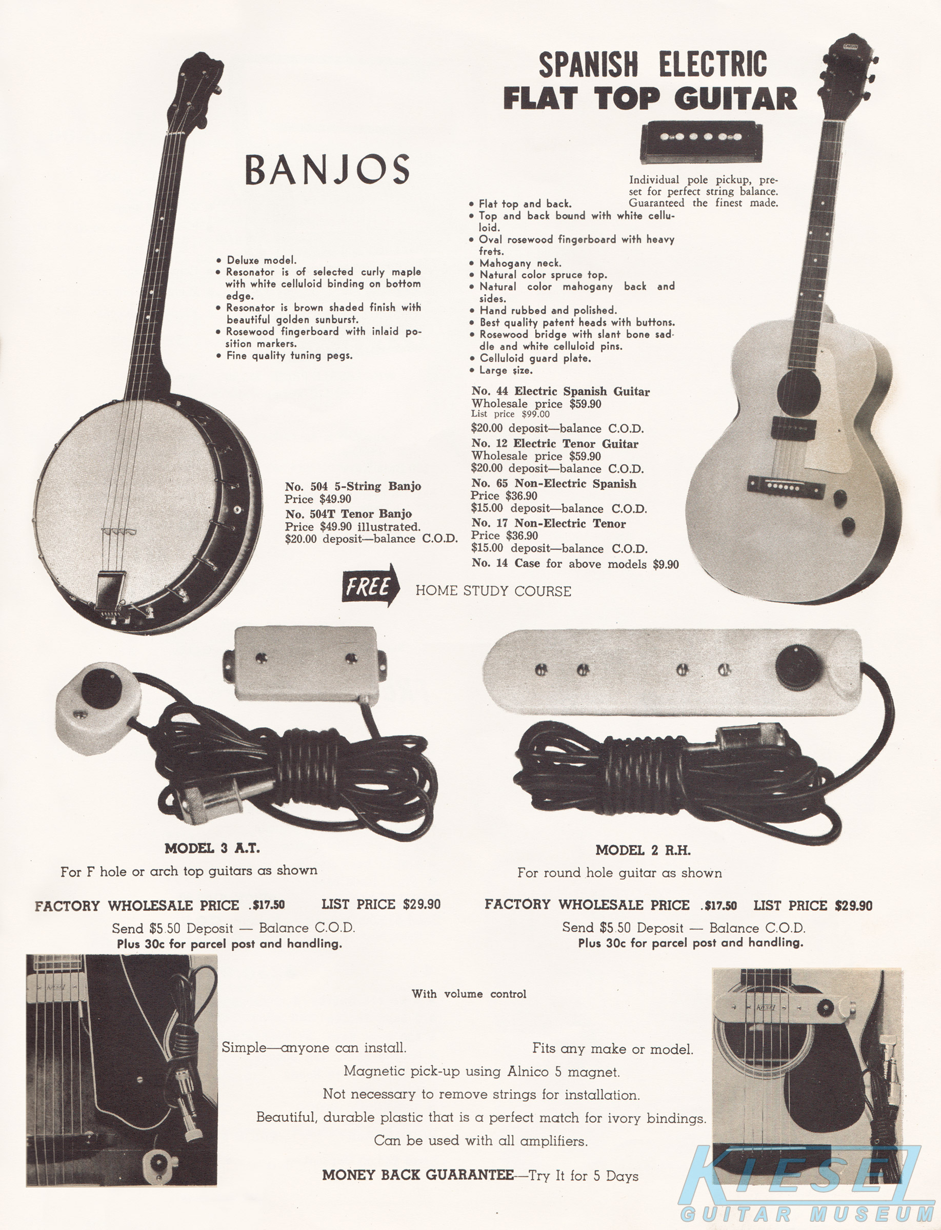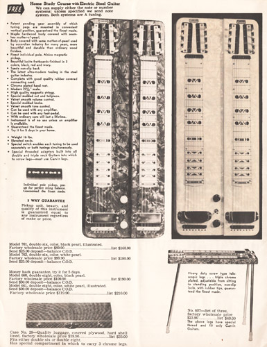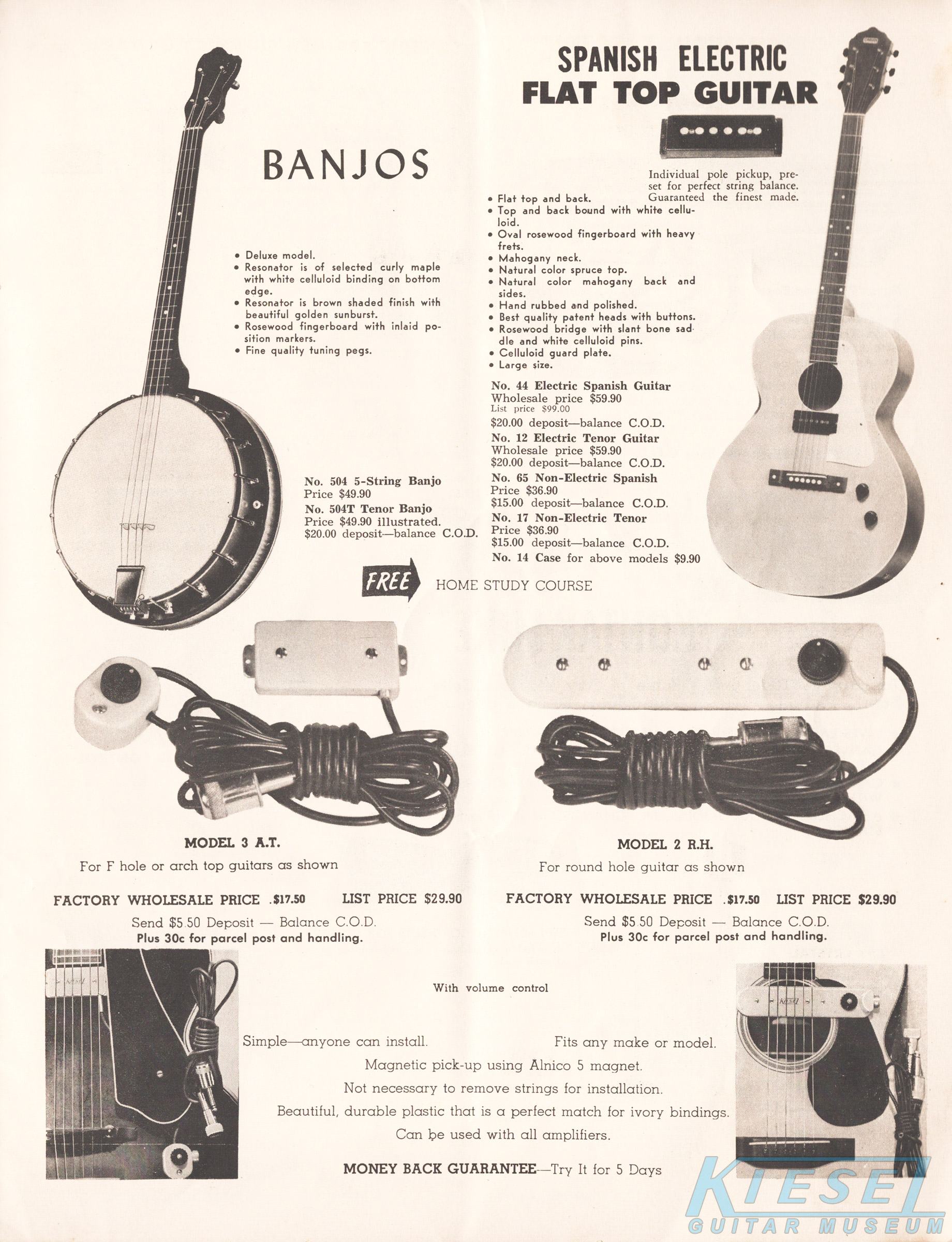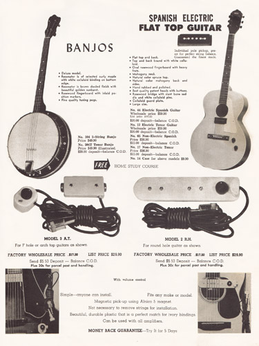 The Model 44 Spanish electric flattop was unusual - it was essentially an acoustic guitar with a pickup and controls added. The top was spruce, with mahogany neck, back and sides and body binding. The fingerboard was rosewood, as was the bridge, which had bone saddles. Price on the Model 44 was $59.90, or $36.90 for the Model 65 acoustic version. Also offered was the Model 12 tenor guitar and it's acoustic version, the Model 17. No details were given on either tenor model, but presumably, they were shorter-scale instruments tuned to a higher pitch. Both tenor models sold for the same price as their standard counterparts, and a case for any of these was $9.90.