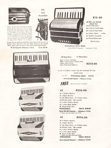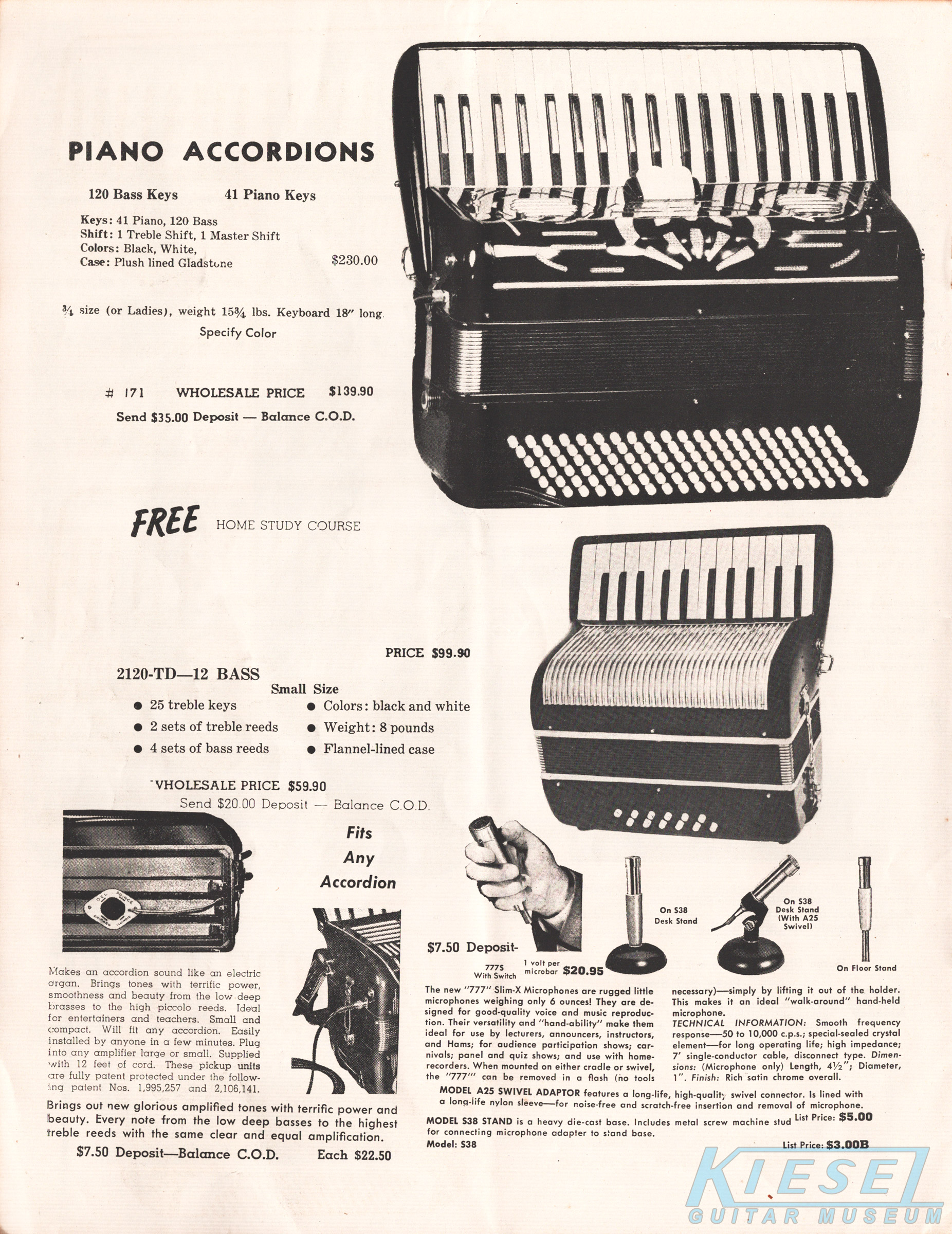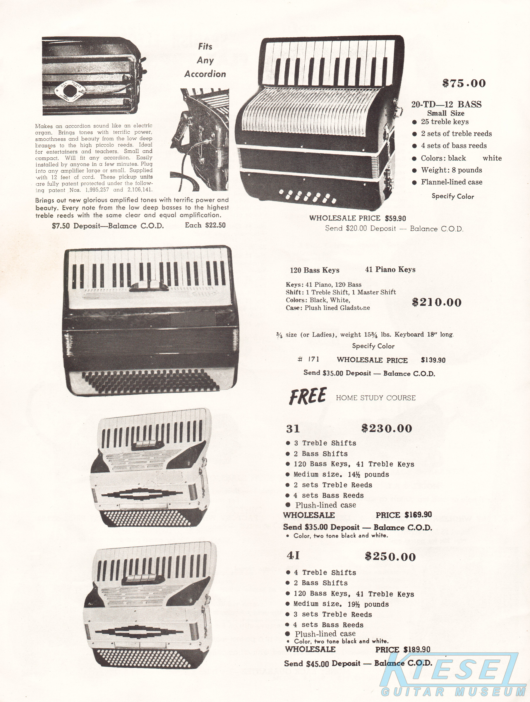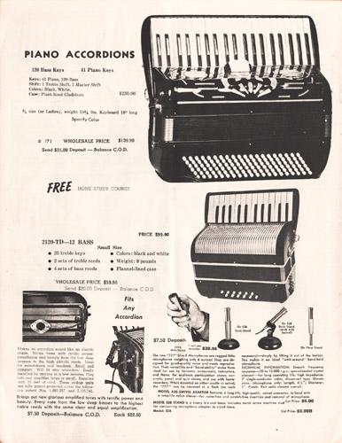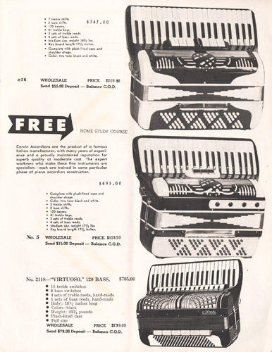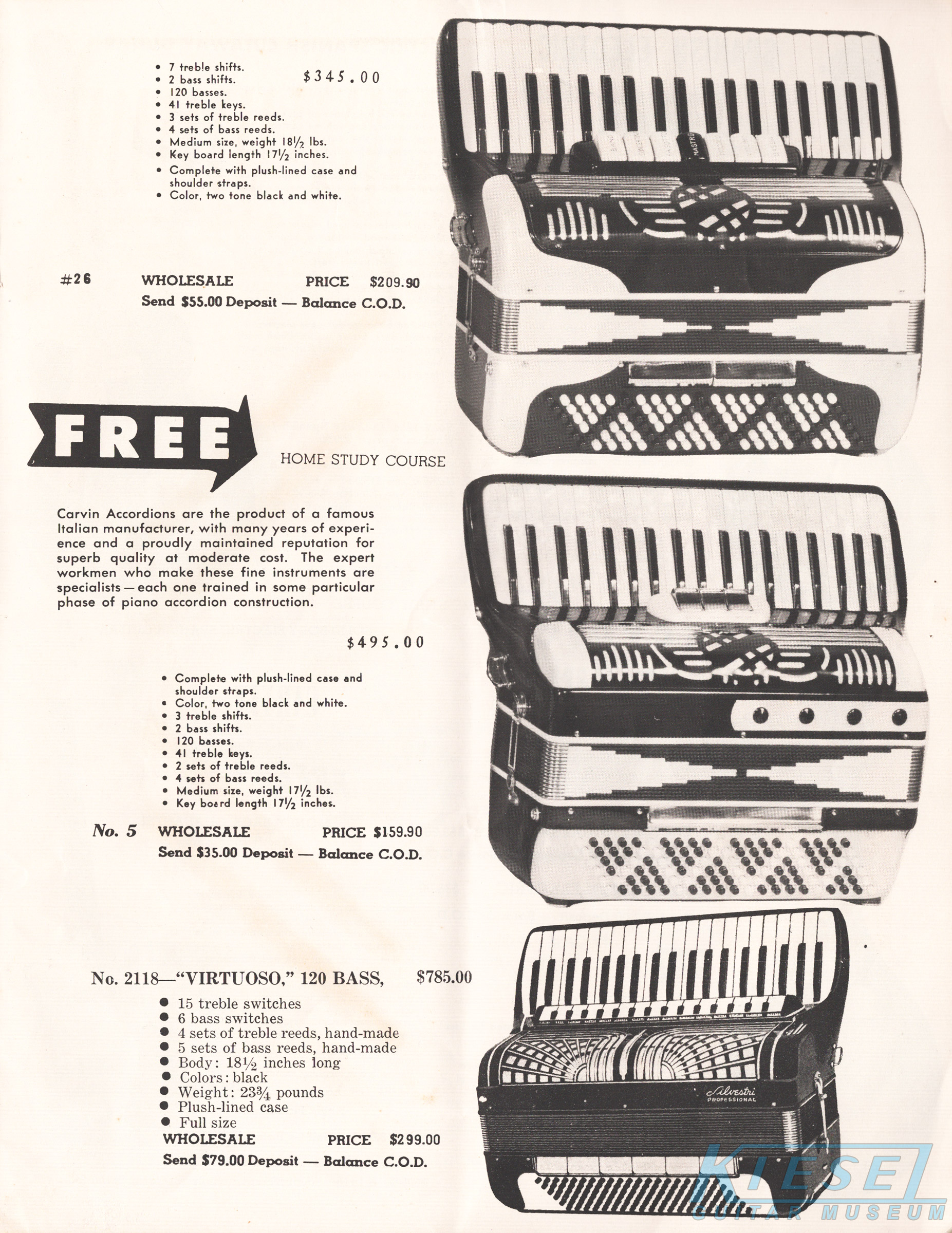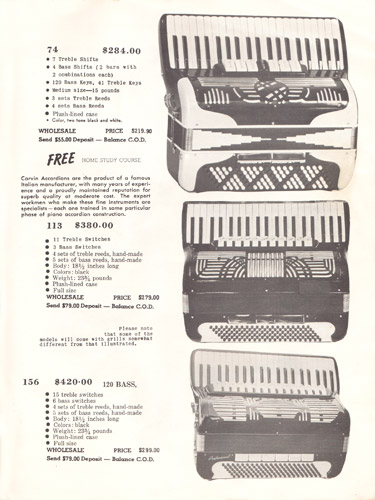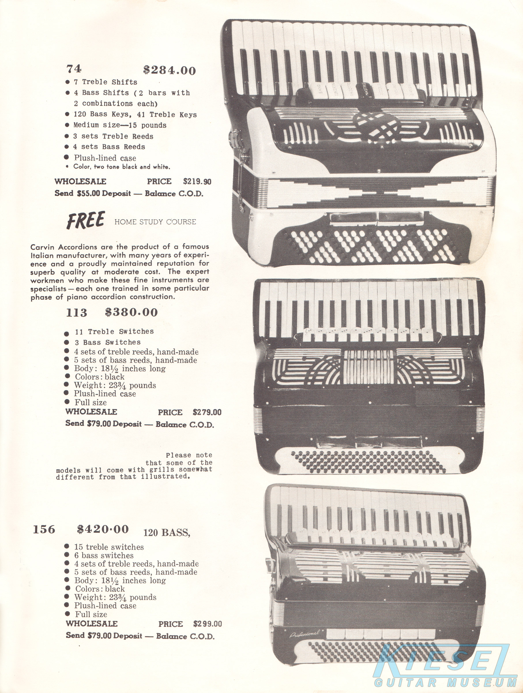 If you wanted an accordion, Carvin could also help you out. These accordions were made by a "famous Italian manufacturer", most likely Sonola (which were featured by name in Carvin catalogs in the 1960s). Pricing ranged from $284.00 to $420.00, making them the most expensive items in Carvin's 1954 catalog. Noteably, the $420.00 Model 156 accordion would sell for $4353.00 in 2021 dollars.