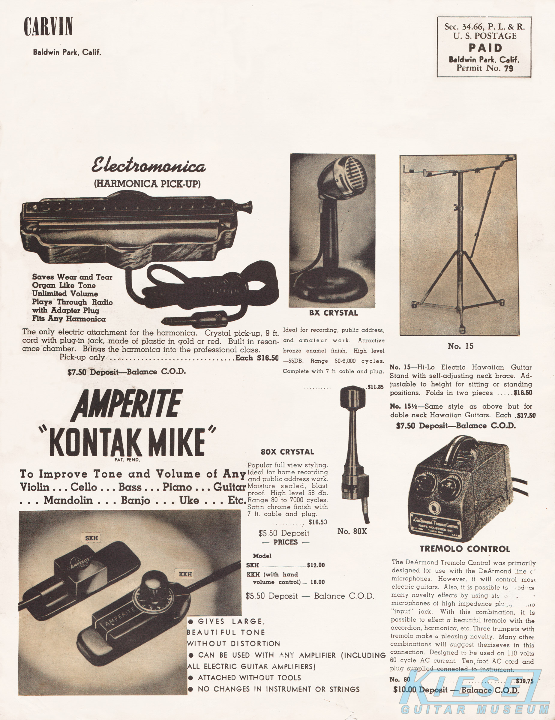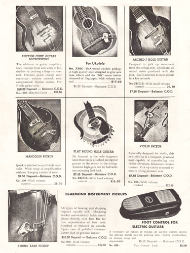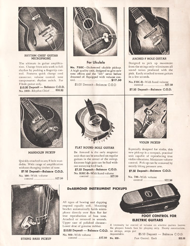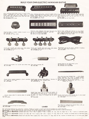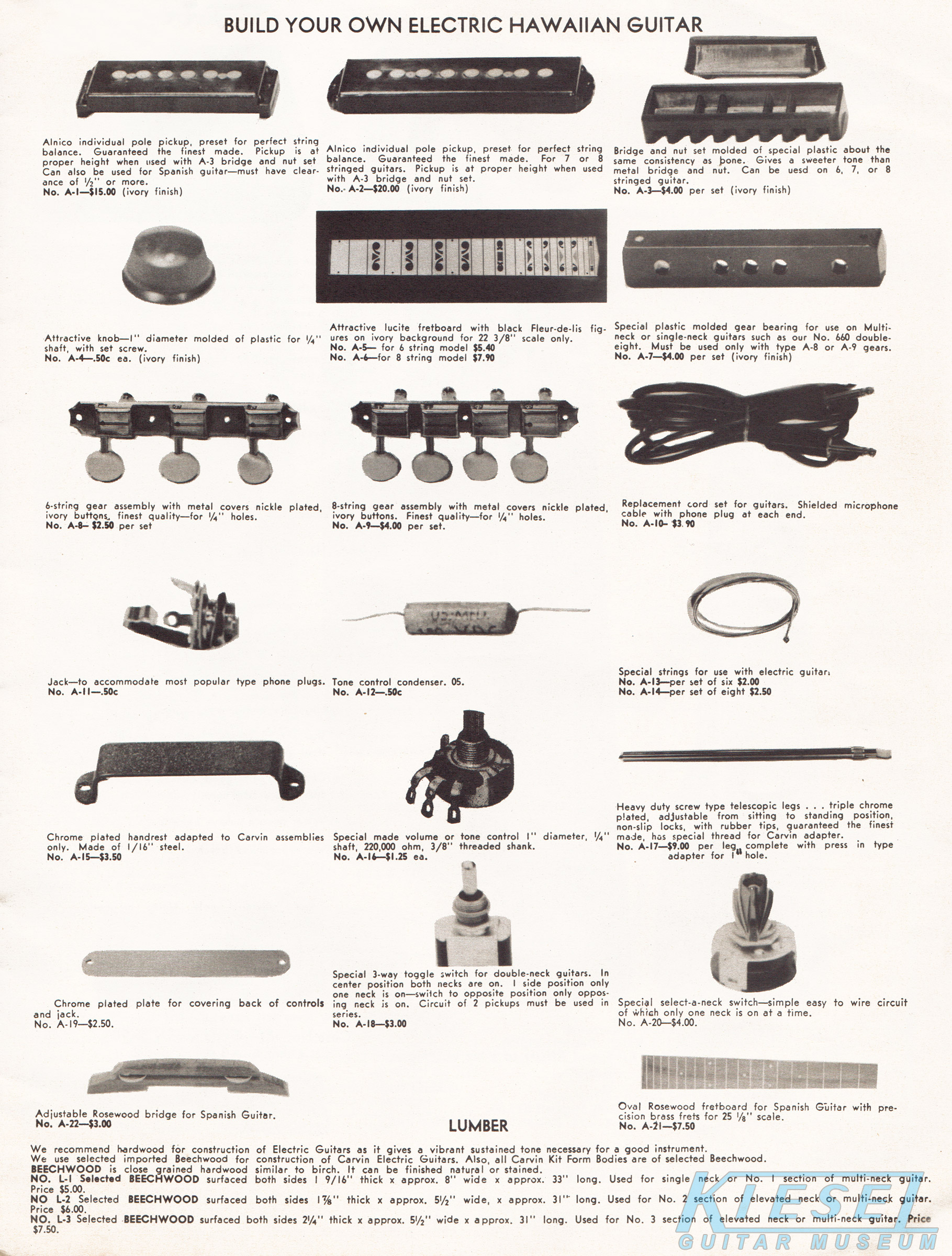 Carvin offered an assortment of parts so hobbyists could build their own guitars. You could order just about everything you needed for a Hawaiian lap steel guitar, including a beech body. There were also basic parts for "Spanish" guitars offered, including oval rosewood fingerboards and bridges. An assortment of DeArmond acoustic transducer pickups and other accessories were available in 1954, including the Rhythm Chief. Various DeArmond gear would be featured in Carvin catalogs throughout the 1950s and 1960s. Other add-on acoustic transducer electric pickups for acoustic guitars were featured, including the the Model 3 AT, which was was used on instruments with an F-hole, and the Model 2 RH was used on instruments with a round soundhole.