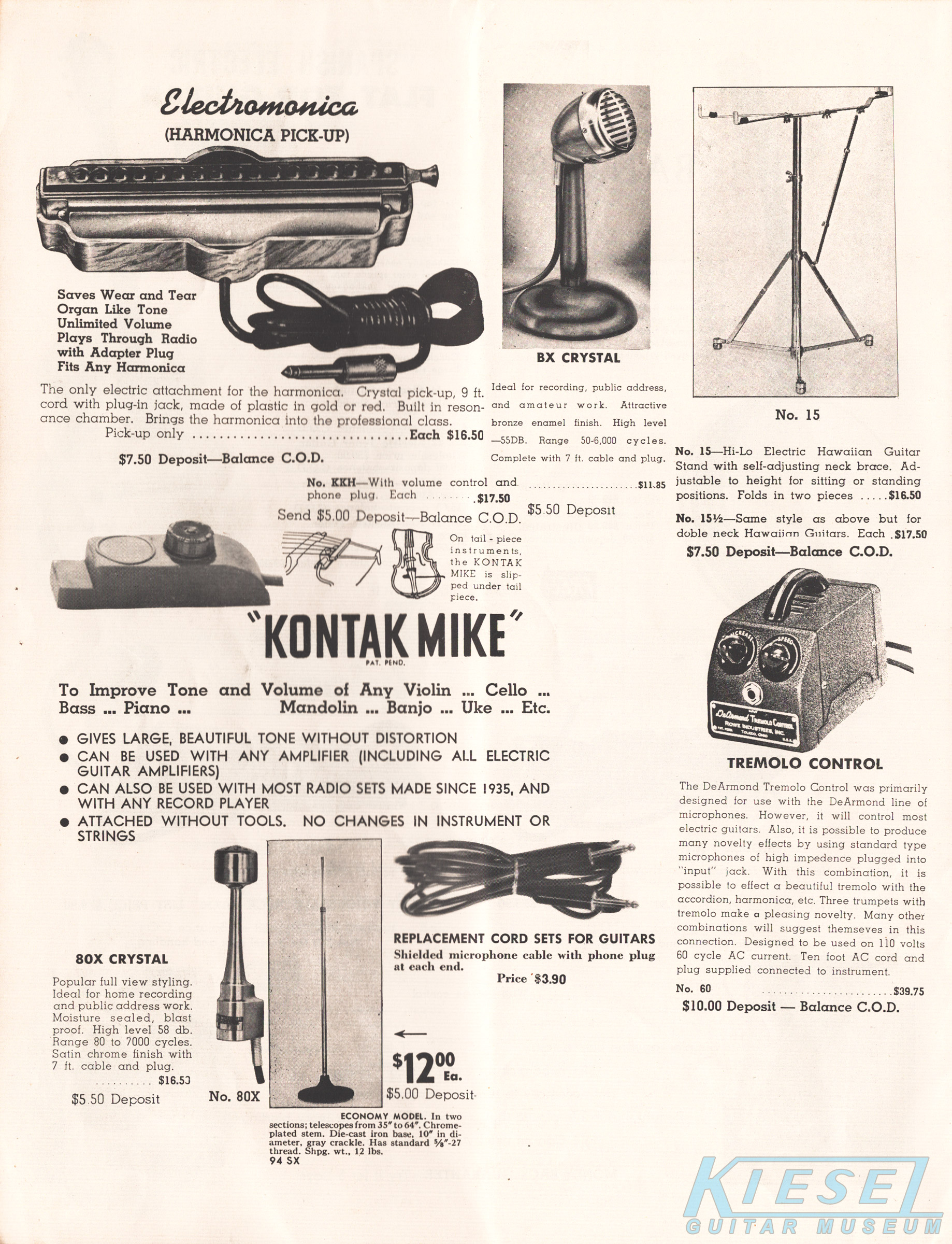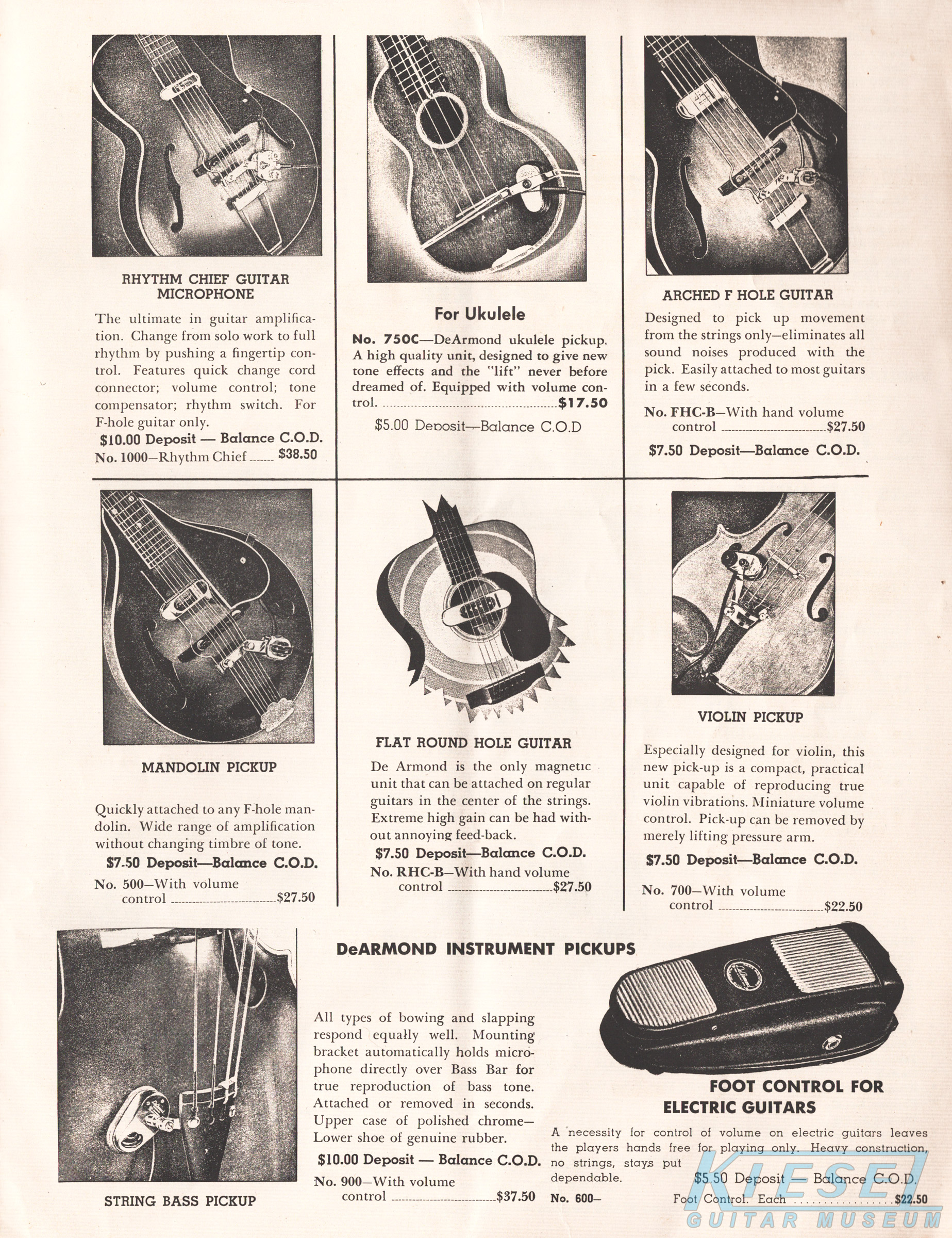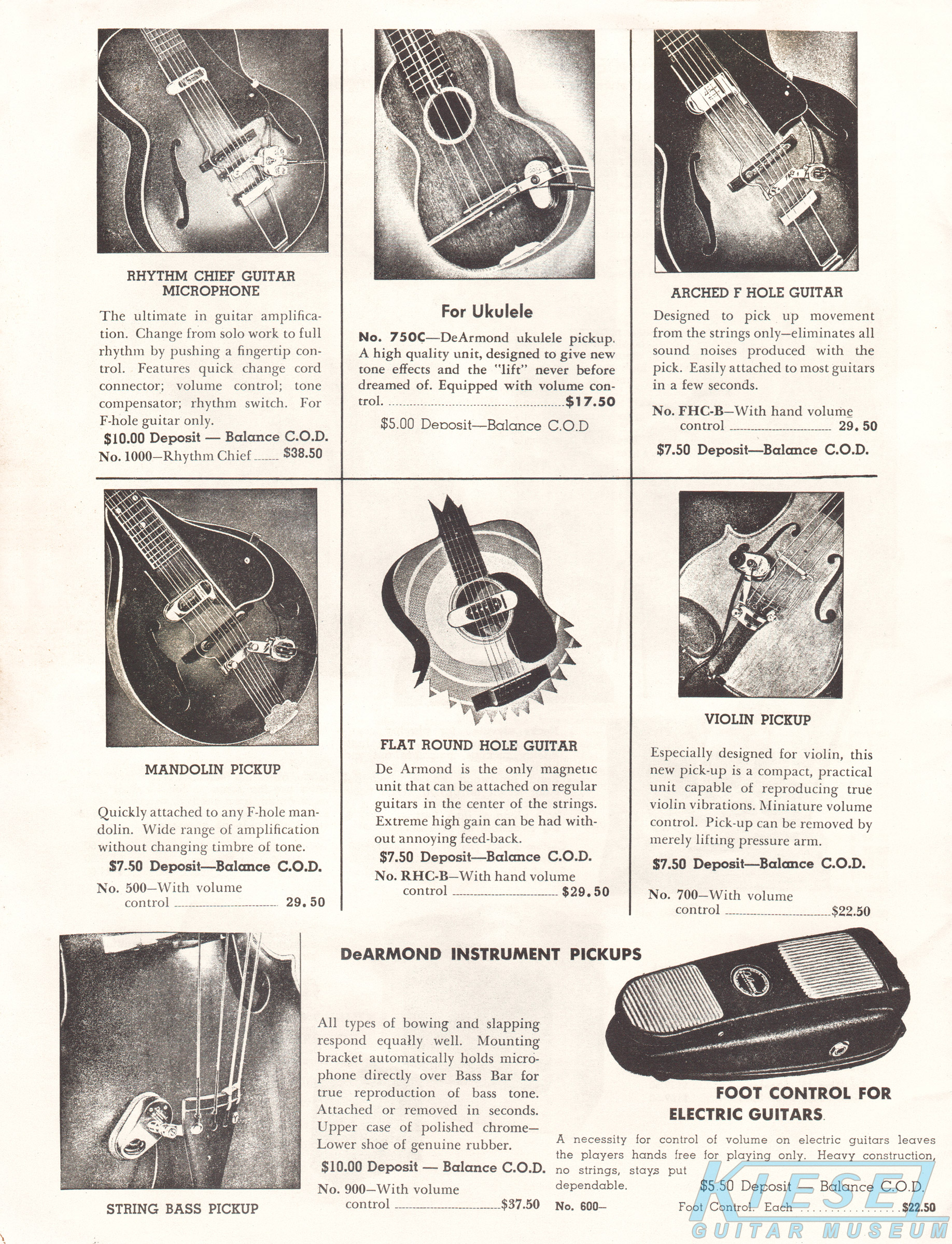 Carvin offered an assortment of parts so hobbyists could build their own guitars. You could order just about everything you needed for a Hawaiian lap steel guitar, including a beech body. There were also basic parts for "Spanish" guitars offered, including oval rosewood fingerboards and bridges. An assortment of DeArmond acoustic transducer pickups and other accessories were available in 1954, including the Rhythm Chief. Various DeArmond gear would be featured in Carvin catalogs throughout the 1950s and 1960s. Other add-on acoustic transducer electric pickups for acoustic guitars were featured, including the the Model 3 AT, which was was used on instruments with an F-hole, and the Model 2 RH was used on instruments with a round soundhole.
