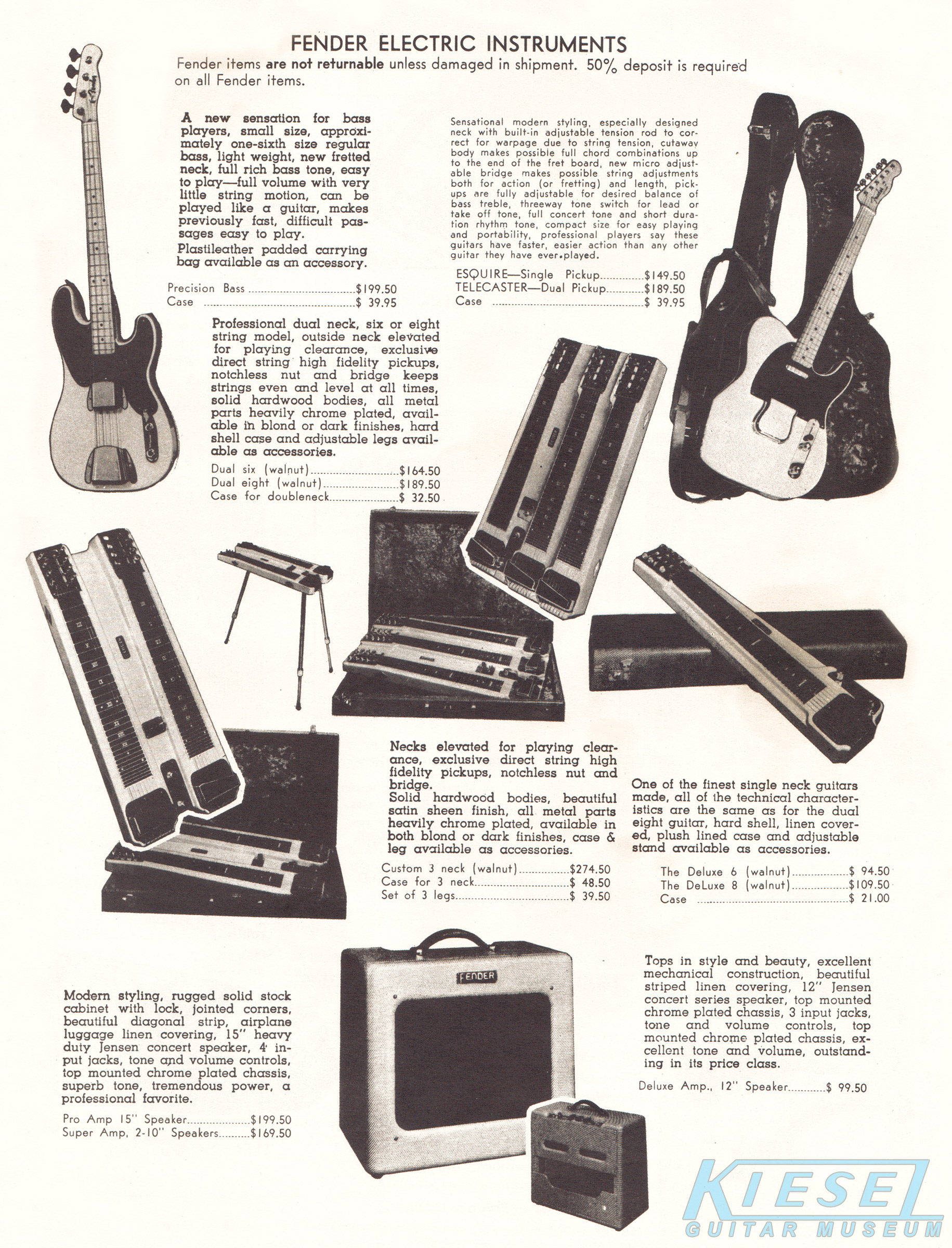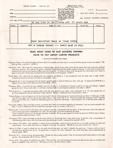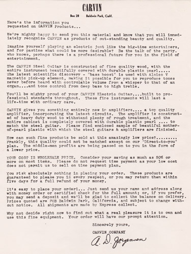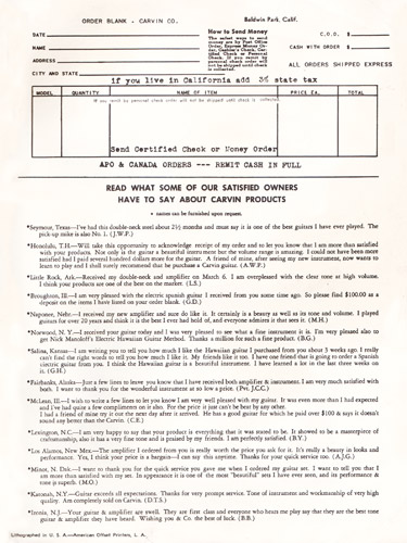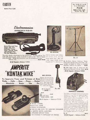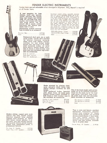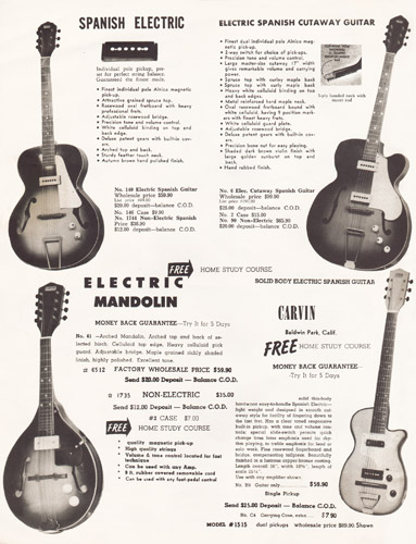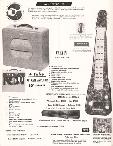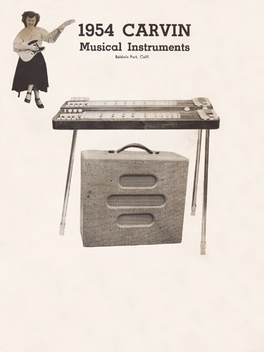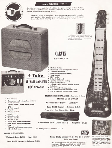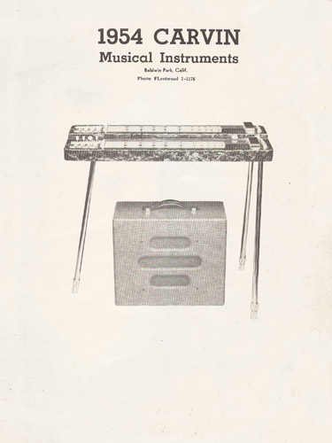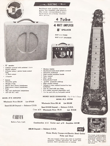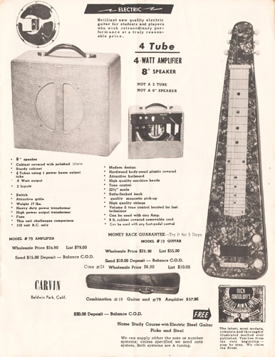 In 1954, you could buy an electric bass from Carvin, but it would say "Fender" on the headstock. Early in Carvin's history, they were authorized resellers for a number of other manufacturers, including Fender, Martin and DeArmond. In this case, Carvin offered a now-cherished Precision Bass, in natural finish with maple neck and black pickguard. This bass sold for $199.50, and a Fender hardshell case was an additional $39.95. Other Fender products offered in the Carvn catalog included the Telecaster and Esquire electric guitars (the Esquire was a single-pickup Tele) for the princely sum of $189.50 and 149.50, respectively. A variety of Fender single neck, double neck and triple neck steel guitars were also available, as were a couple of early Fender amplifiers.