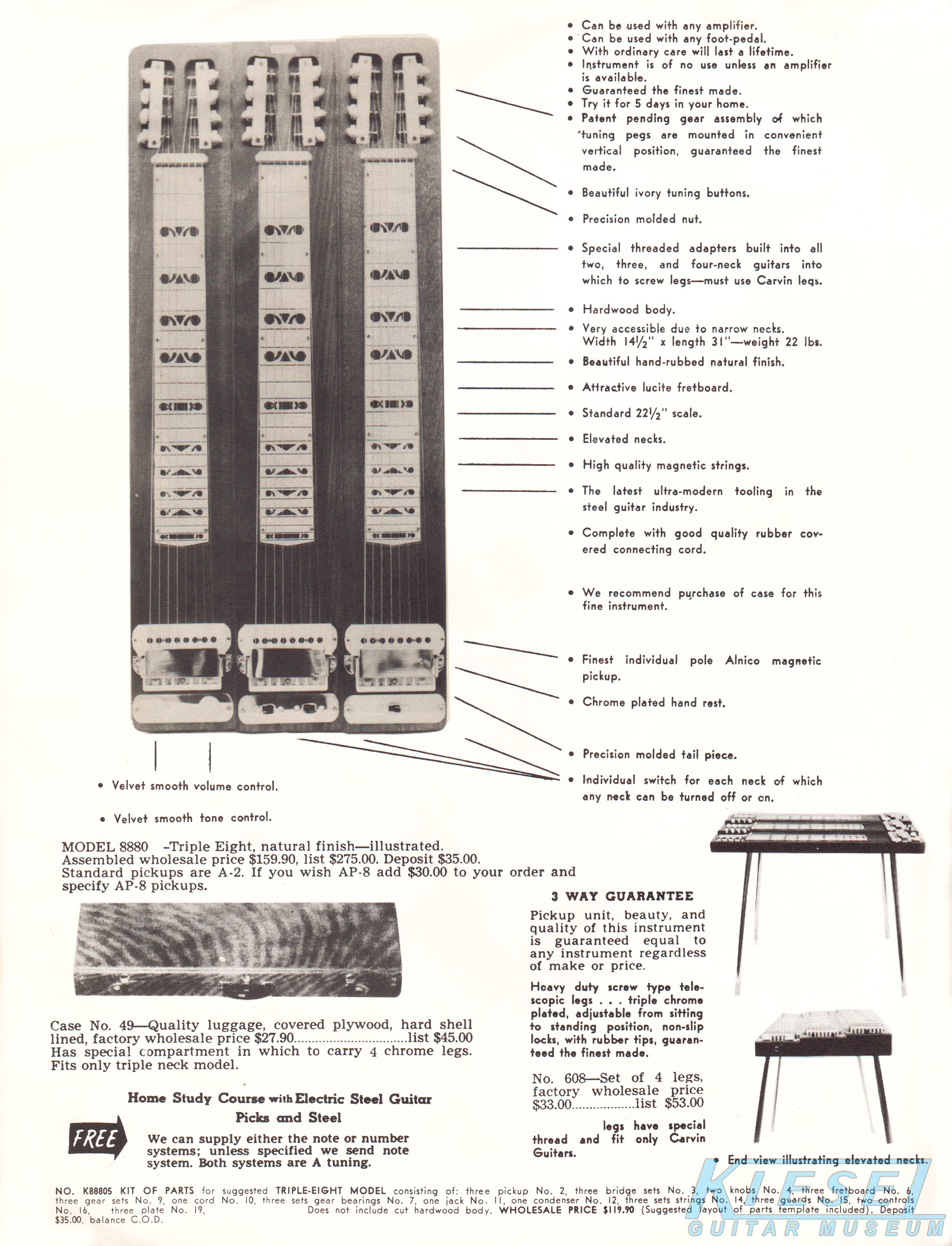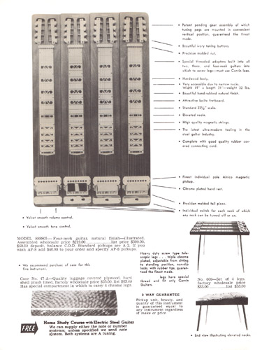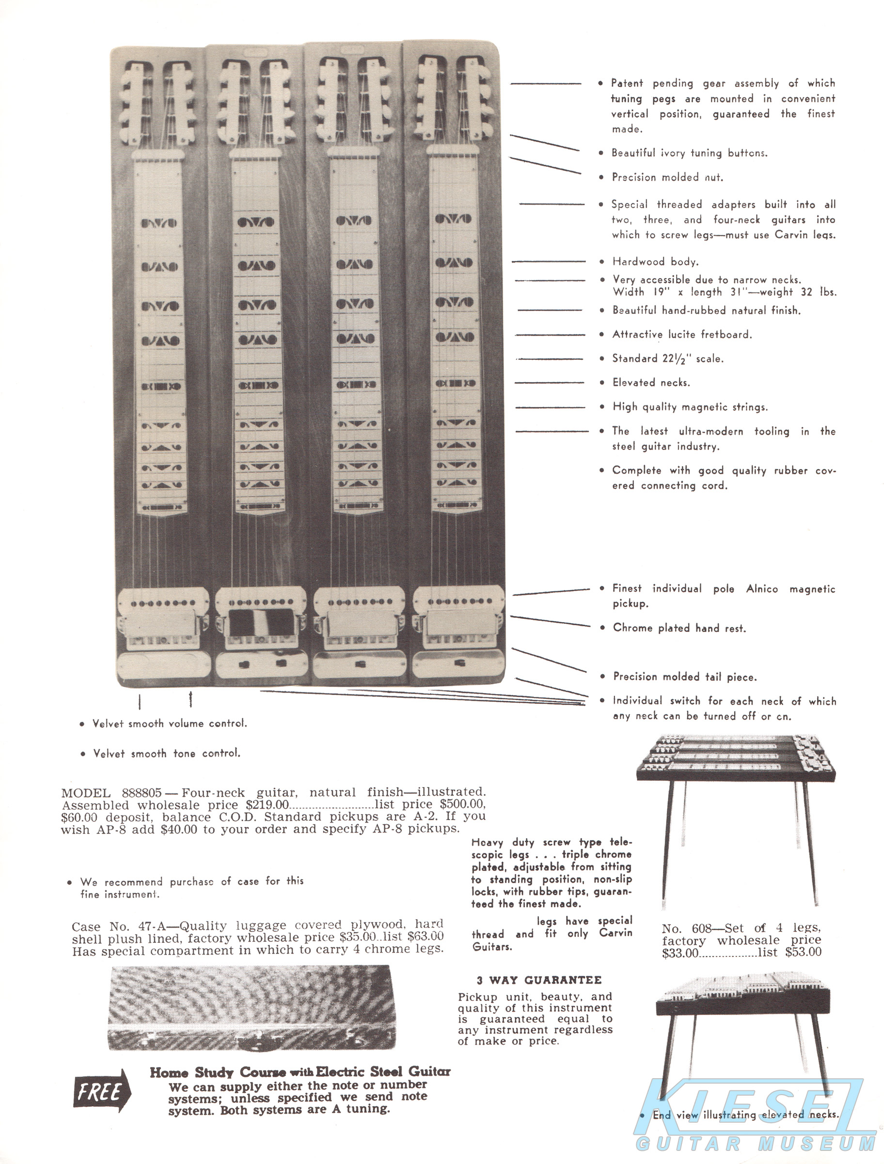 Carvin offered an assortment of double-, triple-, and quad-neck steel guitars in 1954, in 6 and 8 string variations. All models had beech bodies with Lucite fingerboards, and A-Series non-adjustable pickups standard. The tuner buttons were ivory, and the hardware was chrome. The doubleneck models had top-mounted volume and tone controls and a 3-way neck selector, while the tripleneck and quad-neck models had side-mounted master volume and tone controls and on/off switches for each neck. The 6-string Model #6605 sold for $89.90, and the 8-string Model #8805 sold for $119.90. The Model #8880 tripleneck sold for $159.90, and the Model #888805 quad-neck sold for $219.00. All models were available with upgraded AP-Series adjustable pickups, and options such as screw-in legs and cases were offered. The double- and tripleneck models were also offered in kit form, with all components except the body.