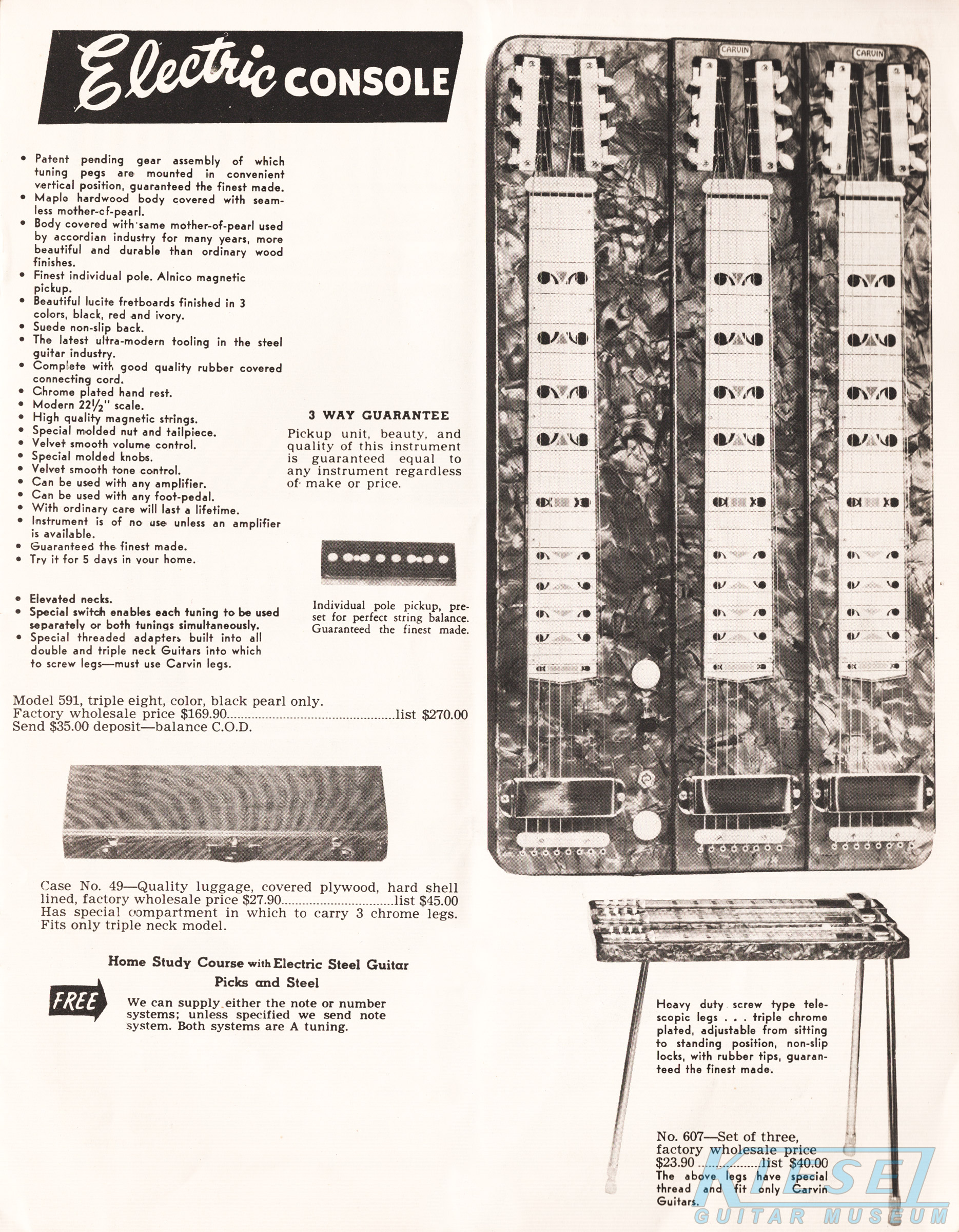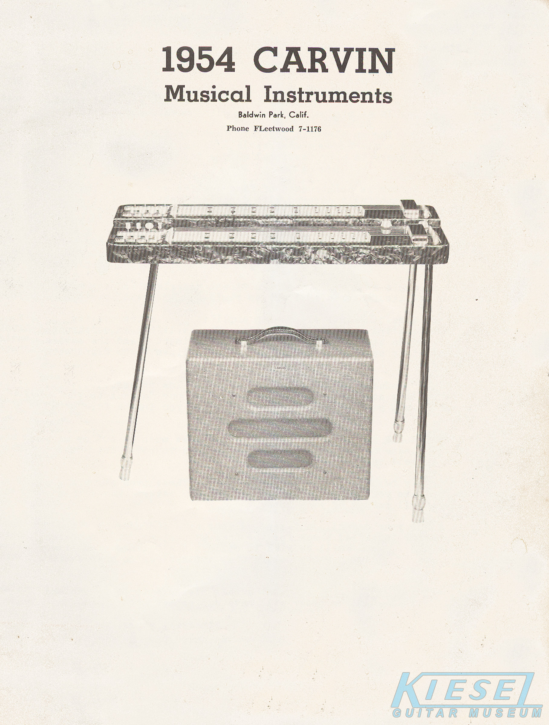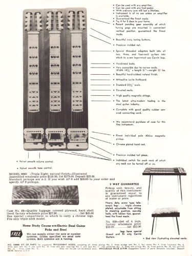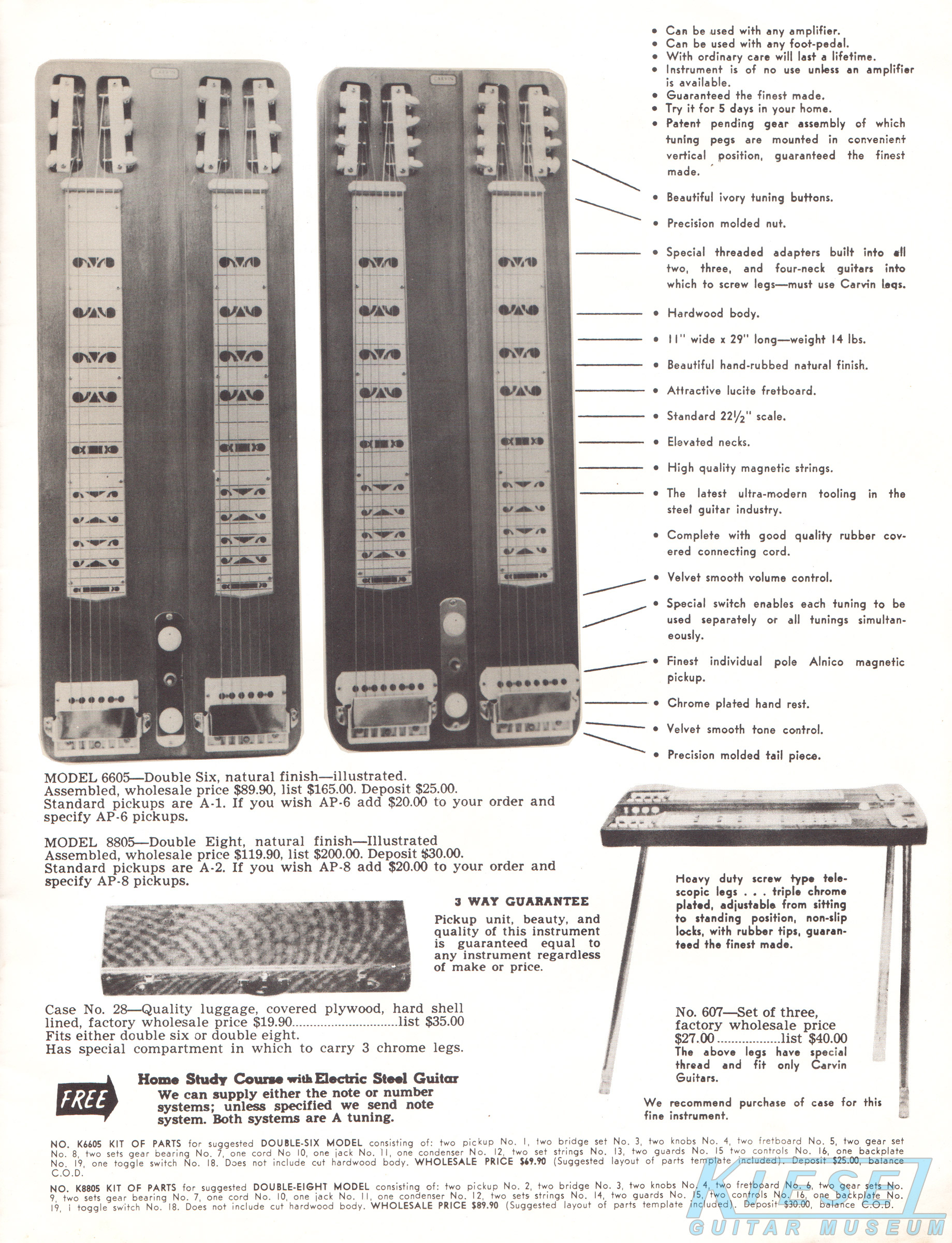 Carvin offered an assortment of double-, triple-, and quad-neck steel guitars in 1954, in 6 and 8 string variations. All models had beech bodies with Lucite fingerboards, and A-Series non-adjustable pickups standard. The tuner buttons were ivory, and the hardware was chrome. The doubleneck models had top-mounted volume and tone controls and a 3-way neck selector, while the tripleneck and quad-neck models had side-mounted master volume and tone controls and on/off switches for each neck. The 6-string Model #6605 sold for $89.90, and the 8-string Model #8805 sold for $119.90. The Model #8880 tripleneck sold for $159.90, and the Model #888805 quad-neck sold for $219.00. All models were available with upgraded AP-Series adjustable pickups, and options such as screw-in legs and cases were offered. The double- and tripleneck models were also offered in kit form, with all components except the body.