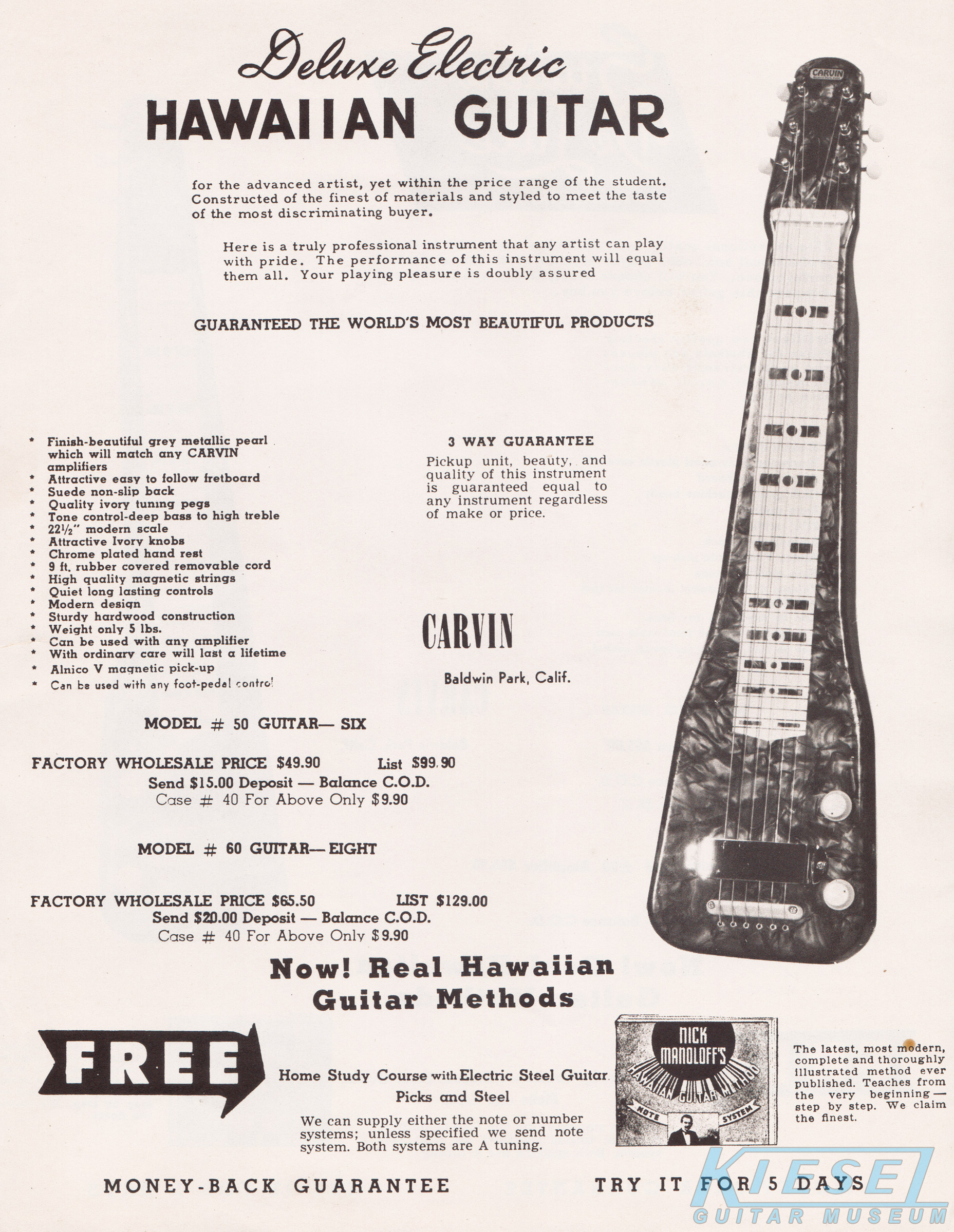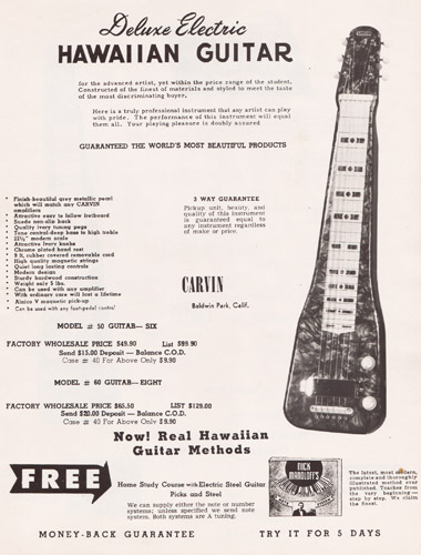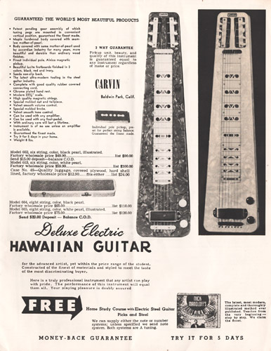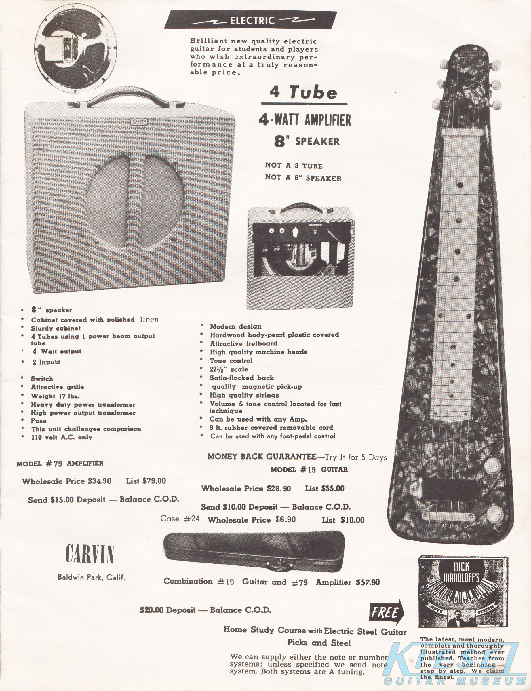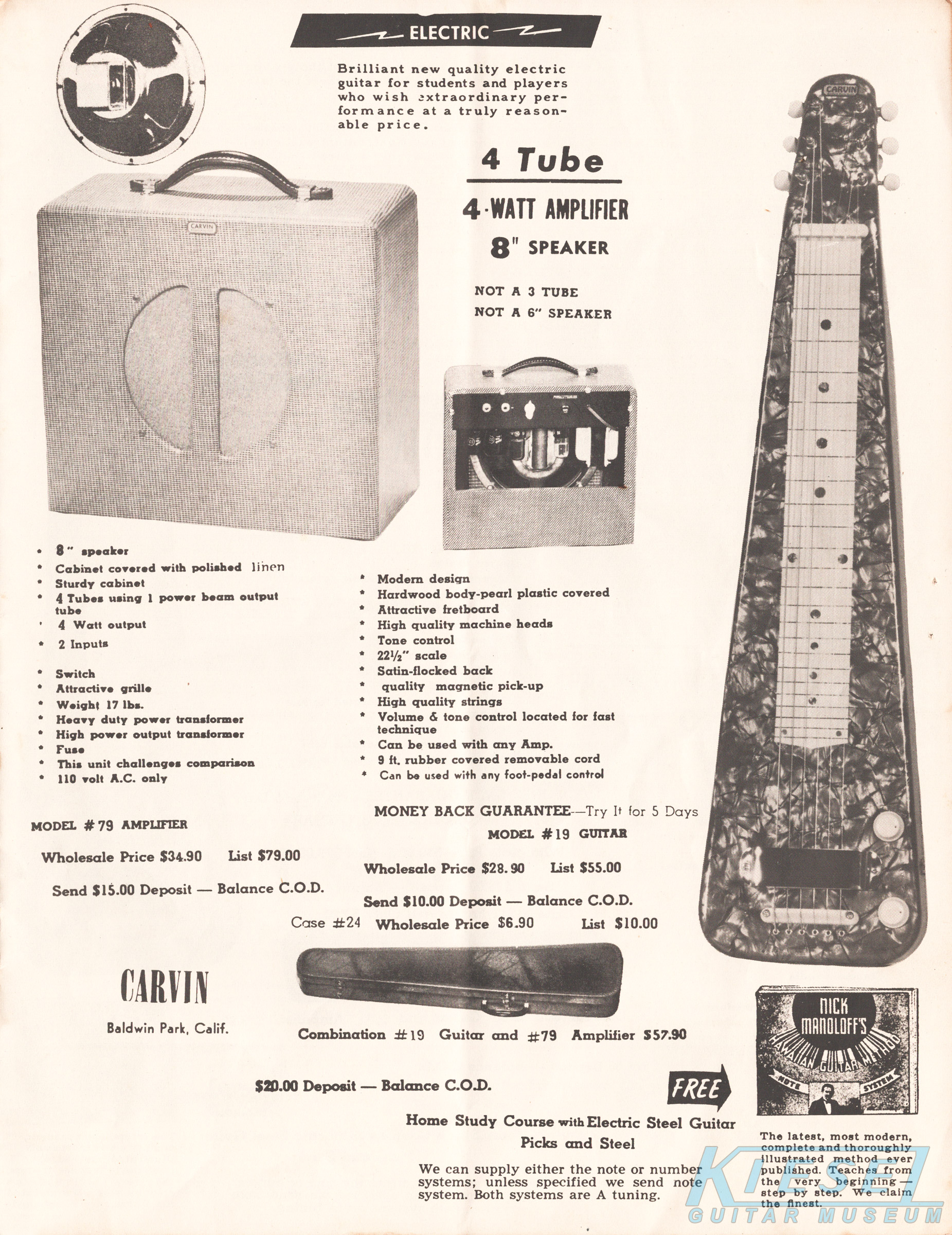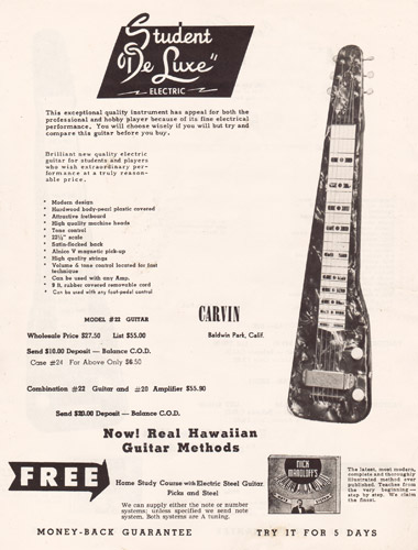 In the 1950s, Carvin offered more steel guitar models than the then-new electric guitars that were taking the music business by storm. The Model #19 lap steel guitar was a basic lap steel, with a plastic covered hardwood body, and a 22 1/2" scale fingerboard that was probably some type of plastic. Other features included a single pickup with chrome plated cover and single volume and tone controls. The Model #19 sold for $28.90, and the optional case was $6.90. The Model #50 lap steel was similar in physical size to the Model #19, and also had a 22 1/2" scale fingerboard, but the body was more sculpted, and the fingerboard inlays were more elaborate. The pickup, electronics and hardware were the same as the Model #19. The Model #50 sold for $39.00, and the case was $7.90.