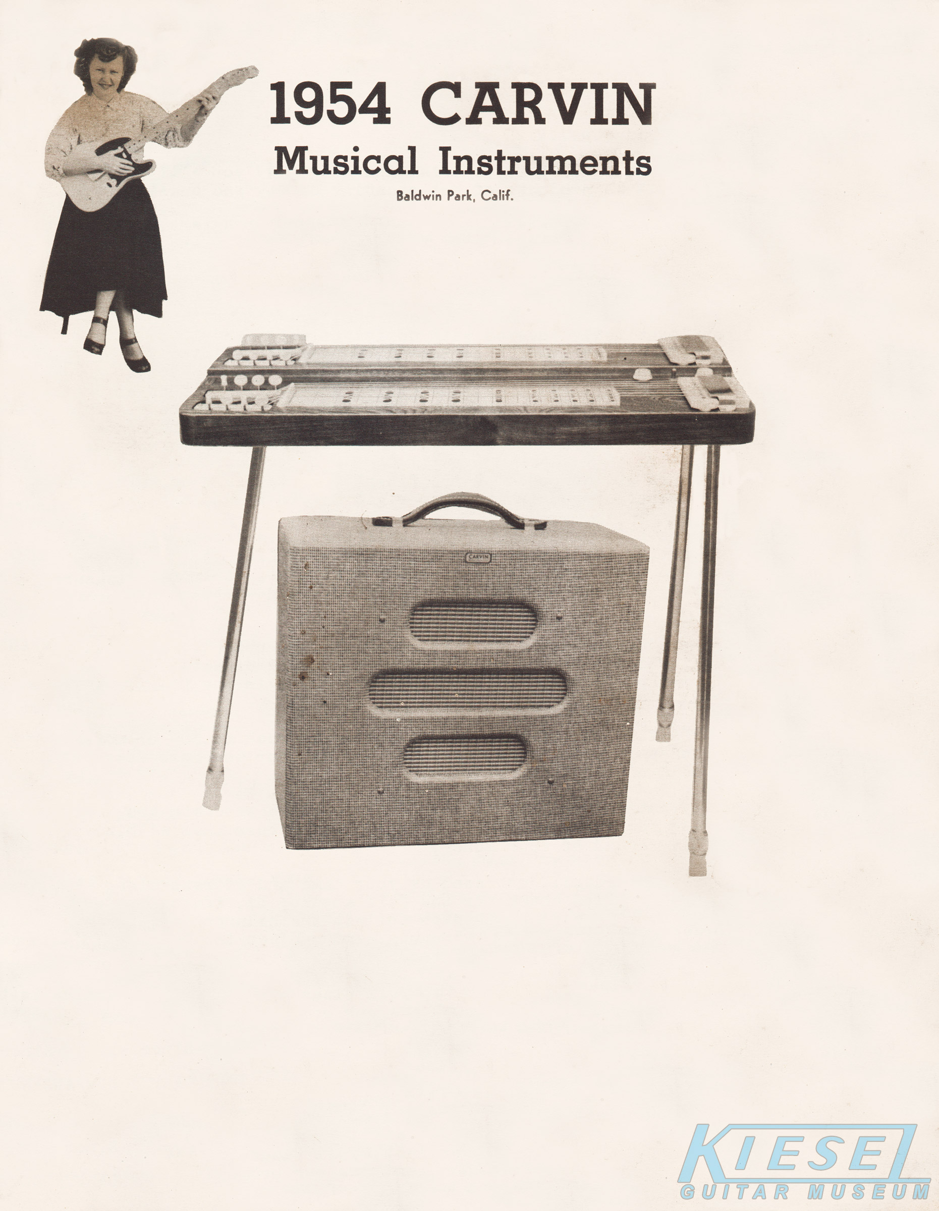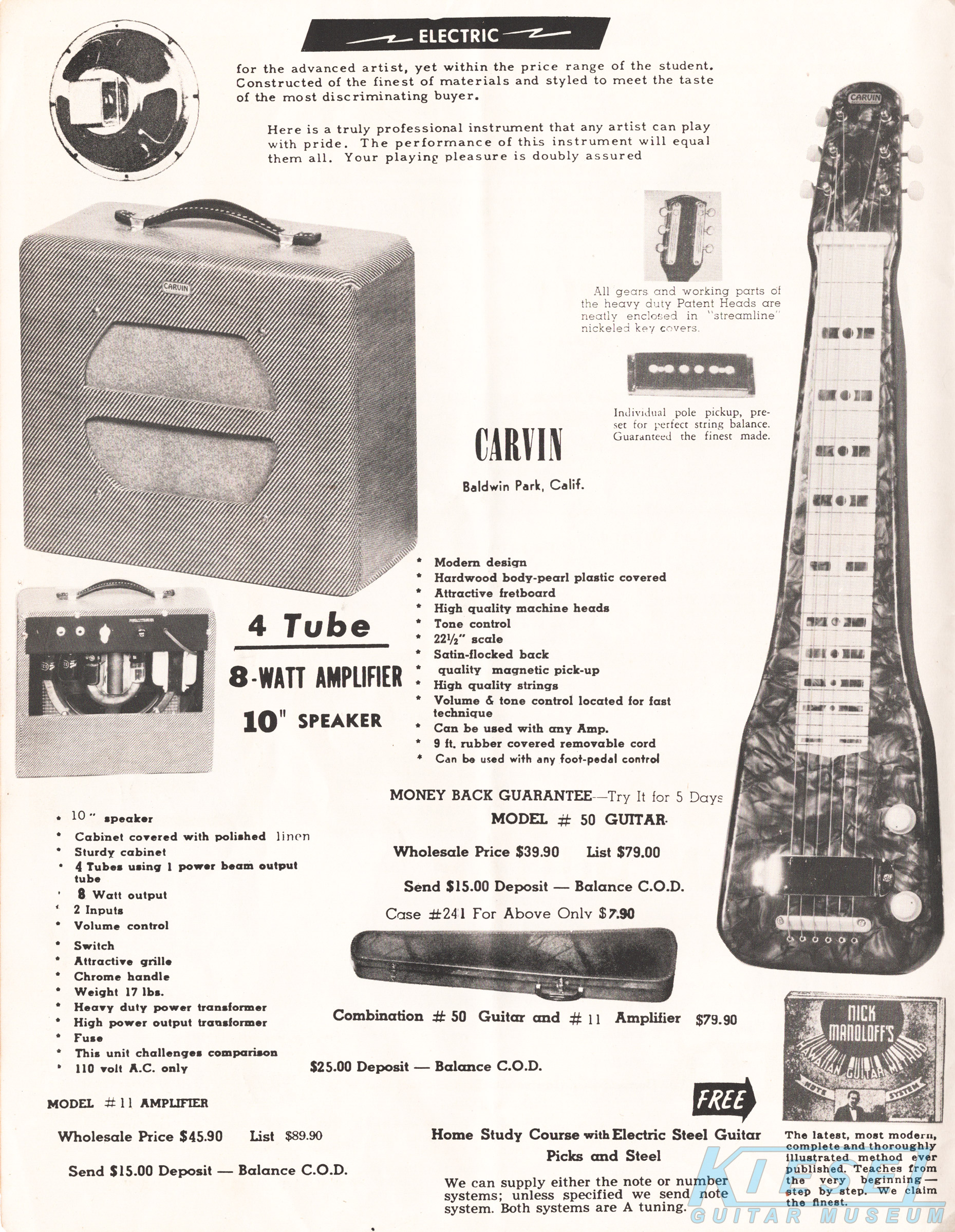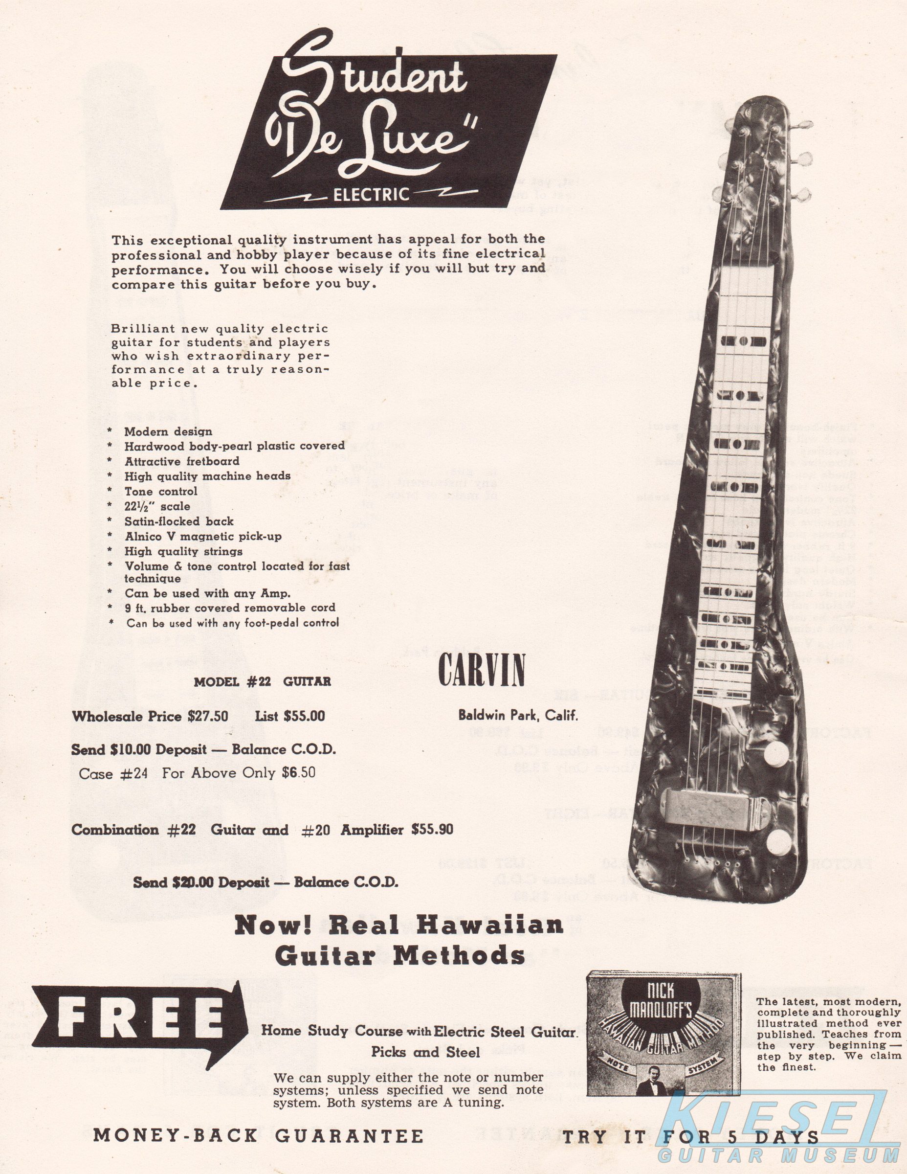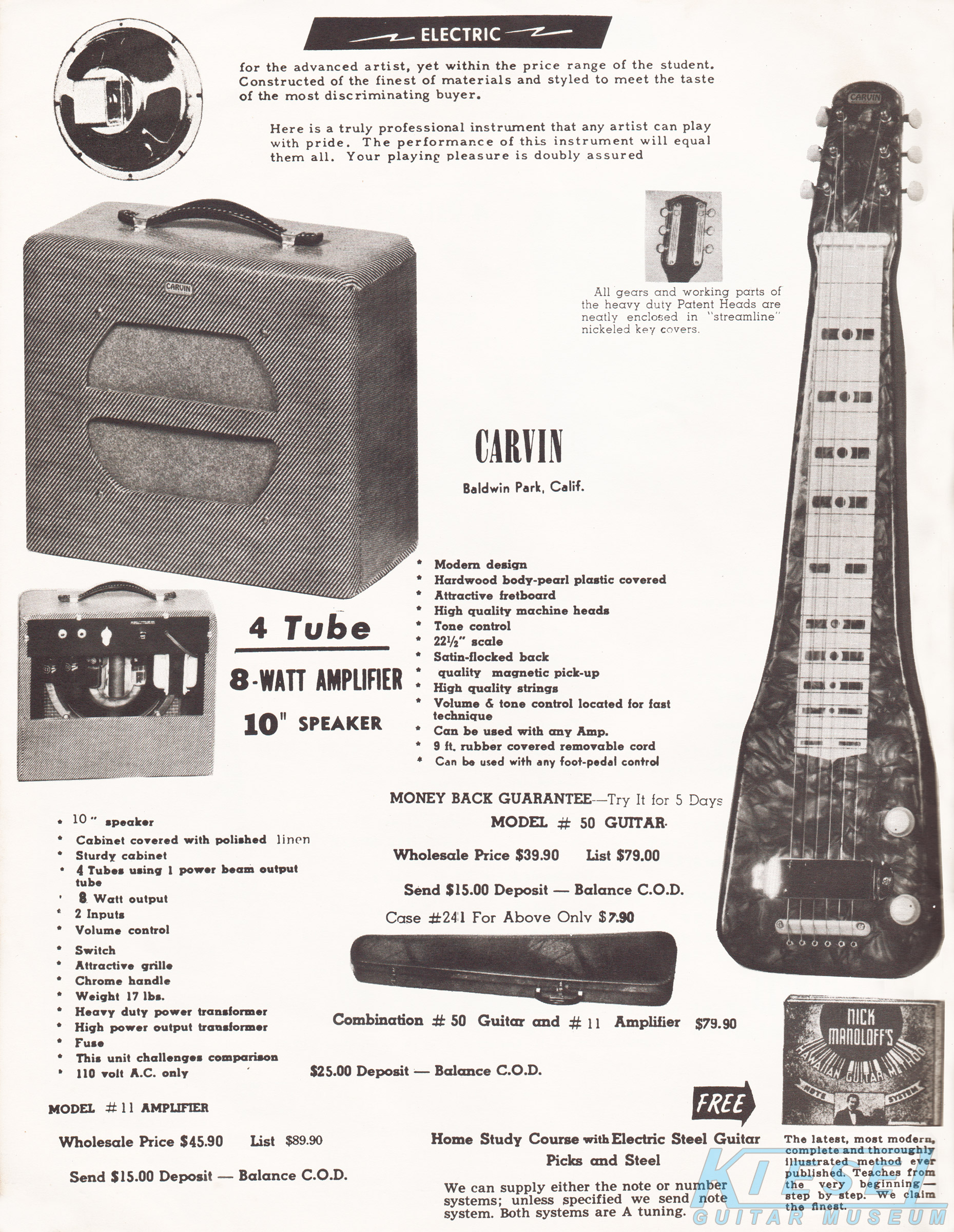 In the 1950s, Carvin offered more steel guitar models than the then-new electric guitars that were taking the music business by storm. The Model #19 lap steel guitar was a basic lap steel, with a plastic covered hardwood body, and a 22 1/2" scale fingerboard that was probably some type of plastic. Other features included a single pickup with chrome plated cover and single volume and tone controls. The Model #19 sold for $28.90, and the optional case was $6.90. The Model #50 lap steel was similar in physical size to the Model #19, and also had a 22 1/2" scale fingerboard, but the body was more sculpted, and the fingerboard inlays were more elaborate. The pickup, electronics and hardware were the same as the Model #19. The Model #50 sold for $39.00, and the case was $7.90.
