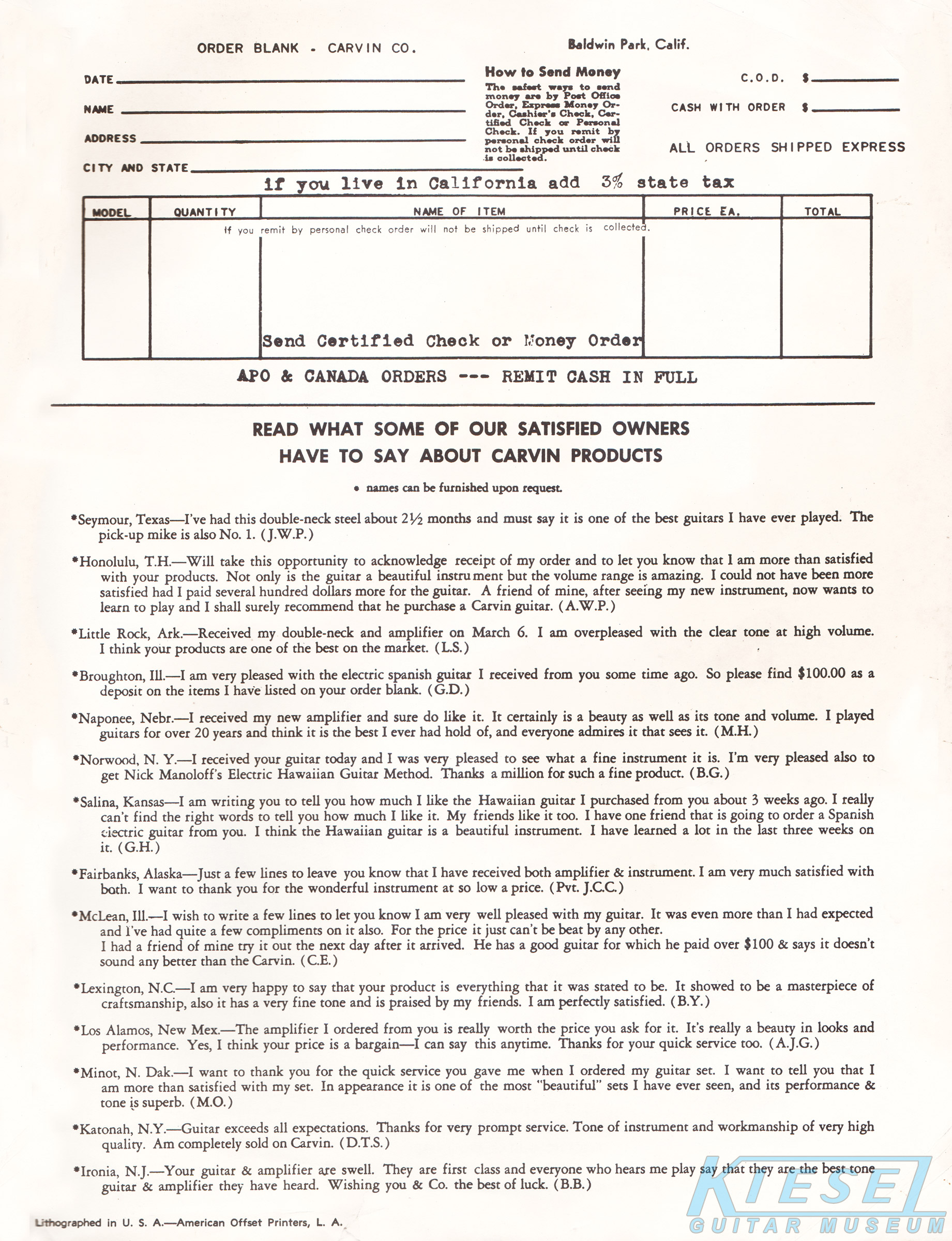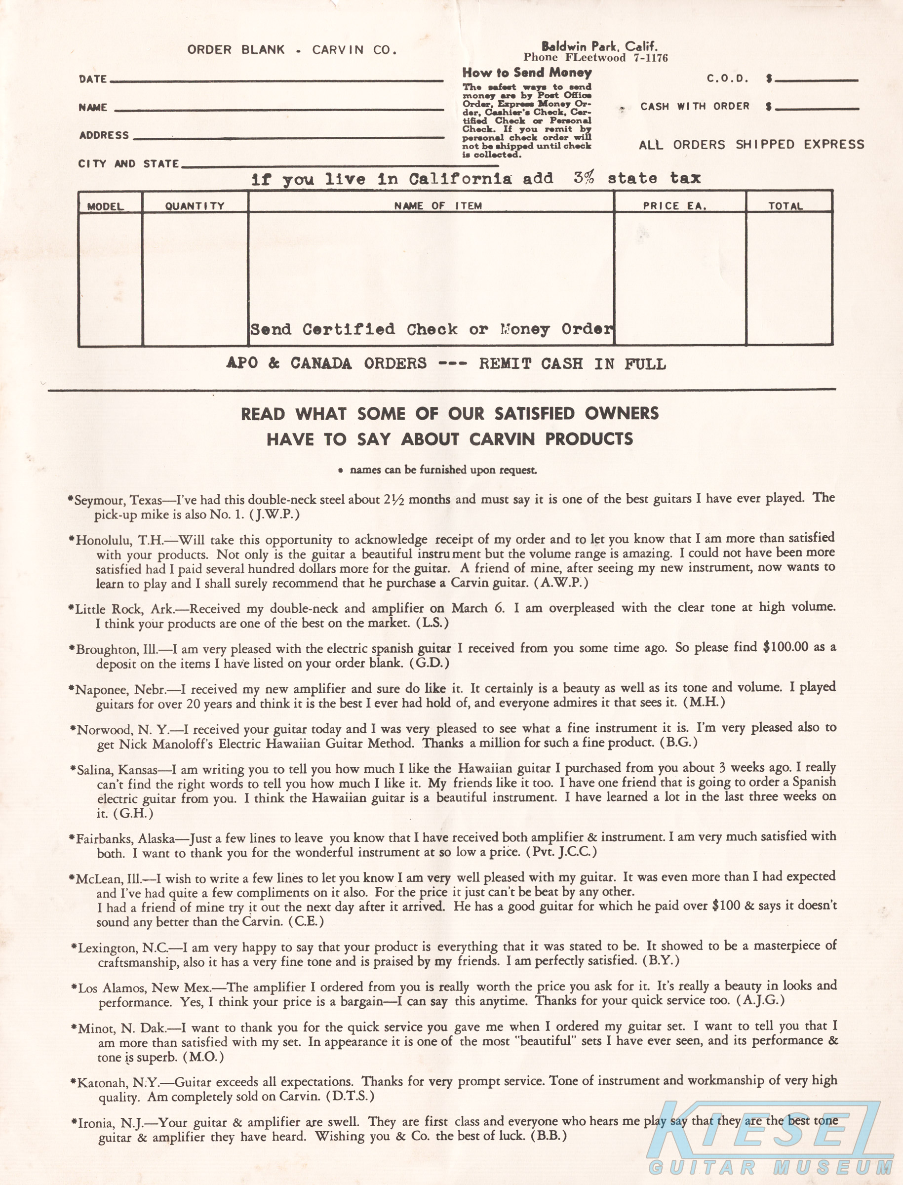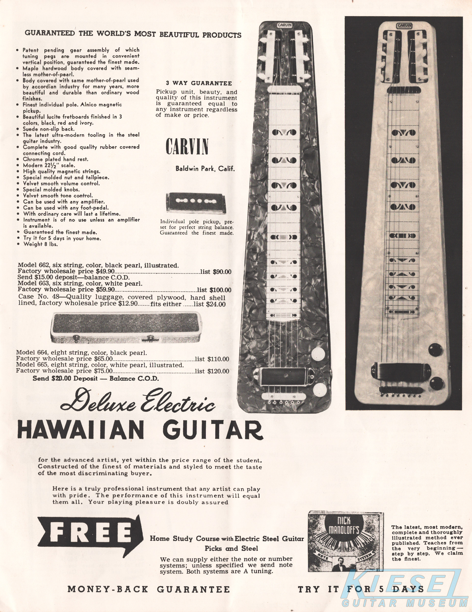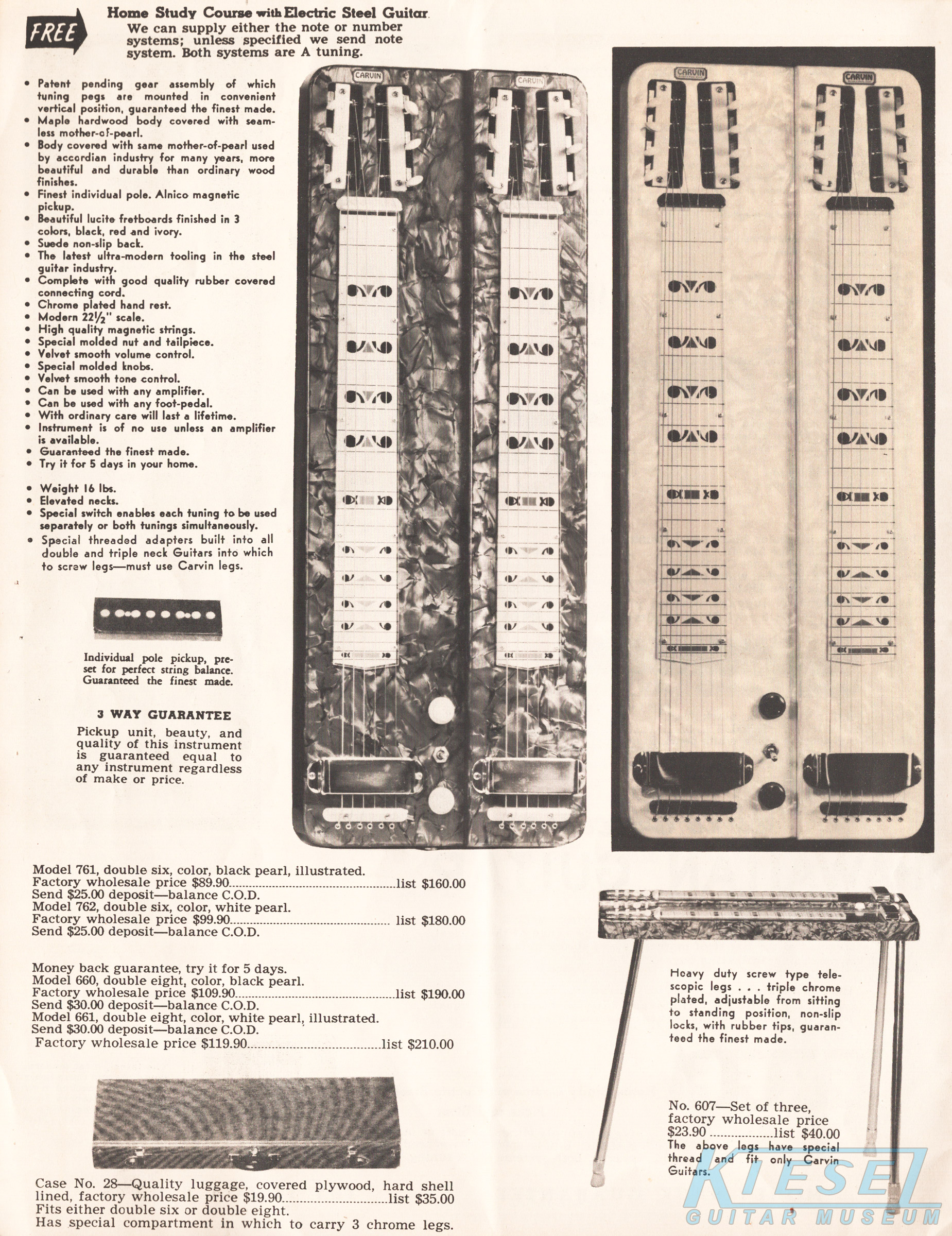 In the 1950s, Carvin offered more steel guitar models than the then-new electric guitars that were taking the music business by storm. The Model #19 lap steel guitar was a basic lap steel, with a plastic covered hardwood body, and a 22 1/2" scale fingerboard that was probably some type of plastic. Other features included a single pickup with chrome plated cover and single volume and tone controls. The Model #19 sold for $28.90, and the optional case was $6.90. The Model #50 lap steel was similar in physical size to the Model #19, and also had a 22 1/2" scale fingerboard, but the body was more sculpted, and the fingerboard inlays were more elaborate. The pickup, electronics and hardware were the same as the Model #19. The Model #50 sold for $39.00, and the case was $7.90.