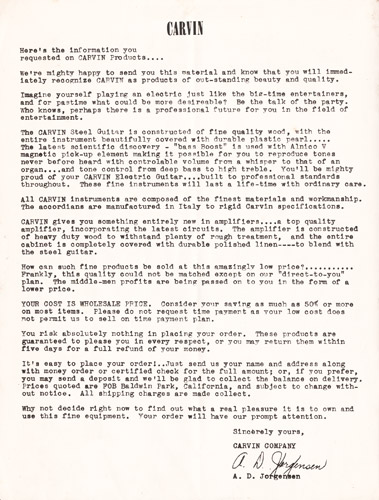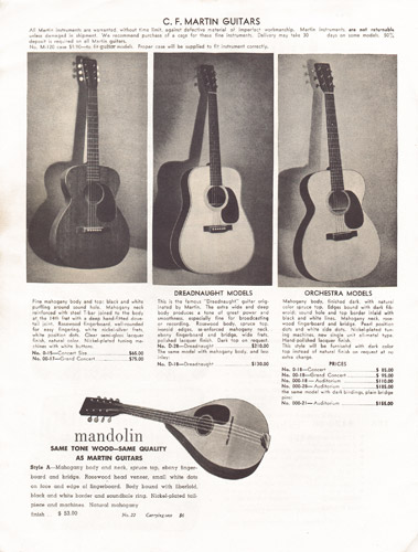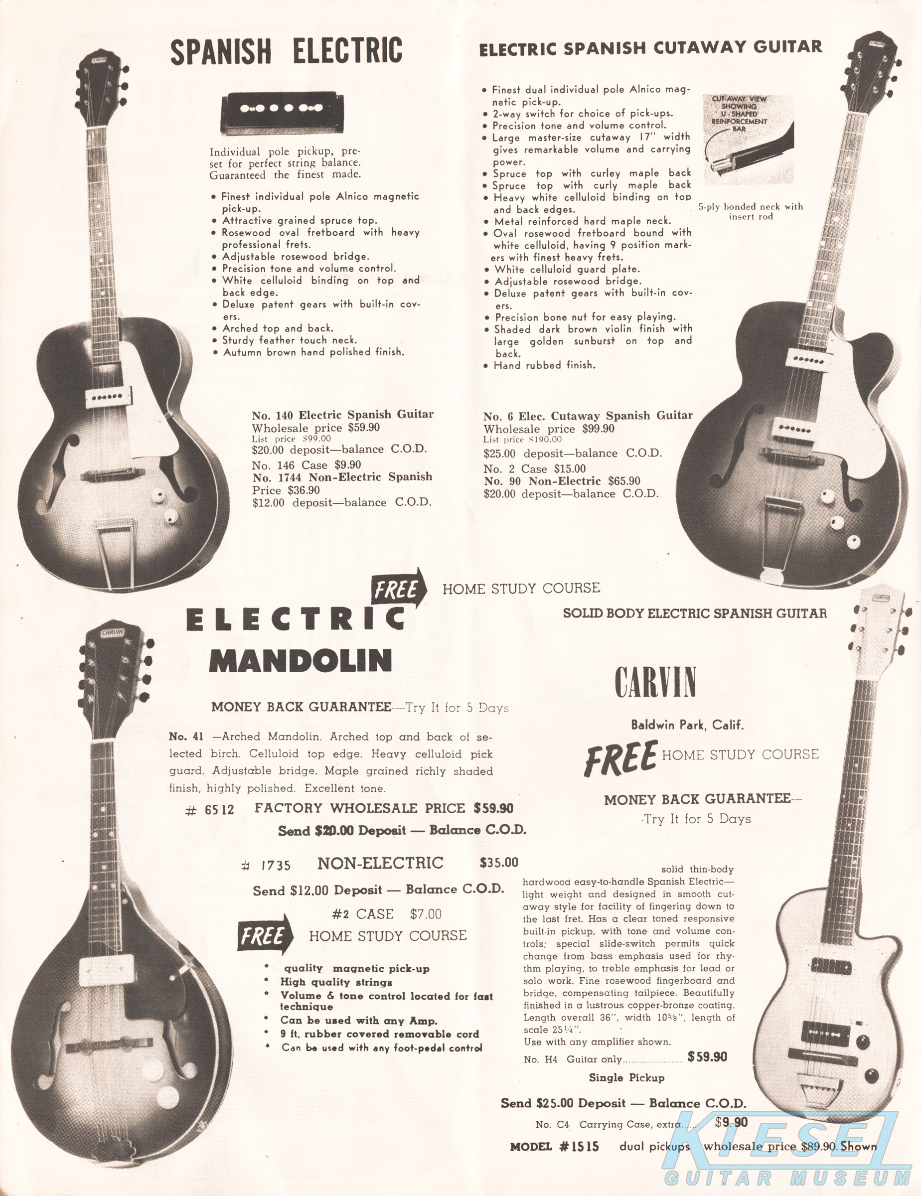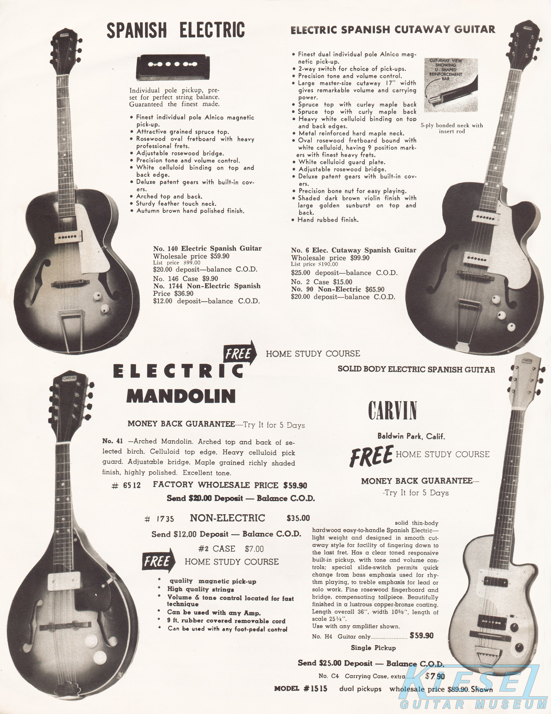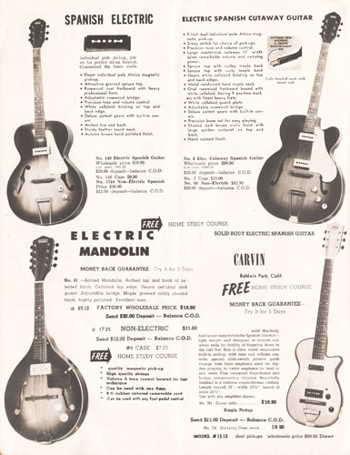 Martin guitars were also sold in the Carvin catalog, in a number of different models in concert, grand concert, dreadnaught and auditorium sizes. Prices ranged from $65.00 for the #0-15 Concert Guitar to $210.00 for the #D-28 Dreadnaught.