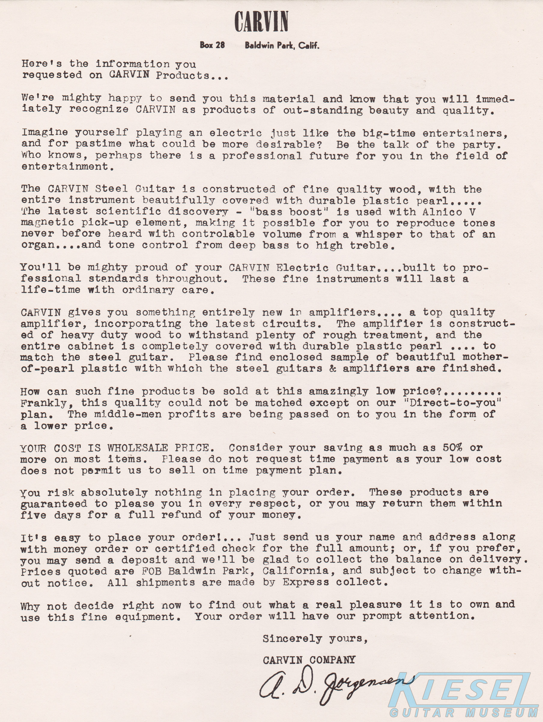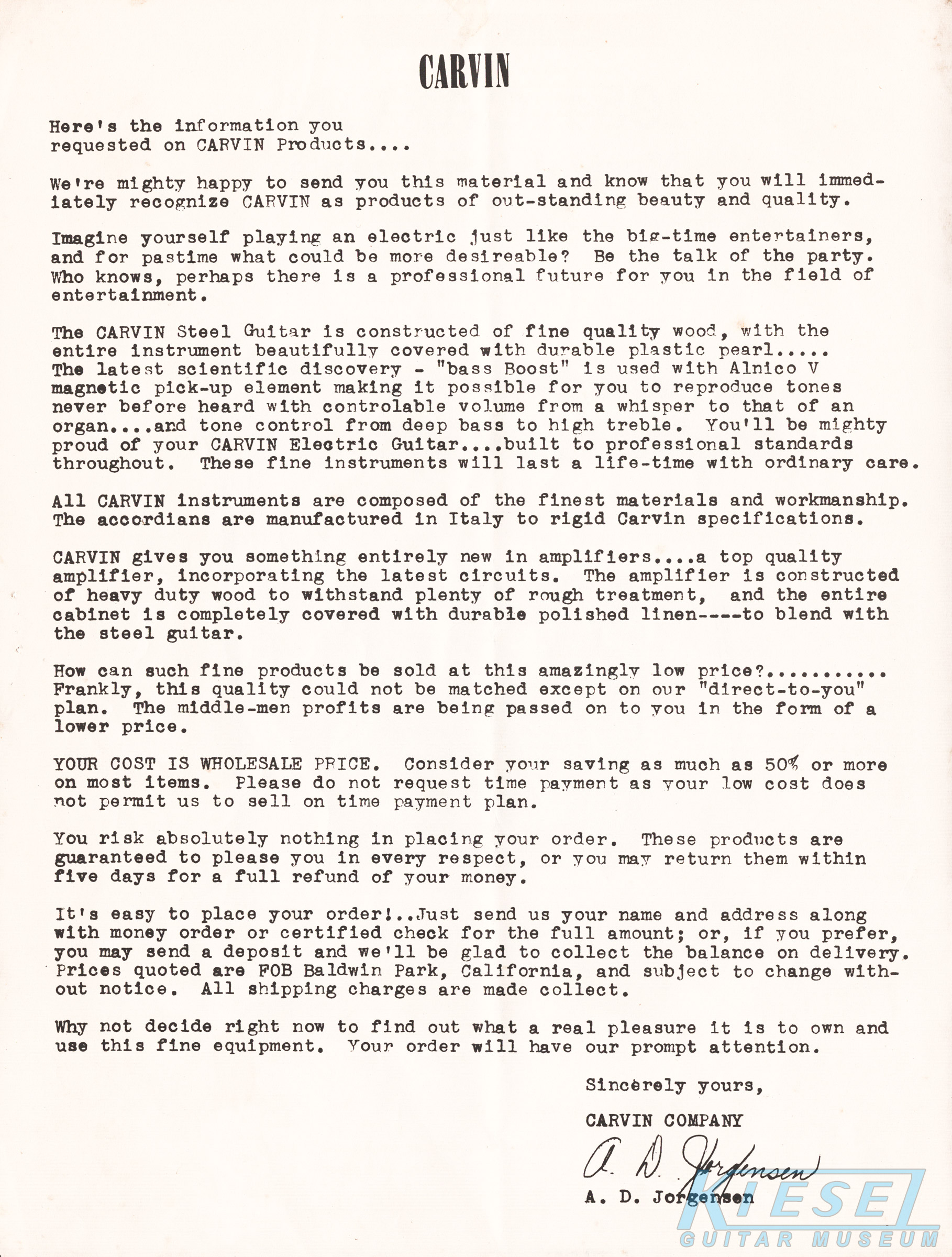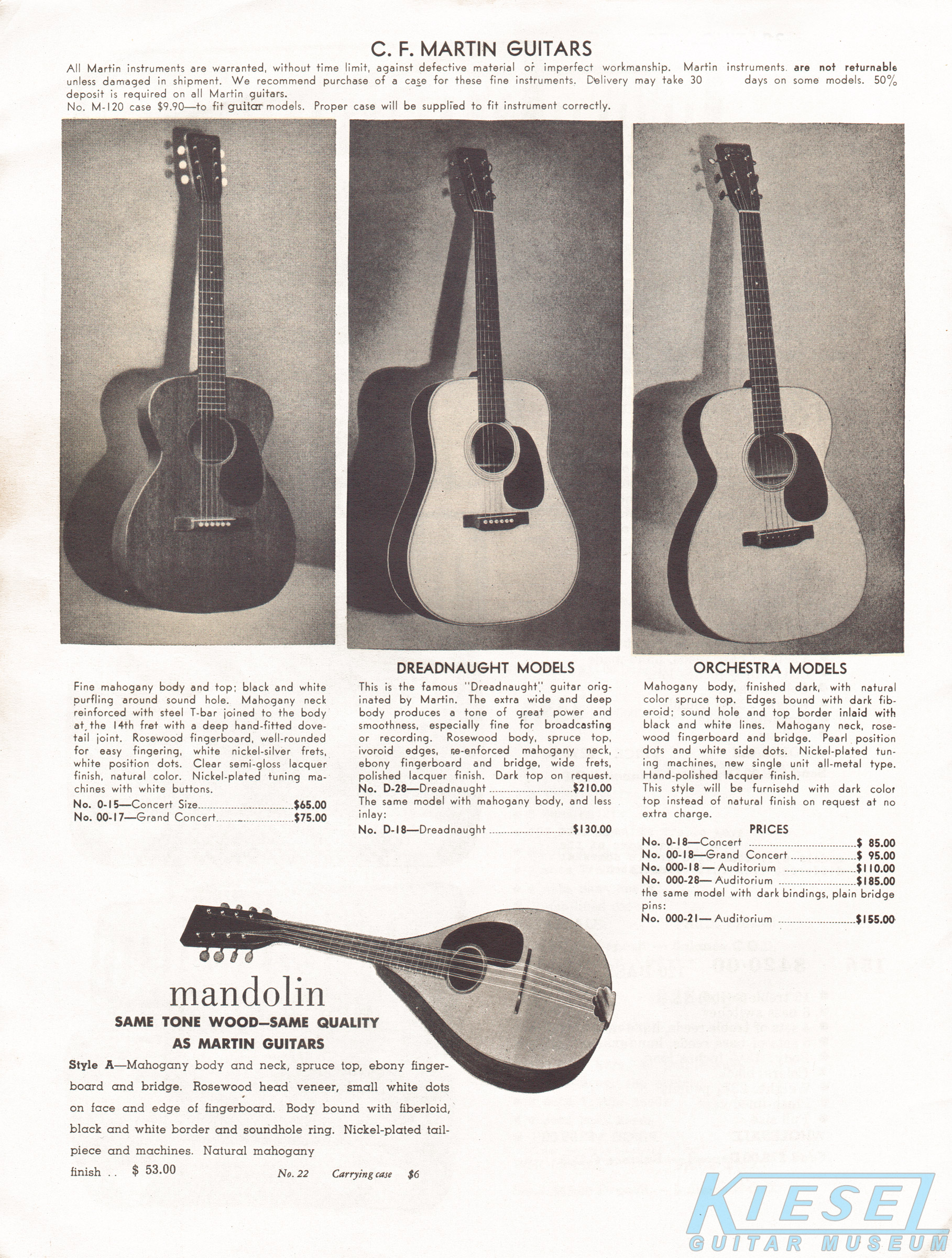 Martin guitars were also sold in the Carvin catalog, in a number of different models in concert, grand concert, dreadnaught and auditorium sizes. Prices ranged from $65.00 for the #0-15 Concert Guitar to $210.00 for the #D-28 Dreadnaught.