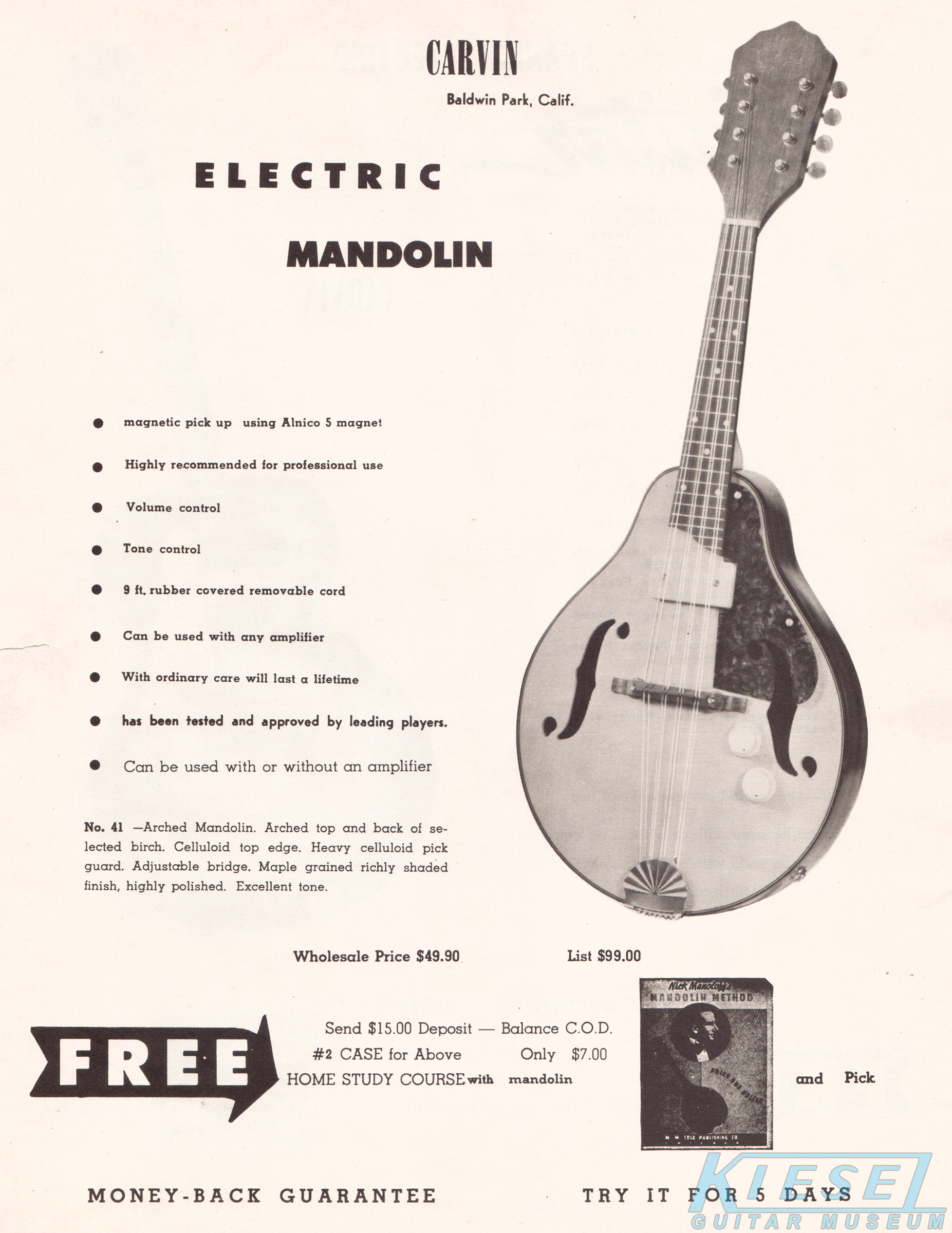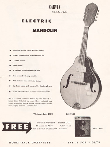 Carvin sold mandolins and even banjos throughout the fifties. The Model 6512 electric mandolin was constructed with an arched birch front and back, celluloid binding and pickguard and had a gloss finish. It was equipped with a single pickup, with volume and tone controls. This instrument sold for $59.90, and the Model 1735 non-electric mandolin sold for $35.00. Case for either was $7.00. The Model 504T tenor banjo, which had a curly maple body with resonator and rosewood fingerboard with inlaid position markers. It sold for $49.90, and was also available in a non-tenor model, the Model 504, for the same price.