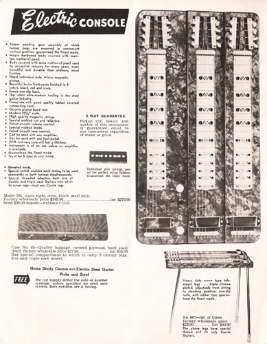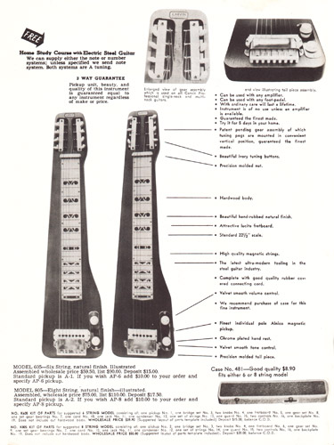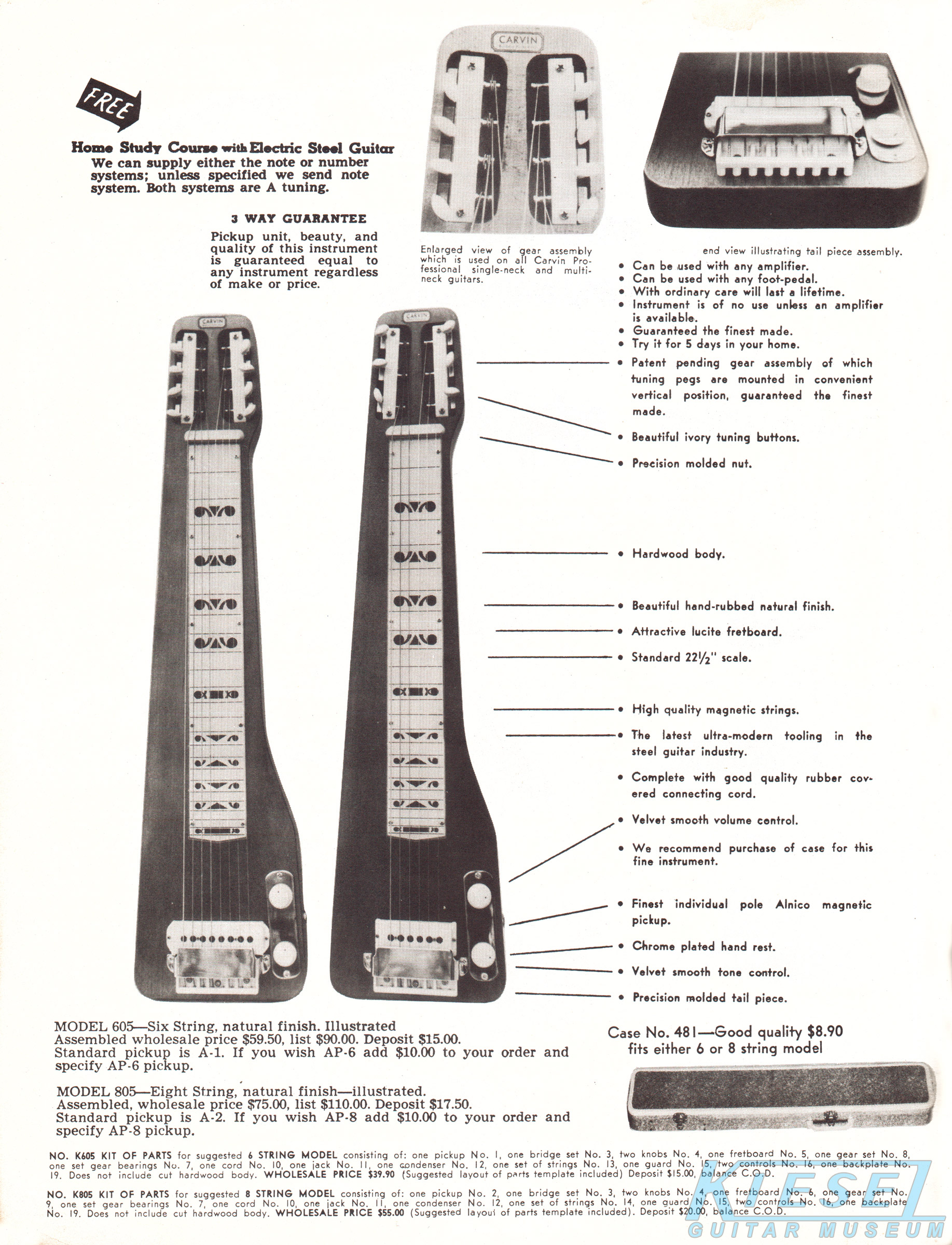 The Model #605 and Model #805 lap steel guitars were Carvin's higher-end models for 1954. They were made with hardwood beech bodies and 22 1/2" scale Lucite fingerboards. The tuner buttons were ivory, and the hardware was chrome. Each had an A-1 non-adjustable alnico pickup, with single volume and tone controls. The Model #605 was a 6-string model, and the #805 was an 8-string model. The Model #605 sold for $59.90 and the Model #805 was $75.00. Either could be upgraded with an AP-Series adjustable pickup for an additional $10.00. The optional case was $8.90. Either model could be ordered in kit form, as well. The kit included everything needed - hardware, fingerboard, electronics, etc., less the body.