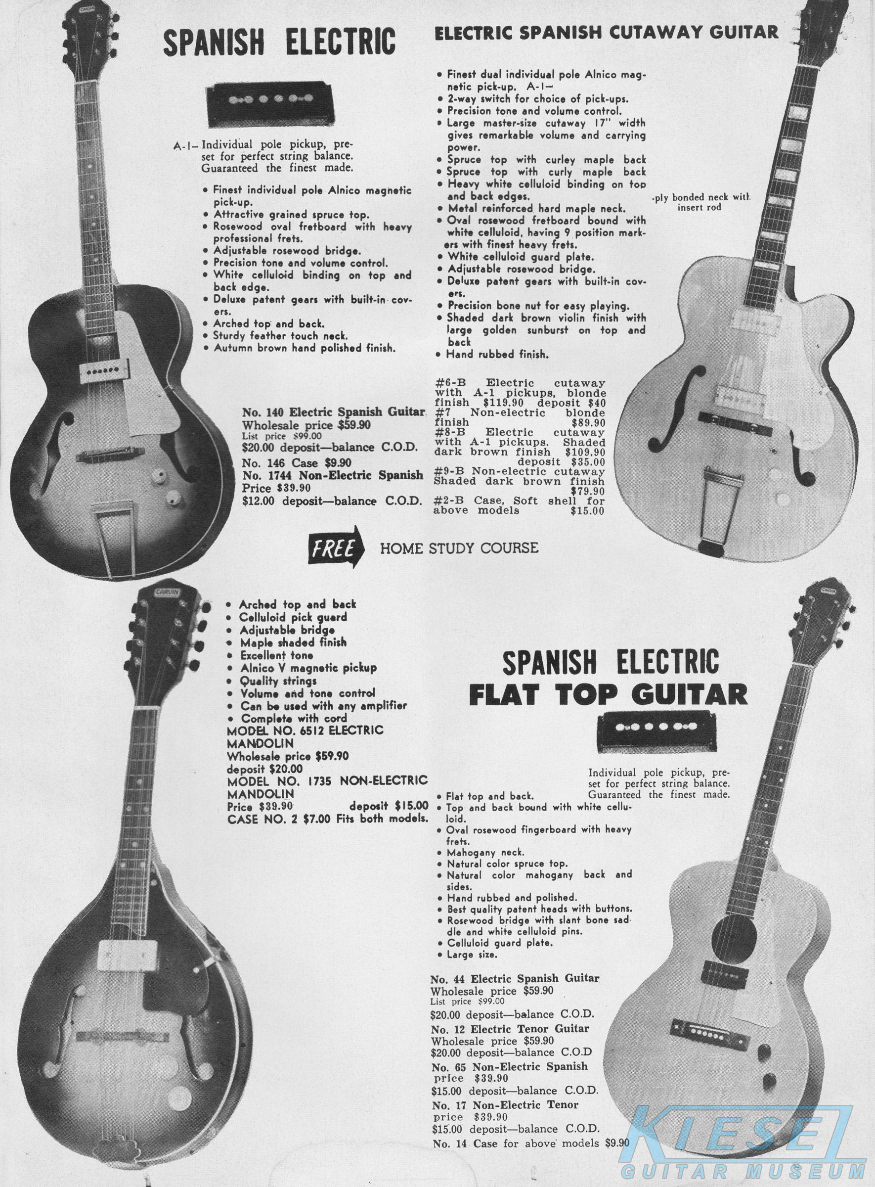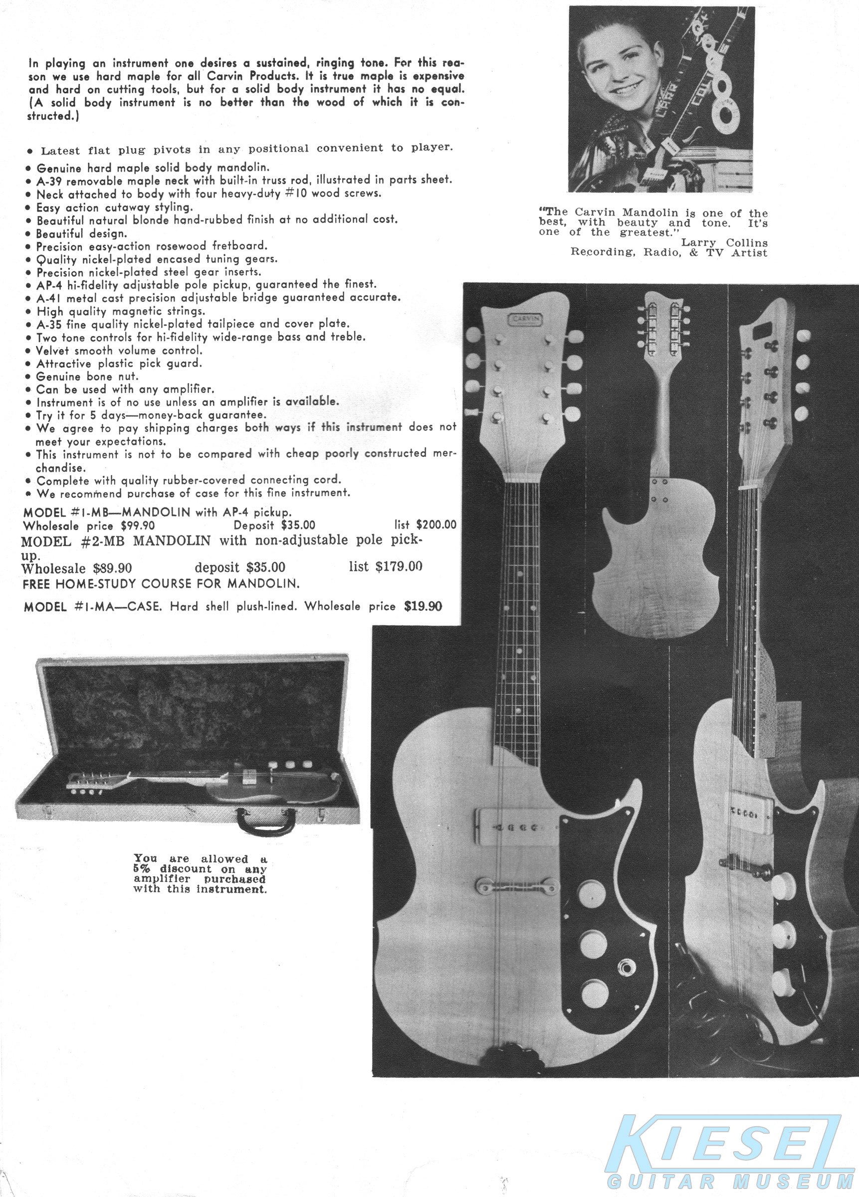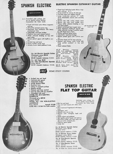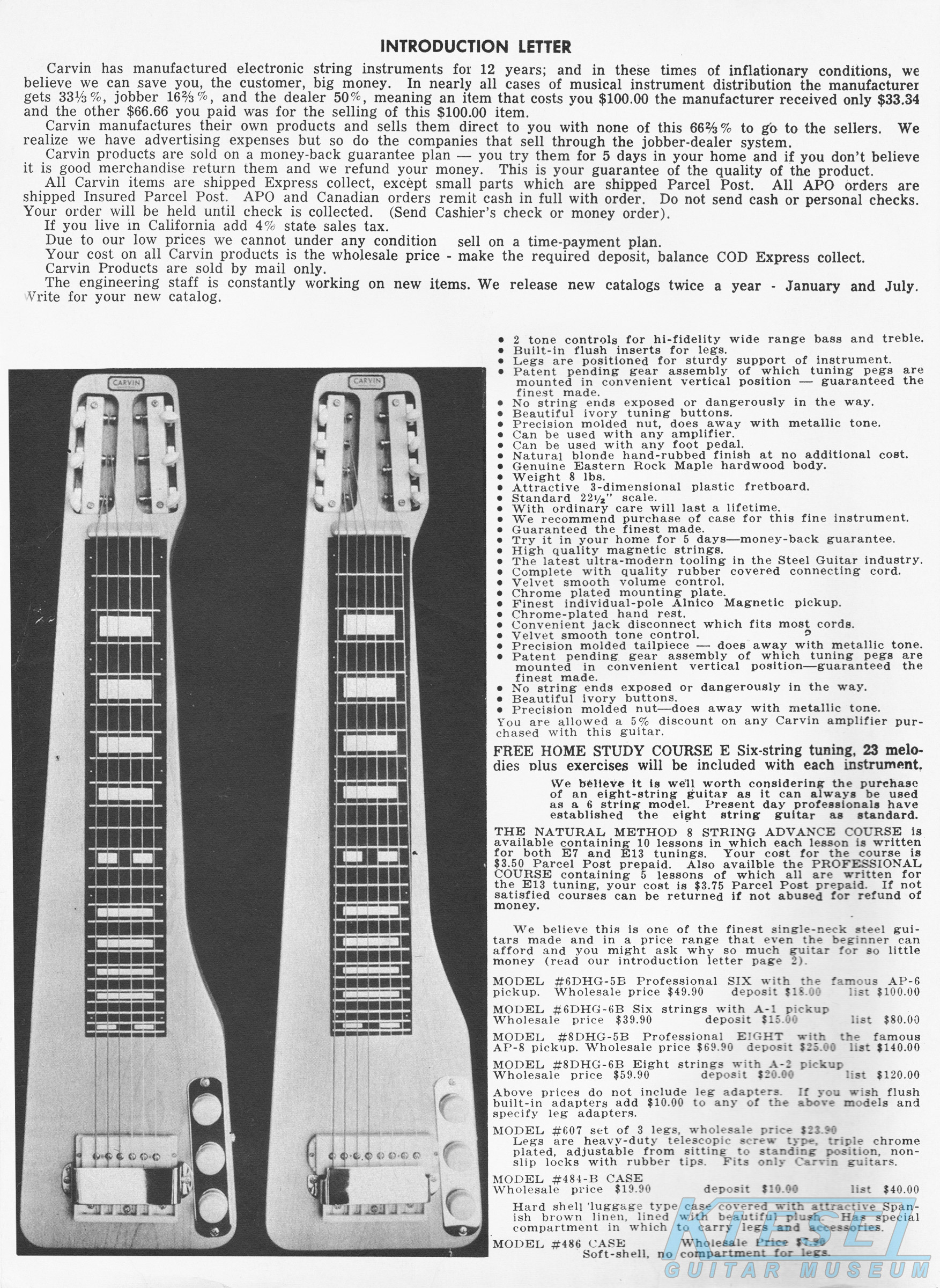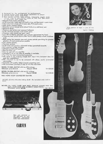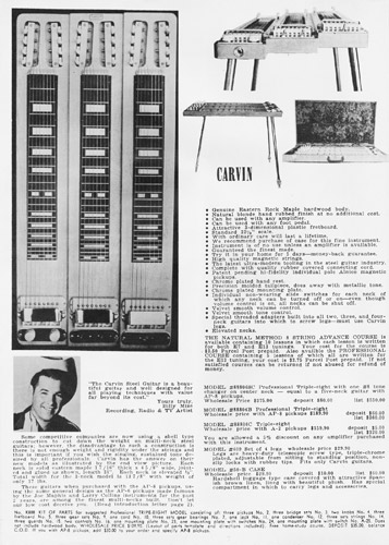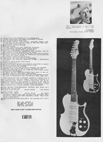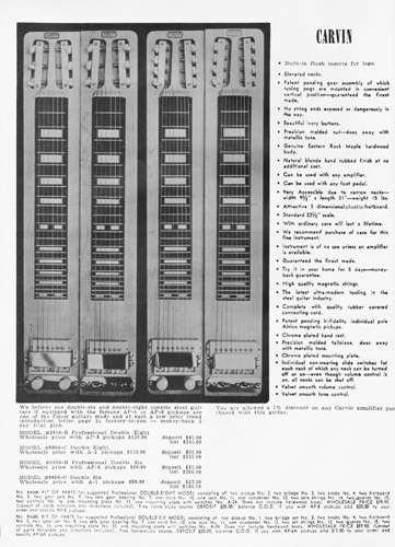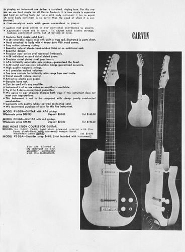 As in 1955, 1956 & 1957, the Model 140 Spanish electric, Model 6 Spanish electric, solidbody Model 1515 and Model 44 Spanish electric hardtop were all unchanged from 1955. These were almost certainly outsourced instruments, made by Teisco or another company, and badged with the Carvin logo and equipped with Carvin pickups. The specs, pricing and catalog pages showing these models was also unchanged from previous years.