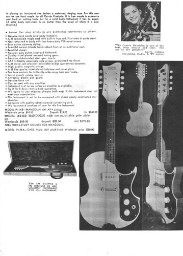 The Model #1-MB mandolin was also unchanged from the previous year. It sold for $99.90, and could also be ordered as the #2-MB, with non-adjustable A Series pickup, for $89.90.
