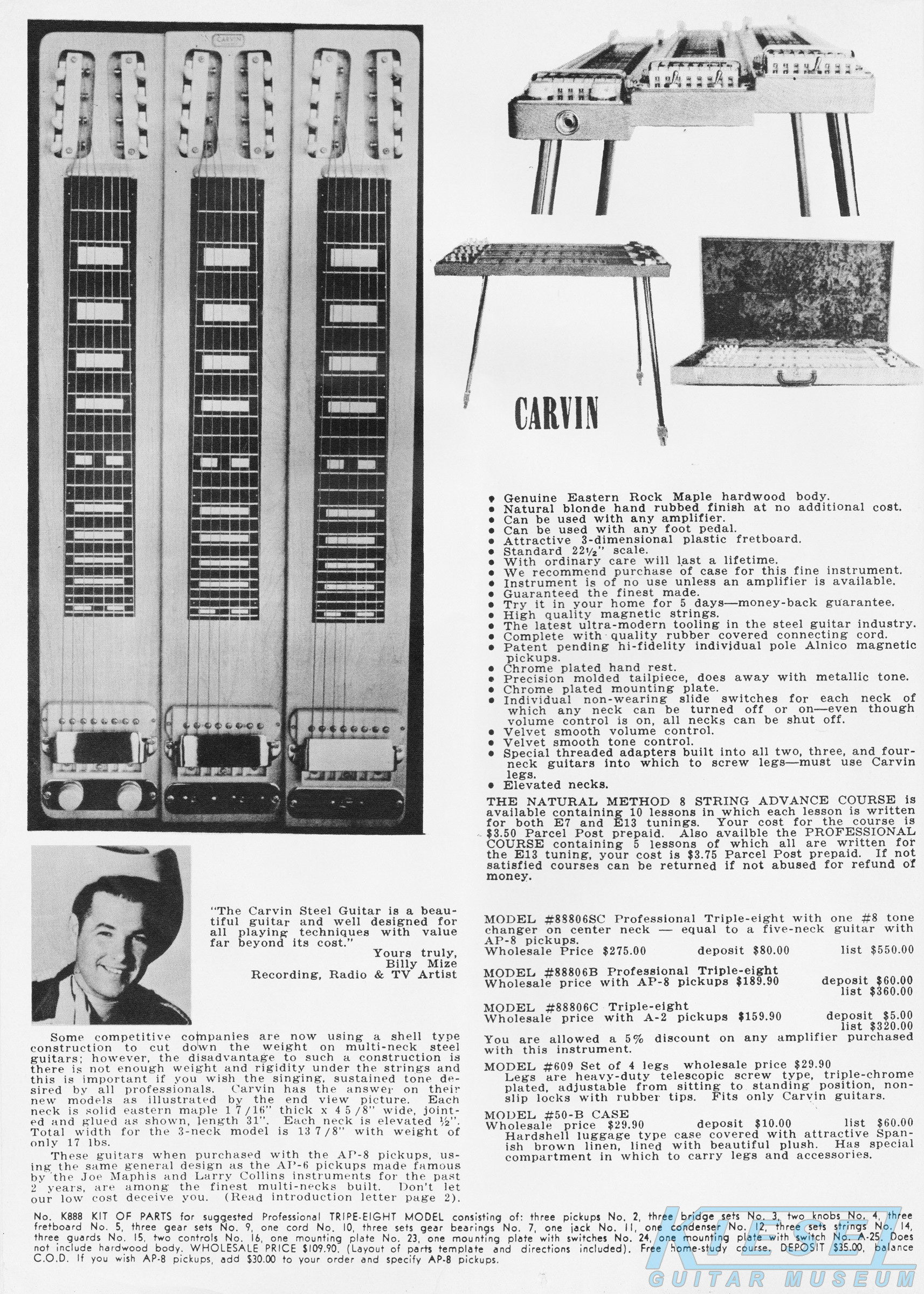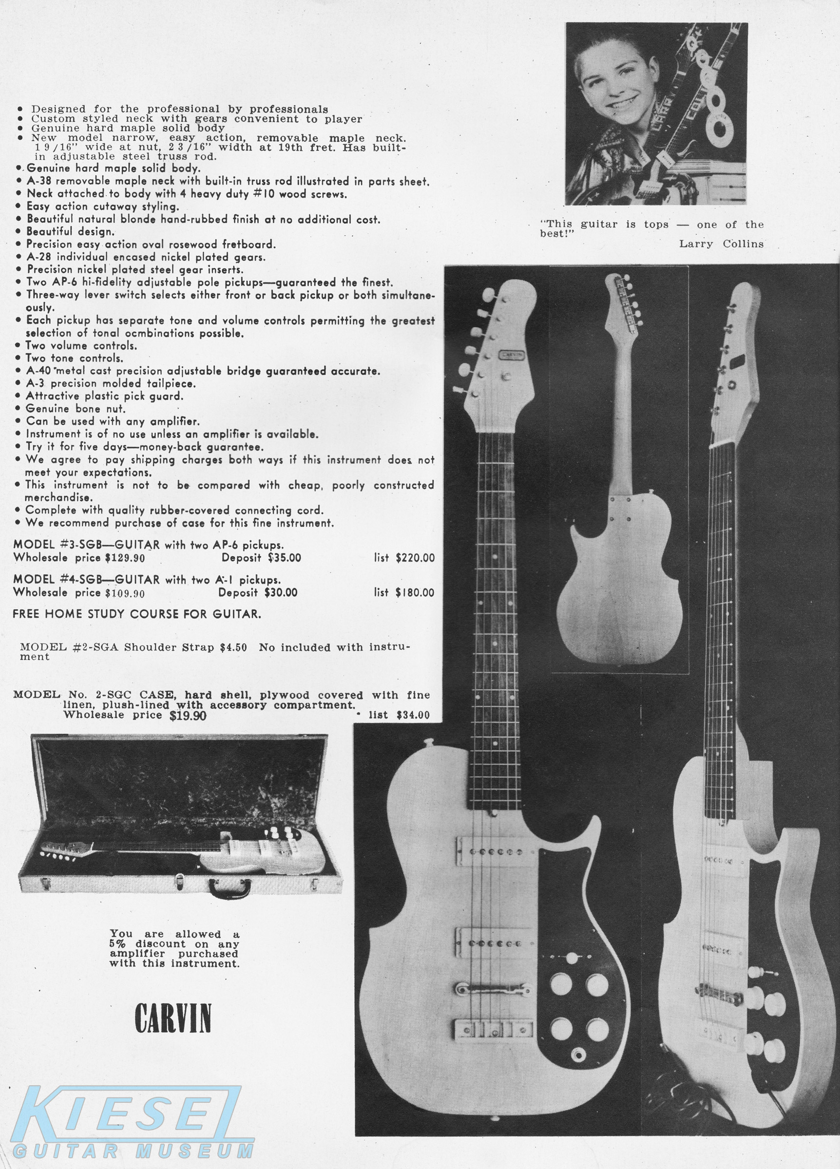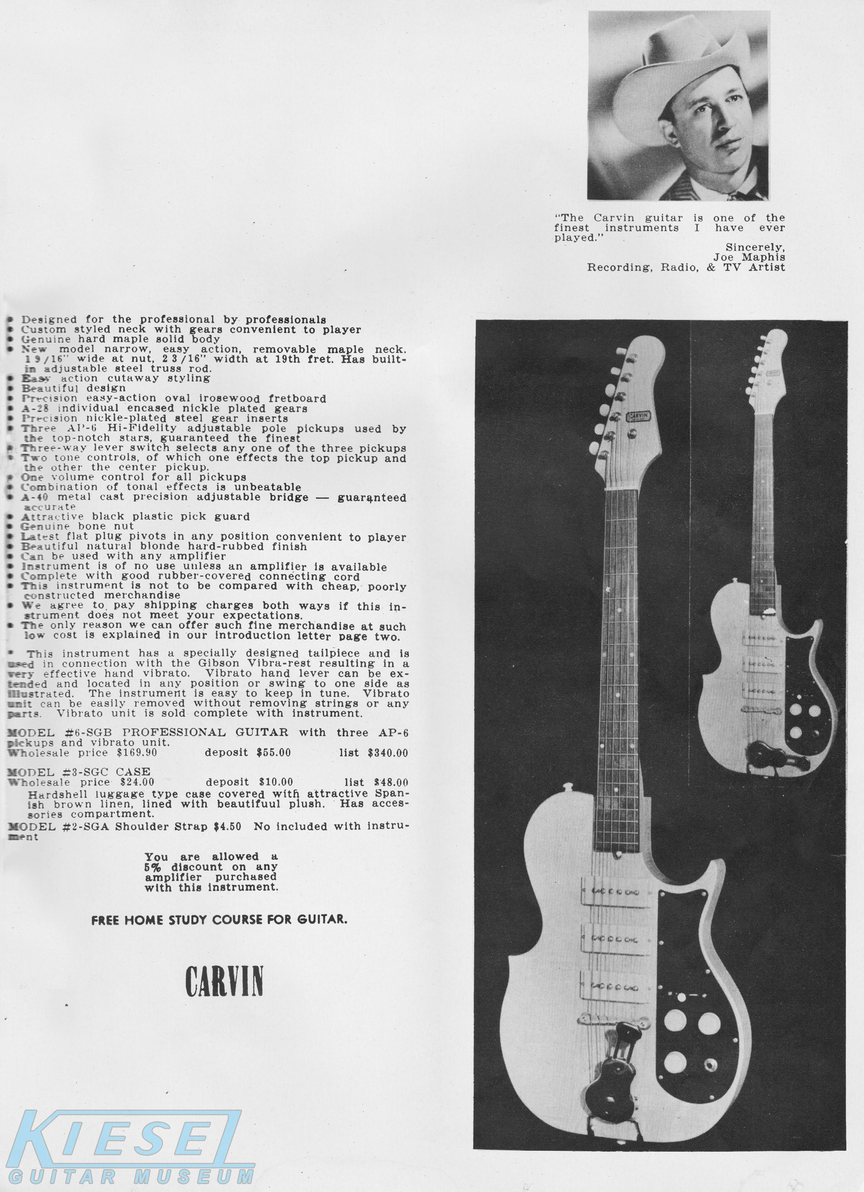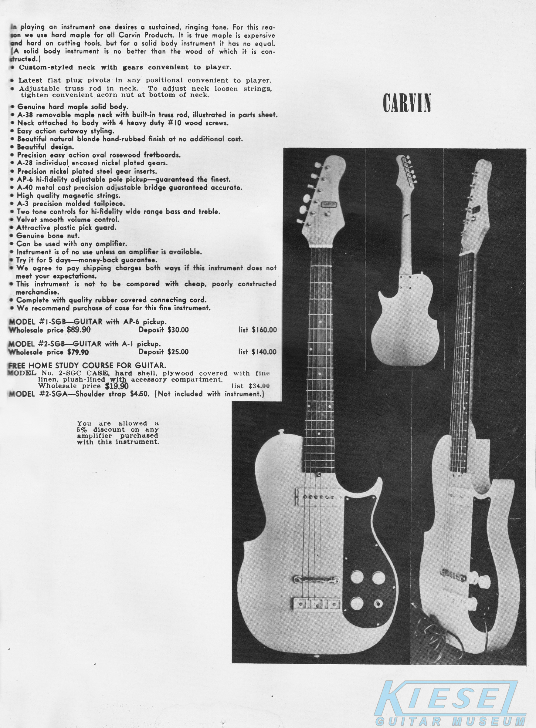 The 1958 Model #3-SGB guitar (left) was unchanged from the redesigned '57 model, constructed with a hard-rock maple body and a bolt-on maple neck. The neck had a rosewood fingerboard with a bone nut and sealed nickel-plated tuners. Electronics consisted of Carvin's AP-6 adjustable-pole pickups, with individual volume and tone controls, and a standard 3-way selector switch. Price increased slightly from 1957, with the #3-SGB selling for $129.90, and the #4-SGB, with non-adjustable pickups, selling for $109.90.