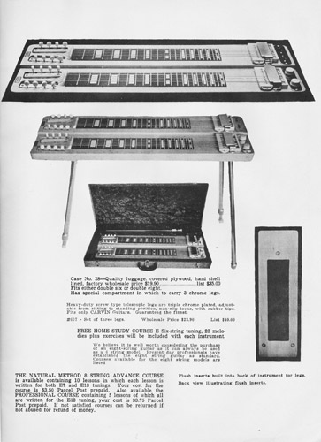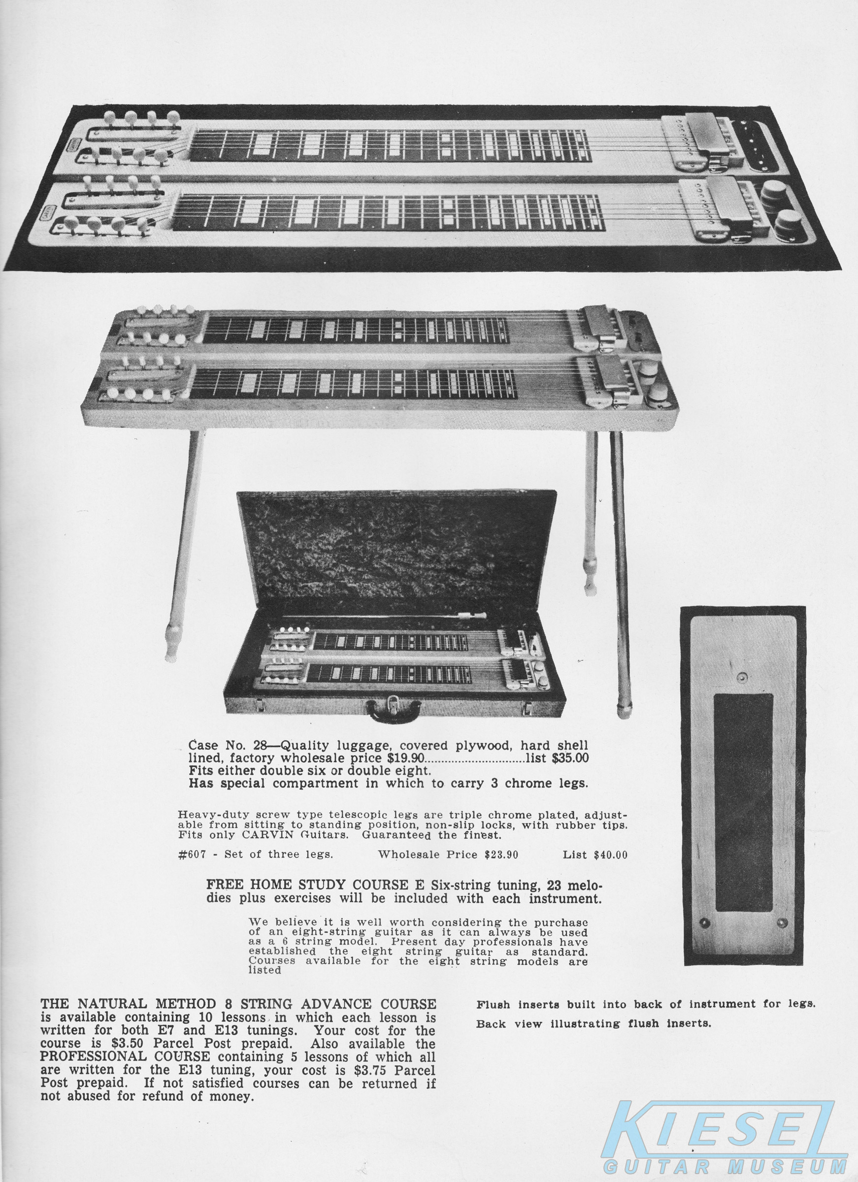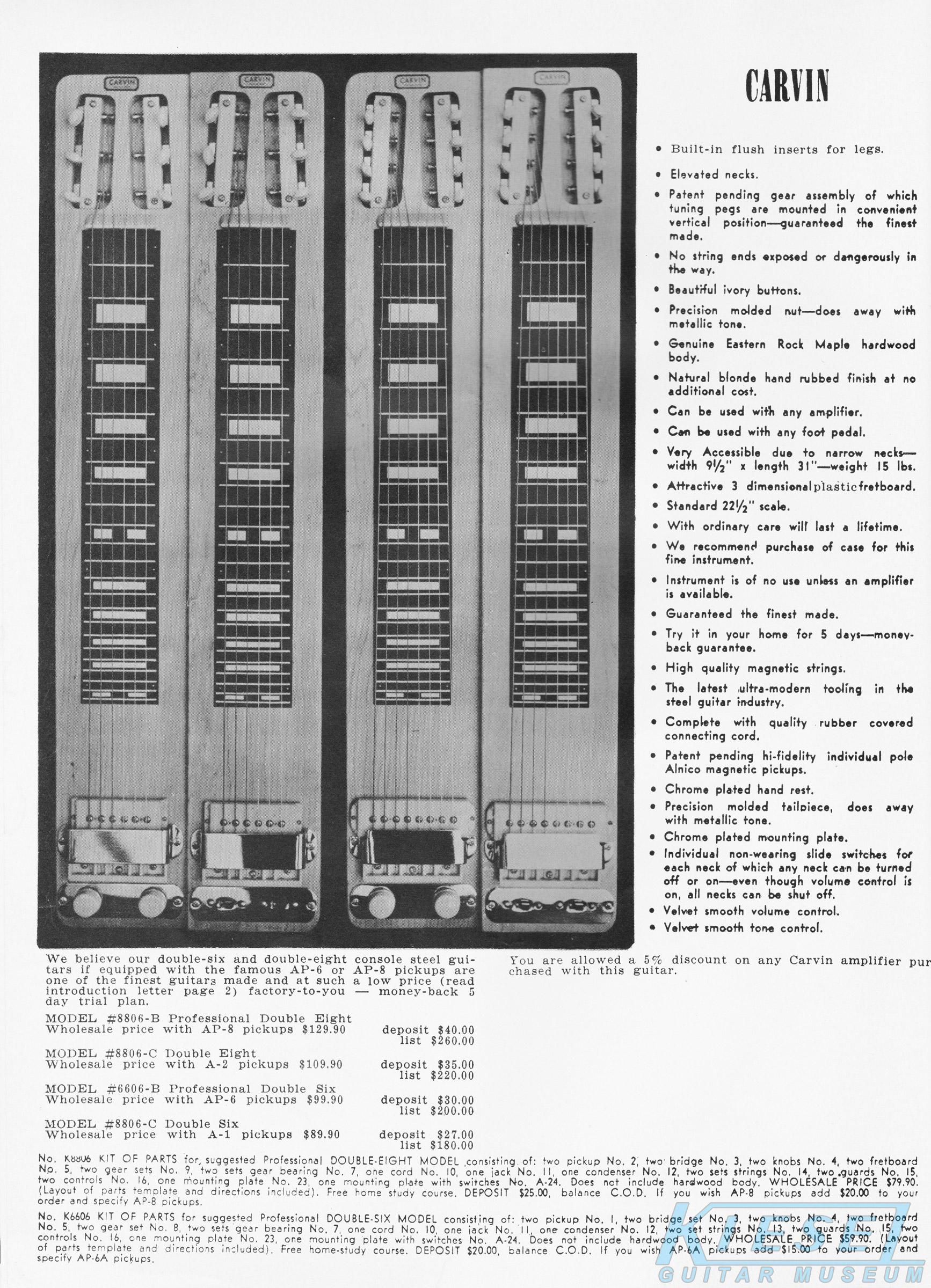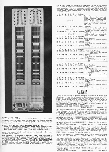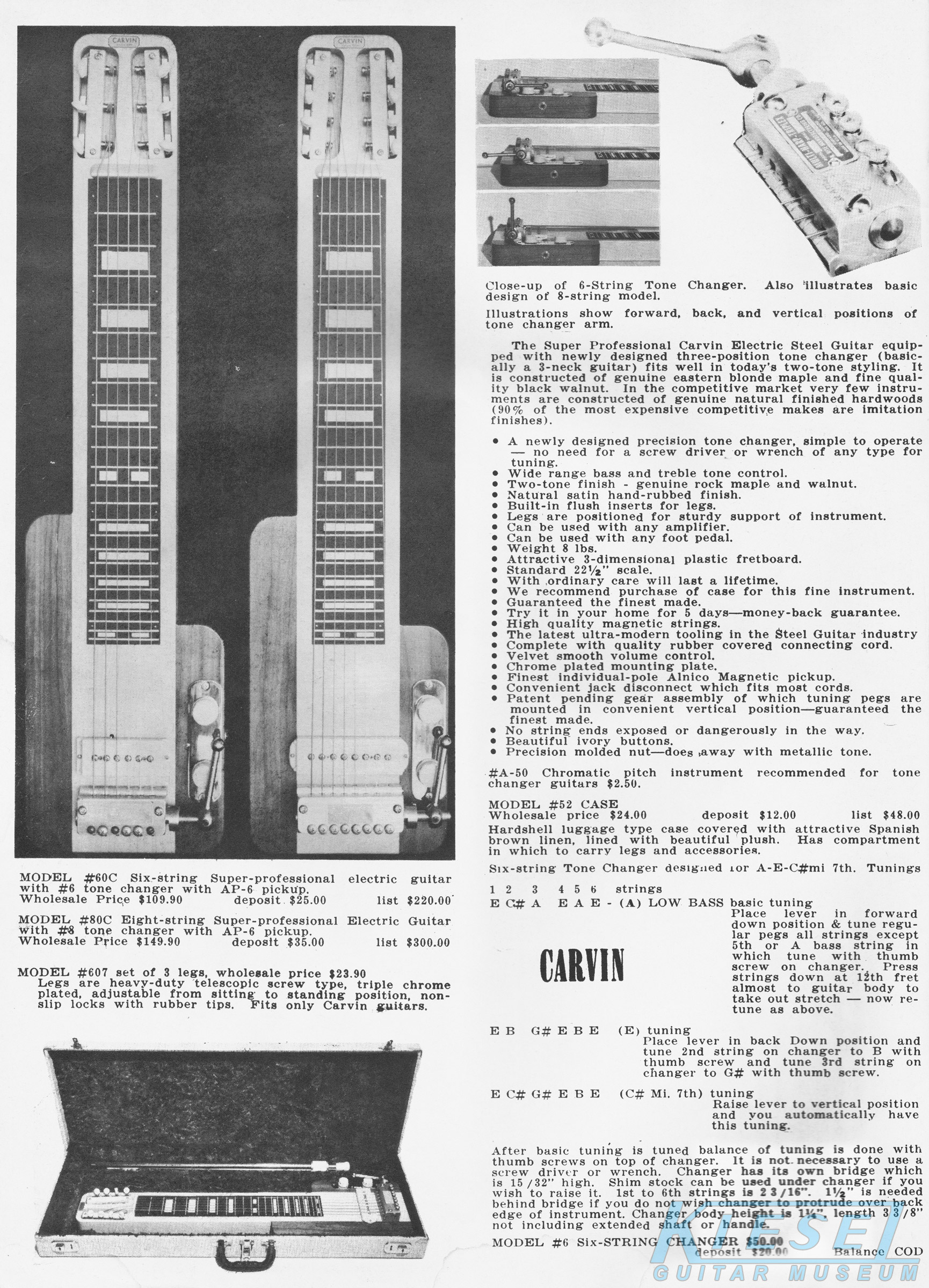 Carvin offered several lap steel models in 1958, all of which were new designs. The Model #60-C and the Model #80-C were both made with maple necks and black walnut bodies, with single AP-Series pickup. Both models came equipped with a Multi-Harp Triplextone changer, which changed the tuning from the standard A, to E or C#m7. The #60-C sold for $109.90, and the #80-C sold for $149.90.