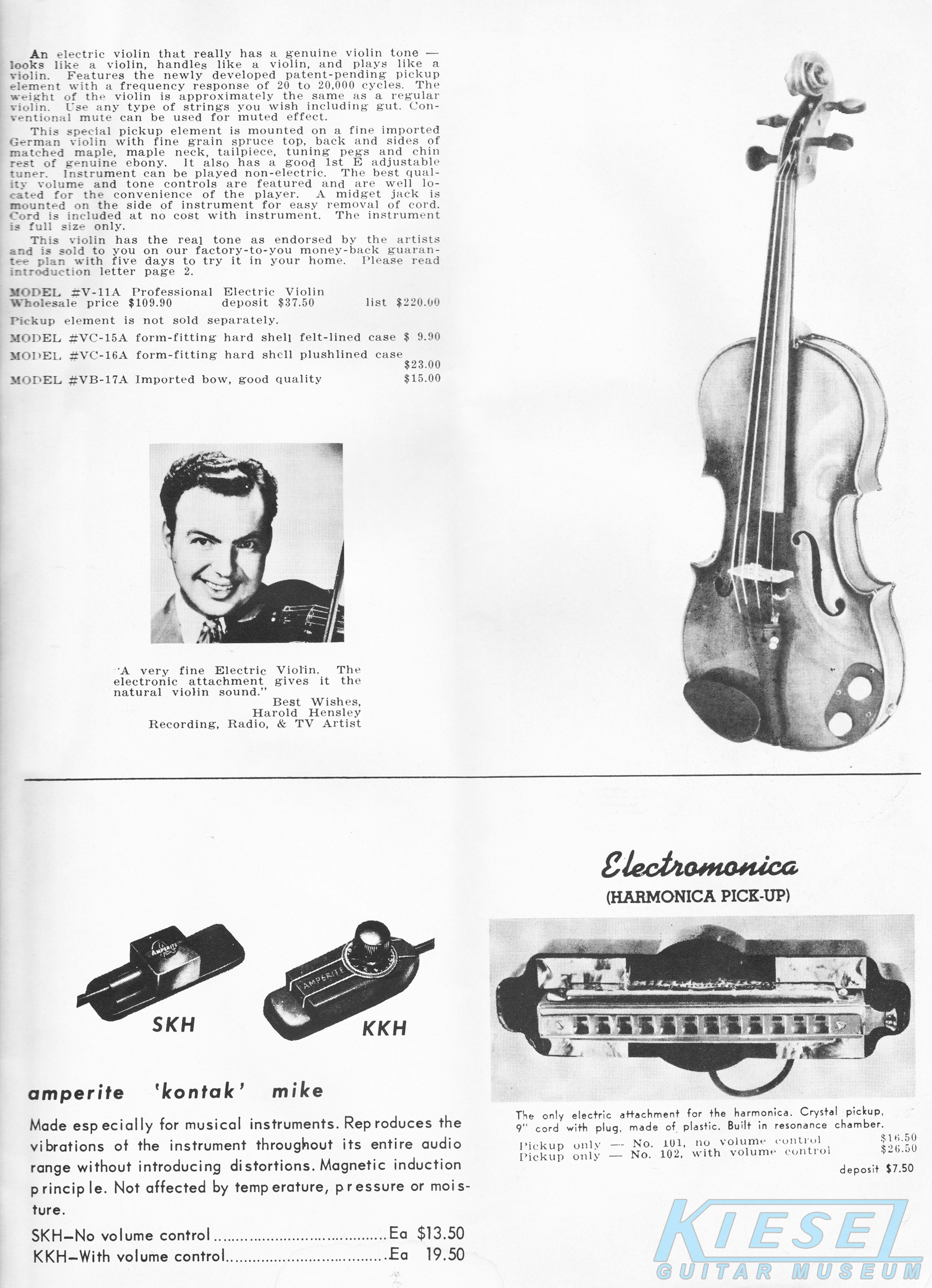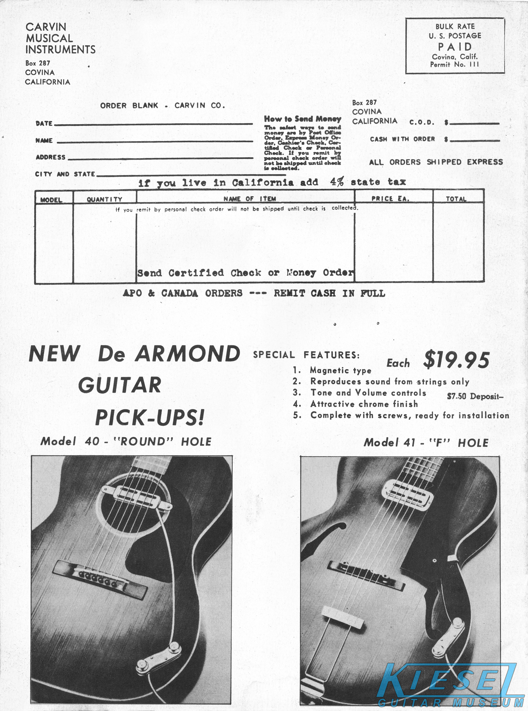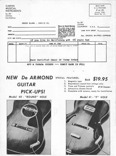 As shown on the back cover of the 1958 catalog, Carvin continued to offer DeArmond pickups. These pickups were designed for soundhole or F-hole applications, and sold for $19.95.