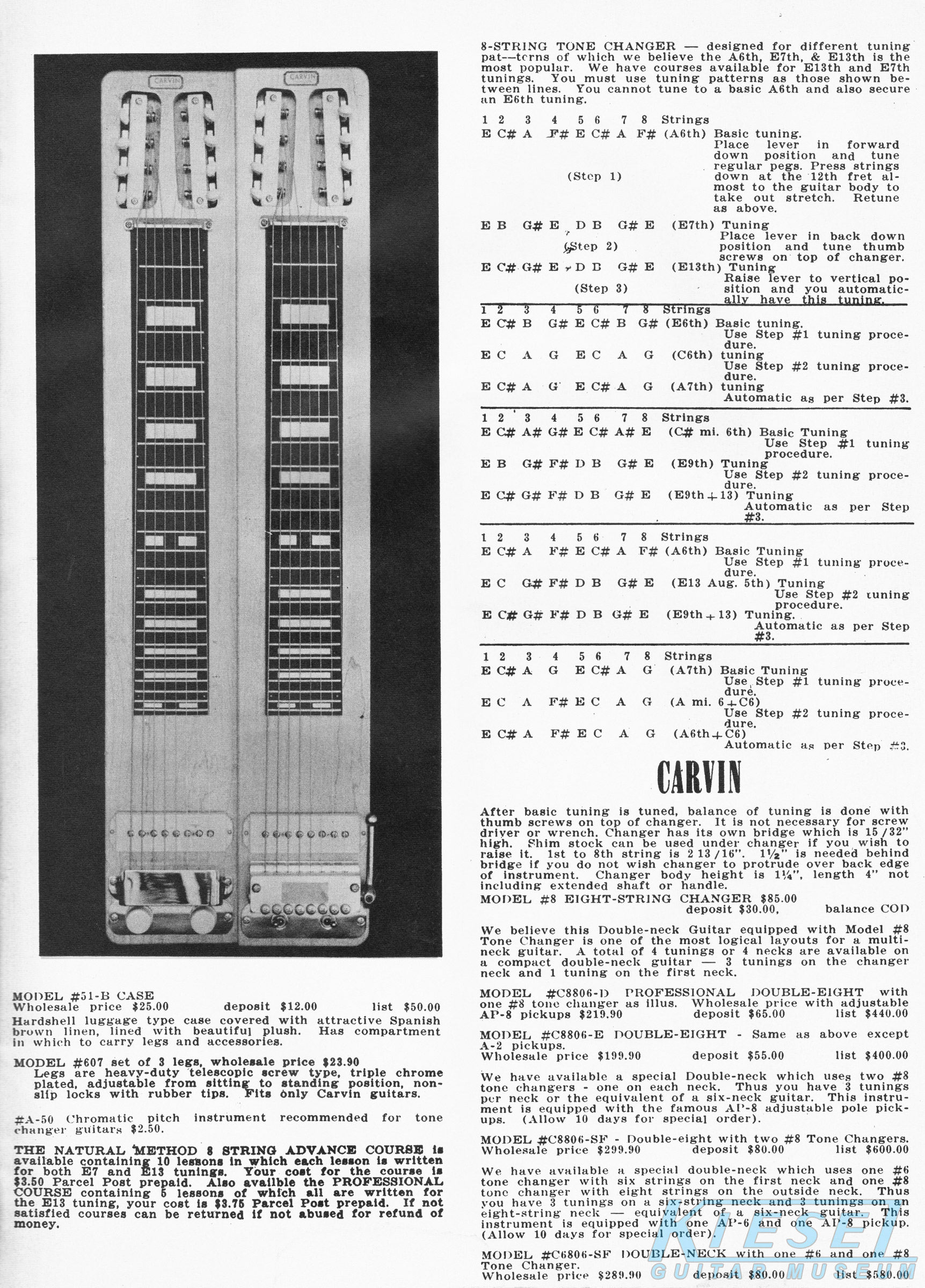 The Model #8806-B doubleneck 8-string sold for $129.90 with AP-8 pickups. It was also offered as the #8806-C, wich had non-adjustable A-2 pickups, for $109.90. The 6-string Model #6606-B sold for $99.90 with AP-6 pickups, or $89.90 for the #6606-C, which had non-adjustable A-1 pickups.