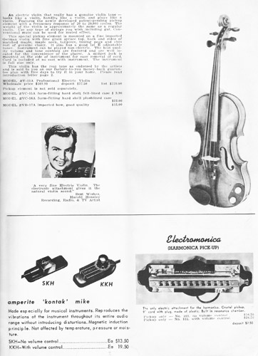 Accordions were no longer offered in the 1958 catalog, but a couple of models would return for 1959. However, Carvin offered the Model #V-11A electric violin. This German-made instrument used a transducer-type pickup, but could also be played acoustically. Accessories were offered, including cases and bows. The #V-11A sold for $109.90. It would disappear from the 1959 catalog, but would reappear in 1960.