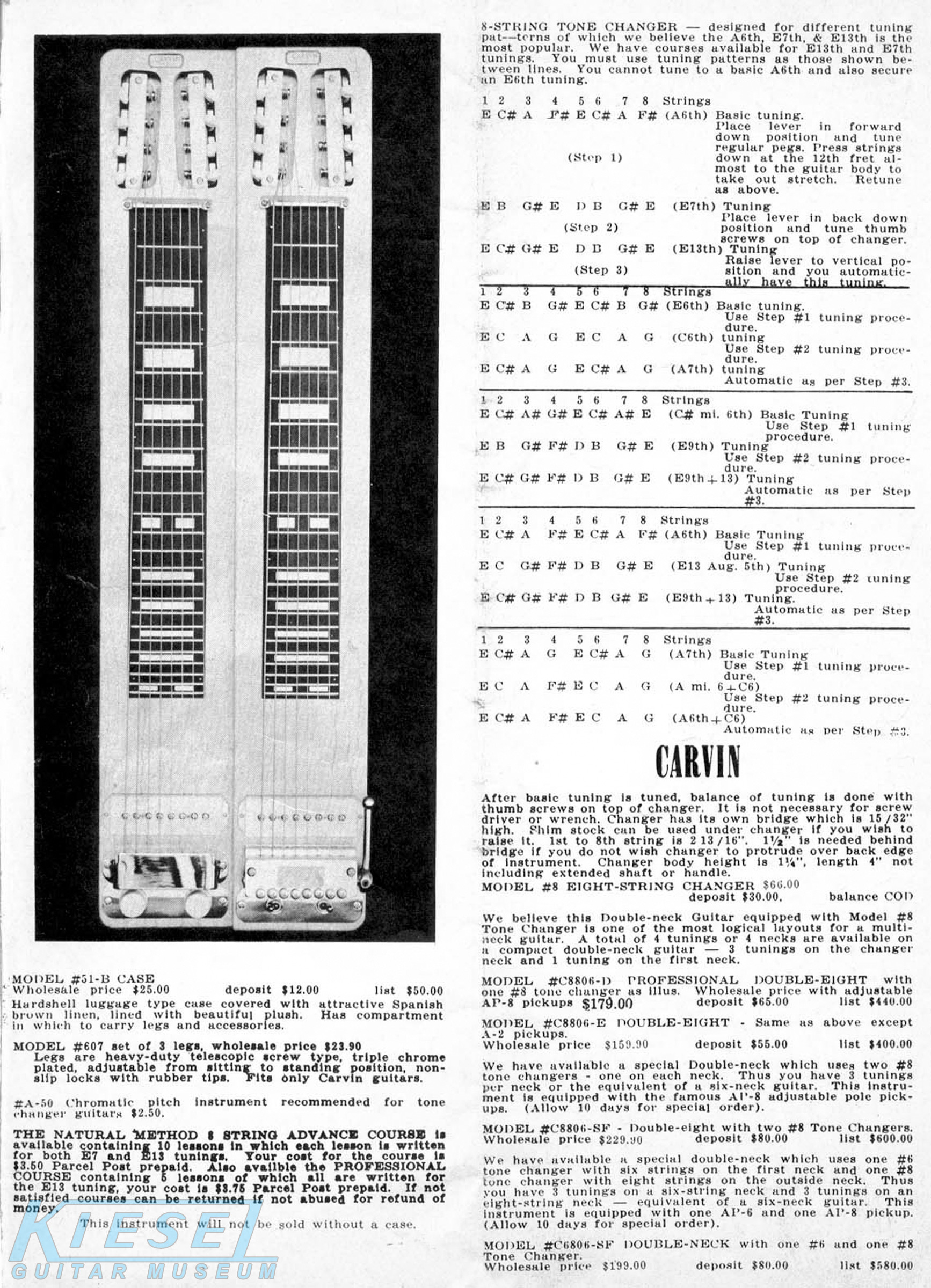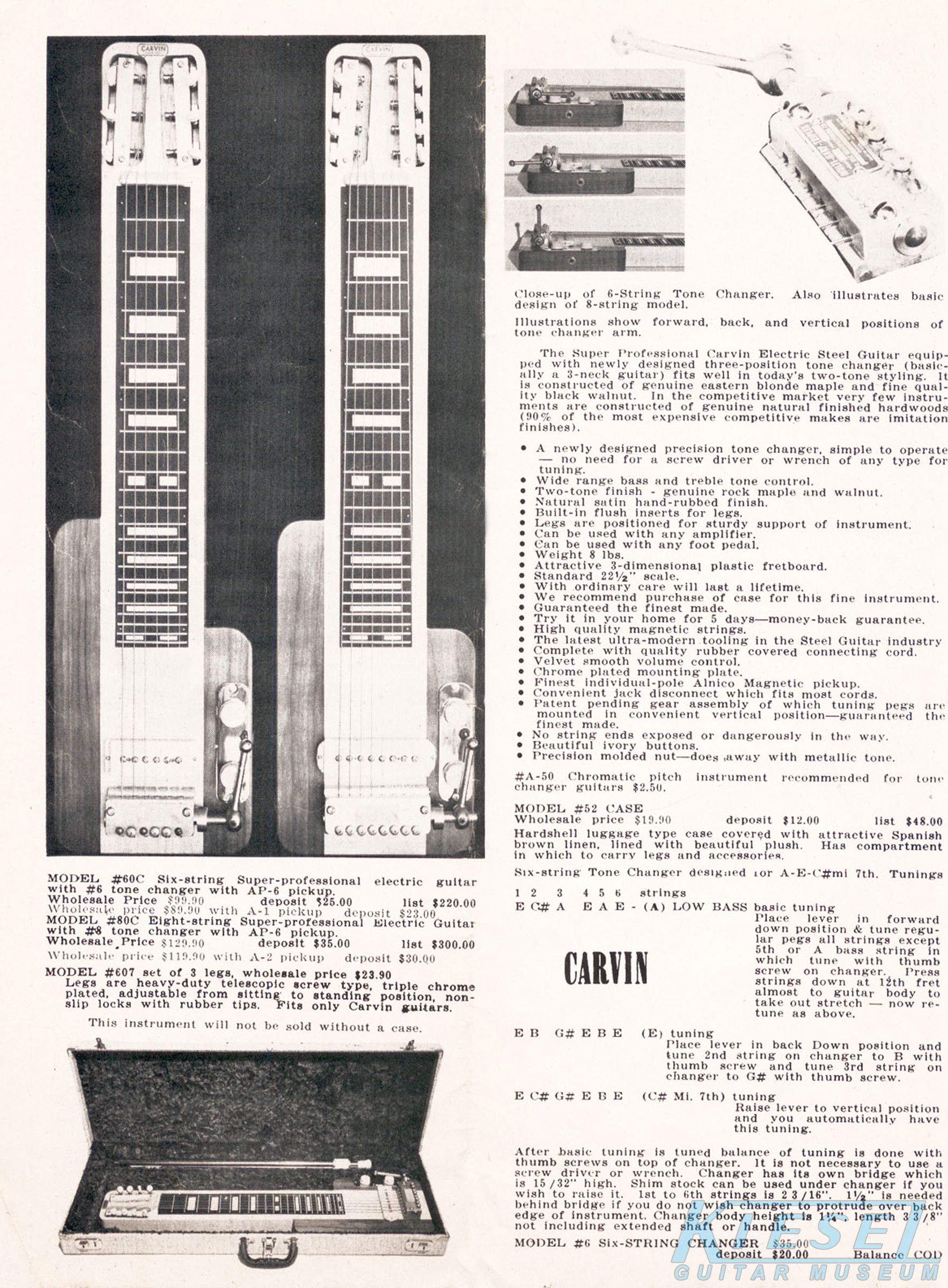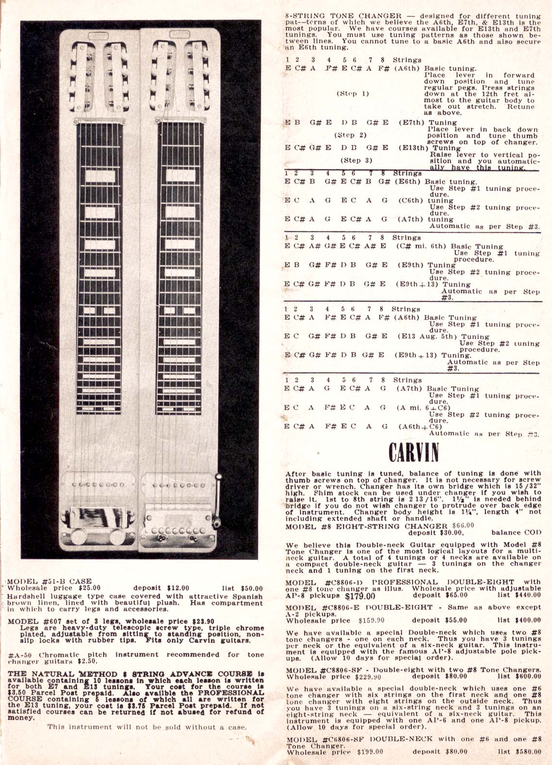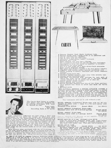 Carvin's steel guitar lineup was unchanged from 1959, except for the Model #6DHG-5B and Model #8DHG-6B, which were both discontinued. The other models retained the same pricing and other details as their 1959 counterparts.