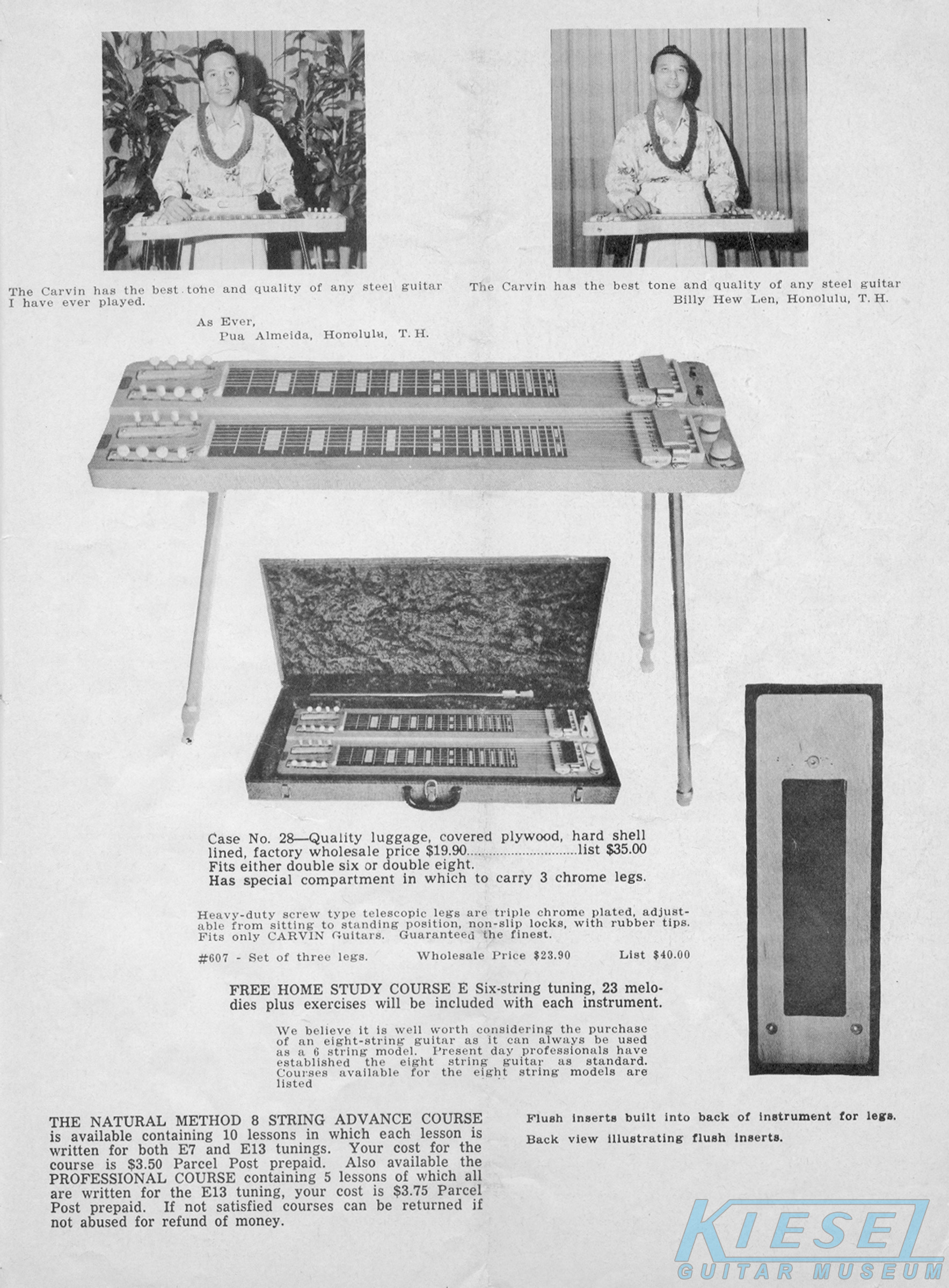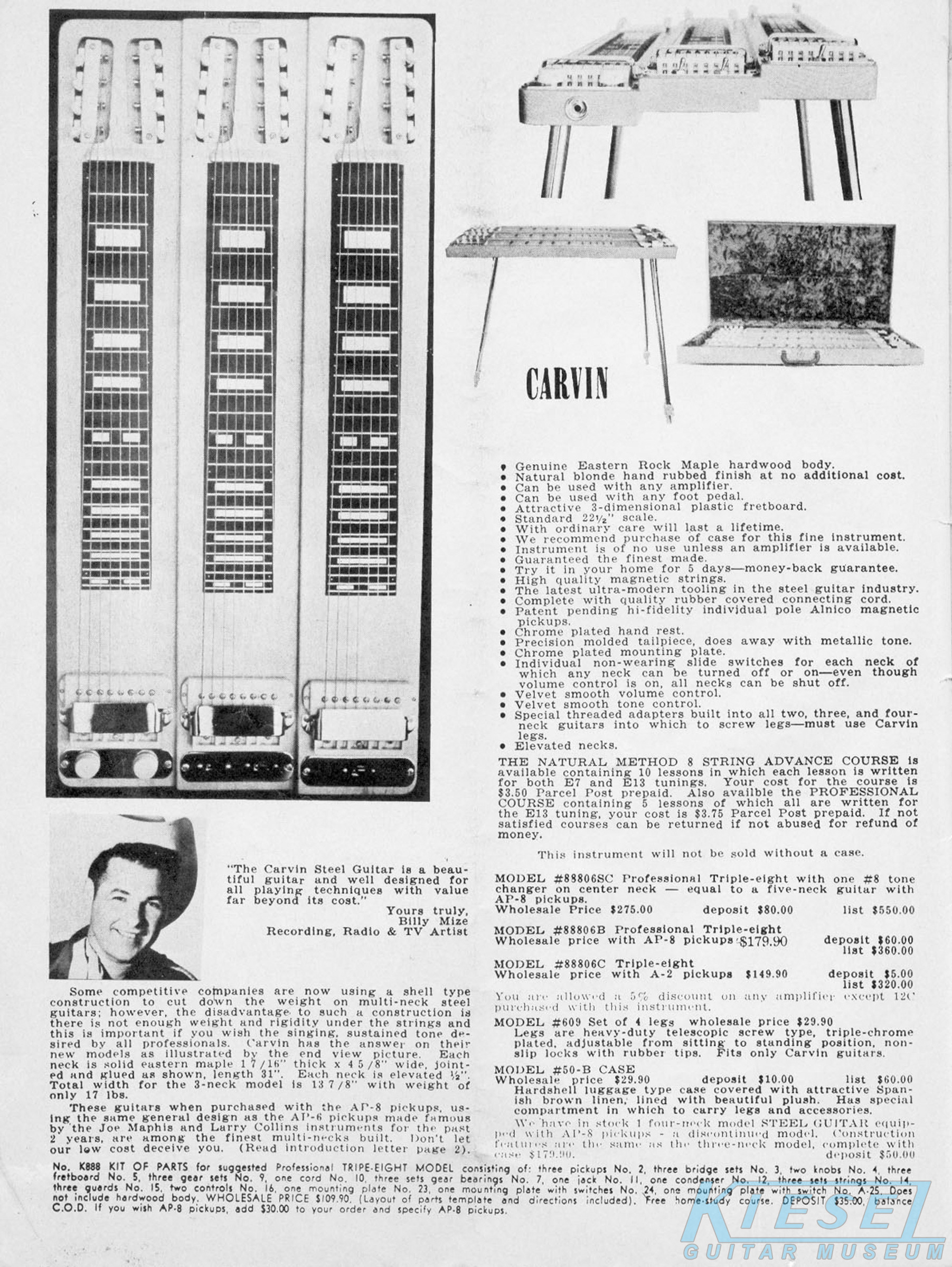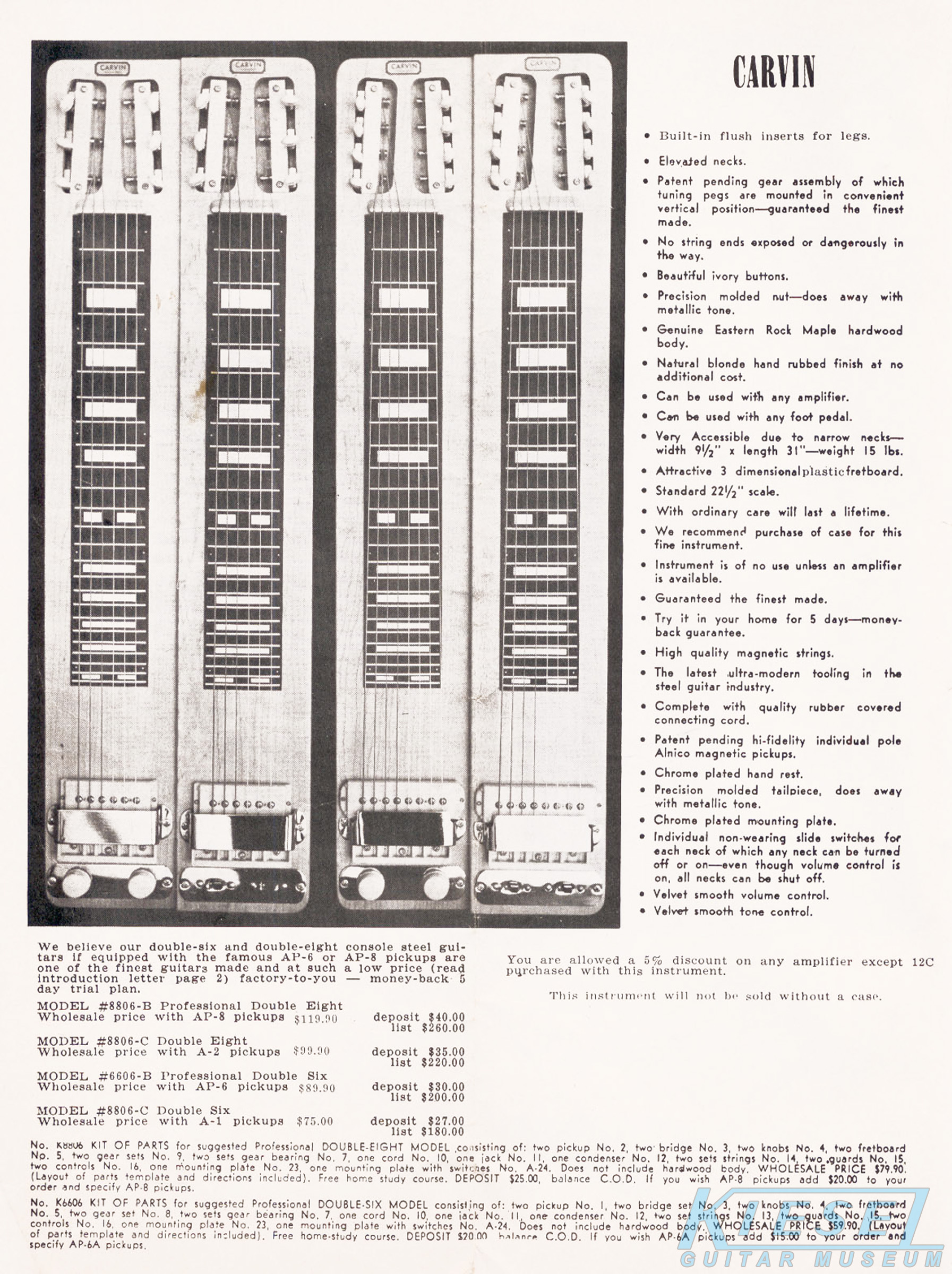 Carvin's steel guitar lineup was unchanged from 1959, except for the Model #6DHG-5B and Model #8DHG-6B, which were both discontinued. The other models retained the same pricing and other details as their 1959 counterparts.