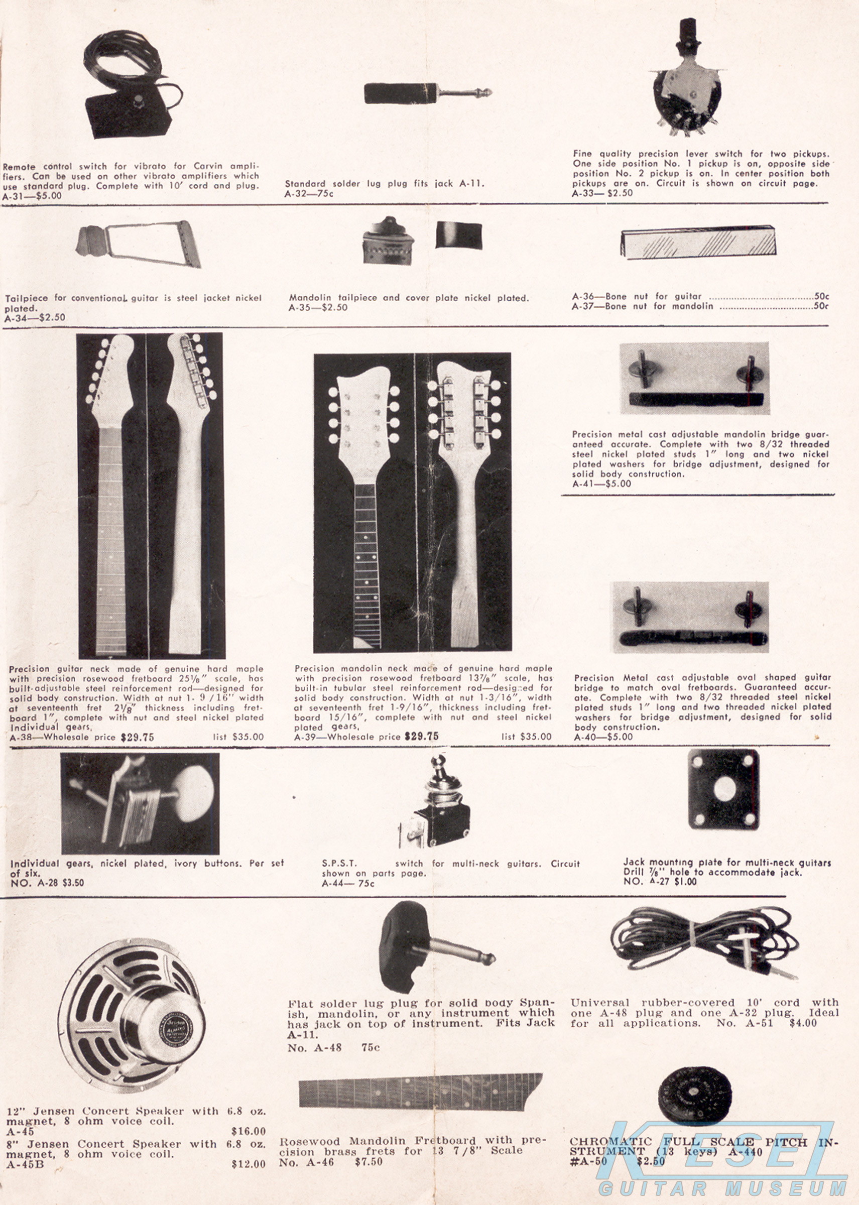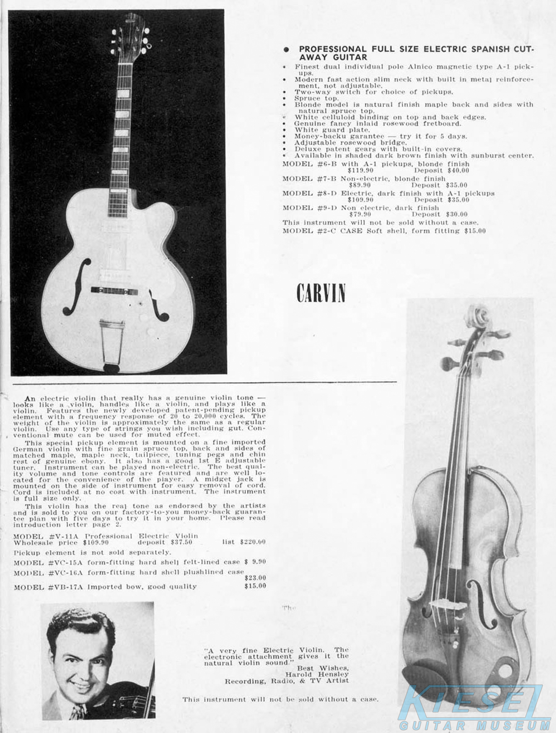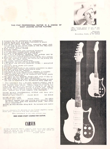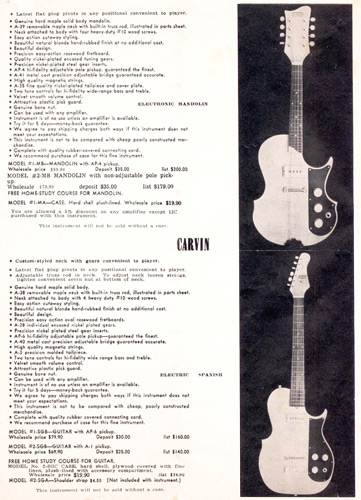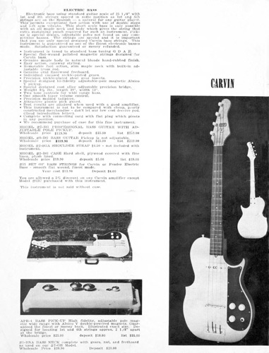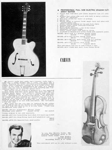 in 1960, Carvin offered the #V-11A electric violin, which was originally shown in the 1958 catalog. The instrument itself was German-made, with an acoustic transducer-type pickup with volume and tone controls added by Carvin. Although innovative, this would be the last year this item was offered. Price on the #V-11A was $109.90.