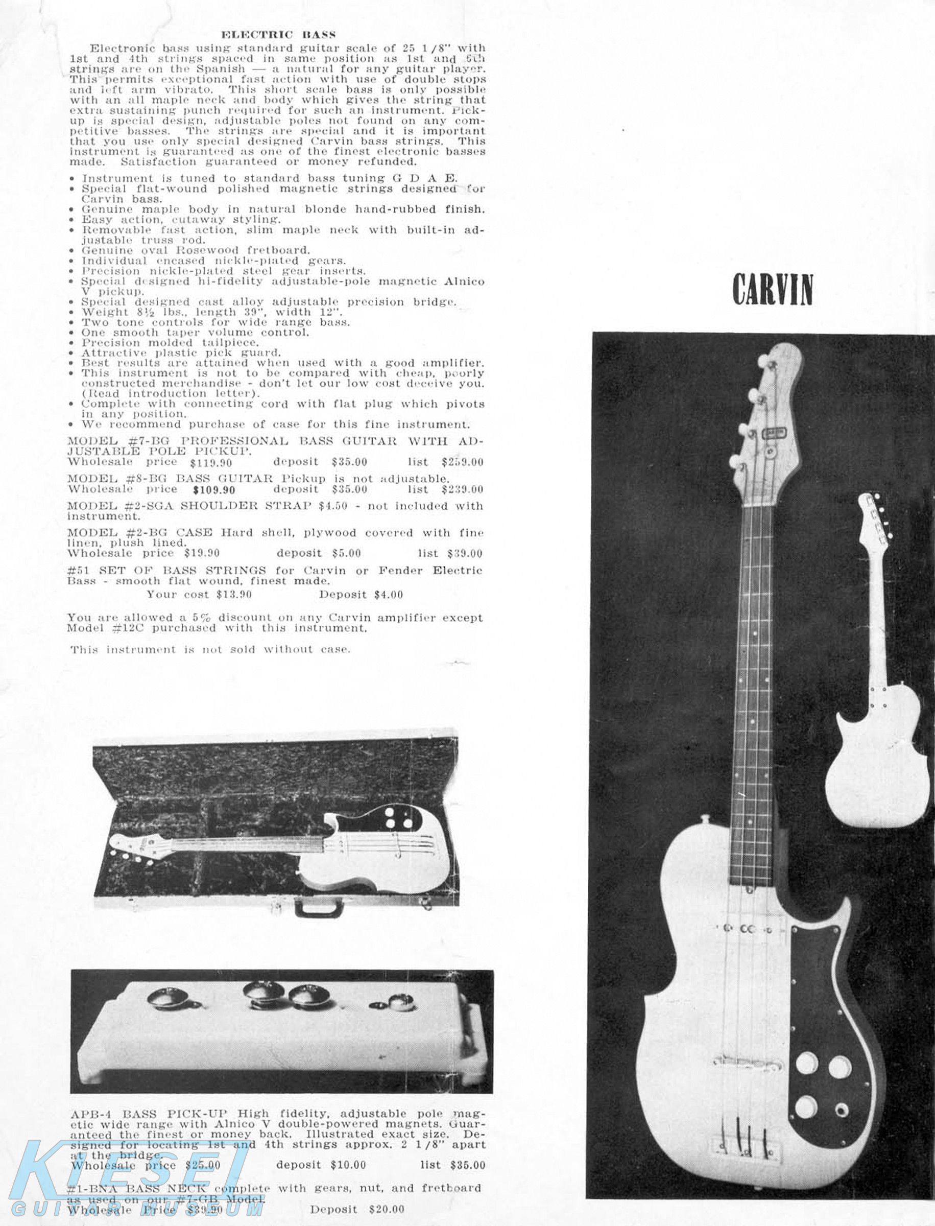 The Model #7-BG bass was in its second year of production. Like the '59 debut model, it was a 25 1/8" scale model, constructed from maple with a bolt-on neck with rosewood fingerboard. It also had a single AP-4 adjustable pickup in the neck position, with a single volume control and two tone controls. The price on the #7-BG was $119.90. It was also offered as the #8-BG, which was the same except it had a non-adjustable pickup. Price on the #8-BG was $109.90. The #2-BG hardshell case was $19.90.