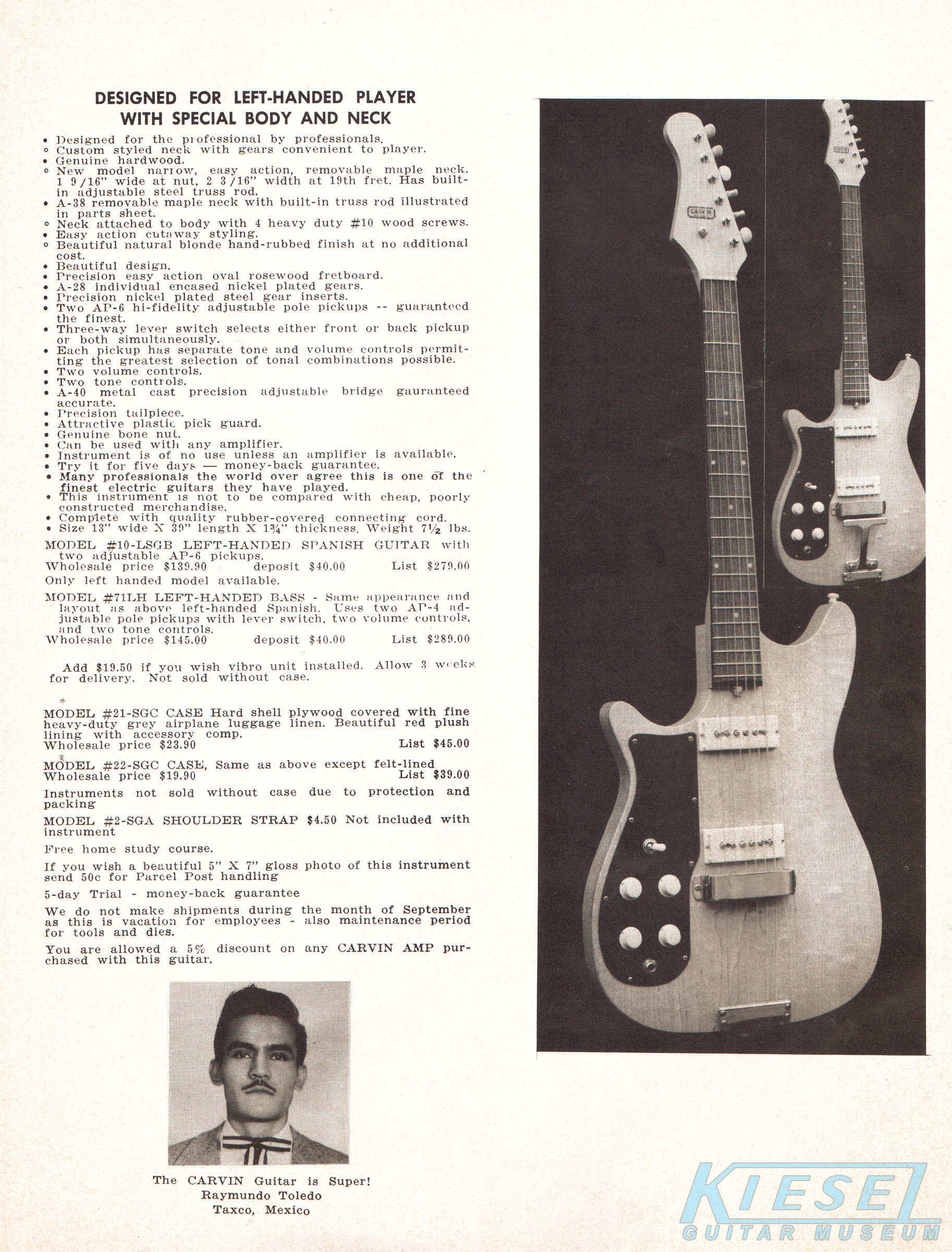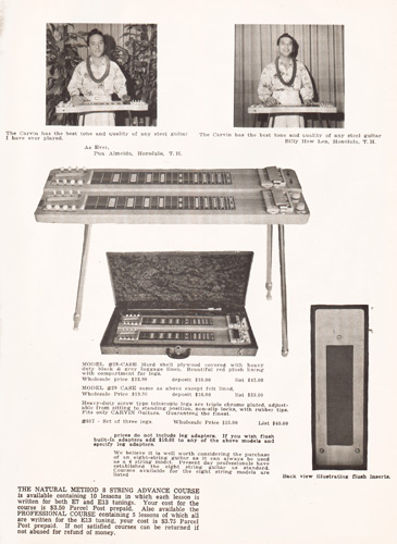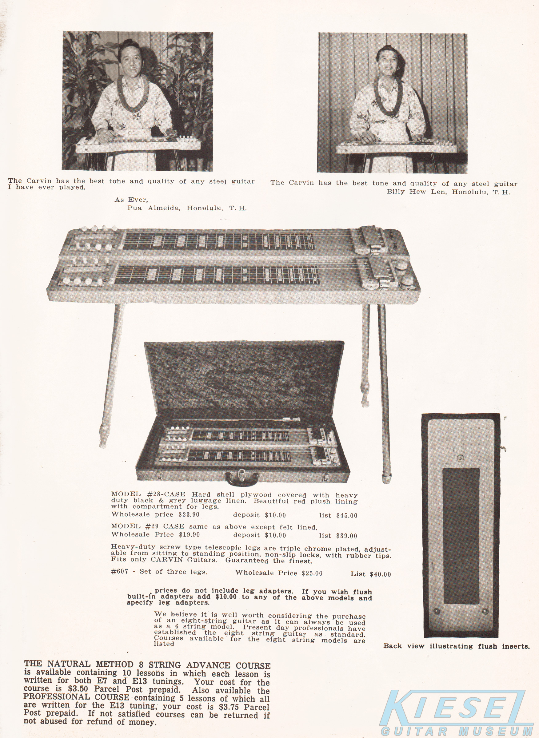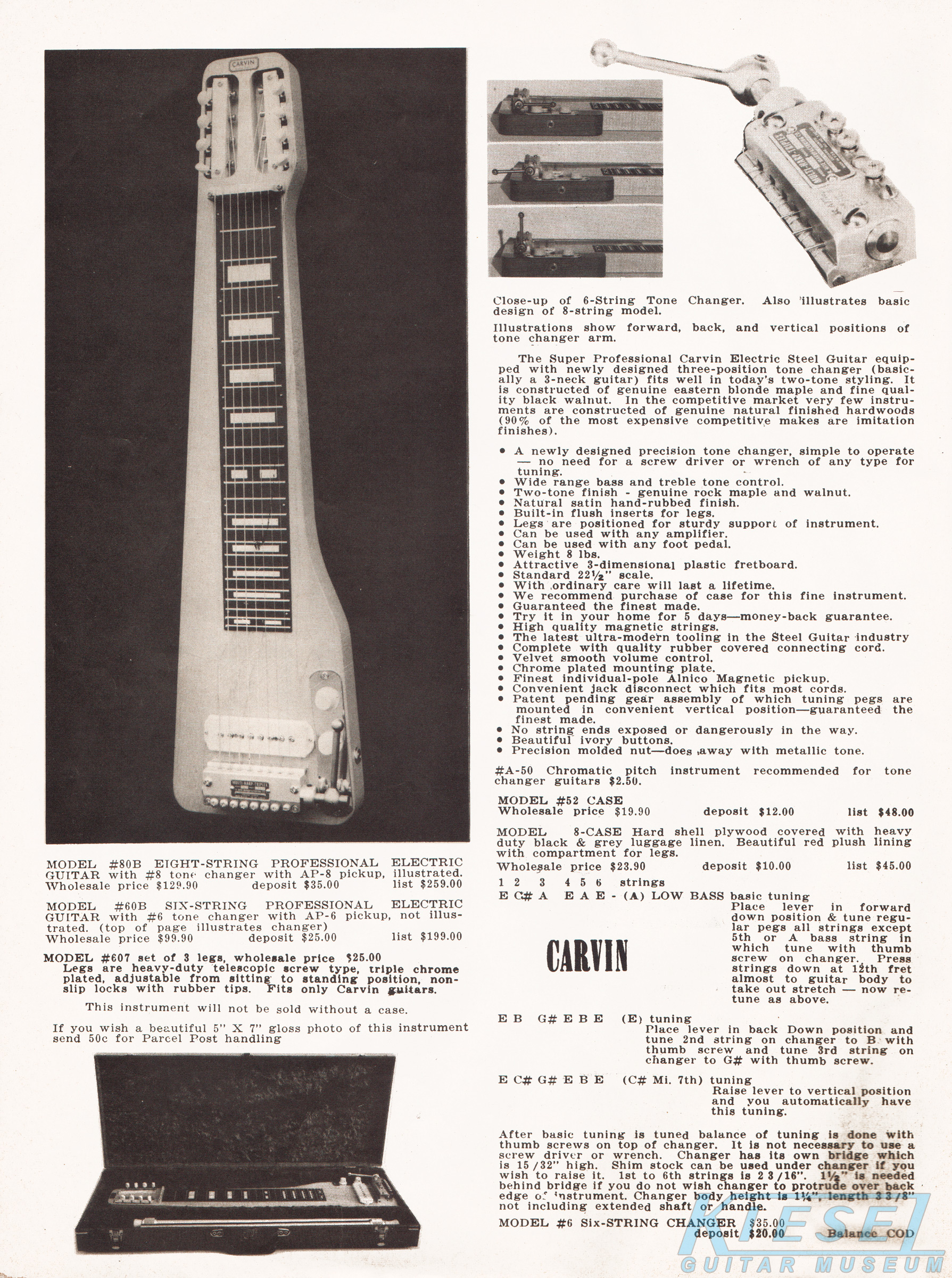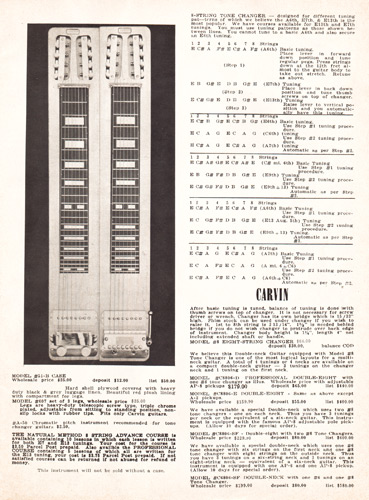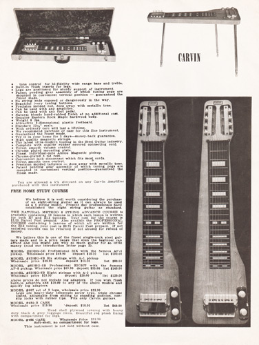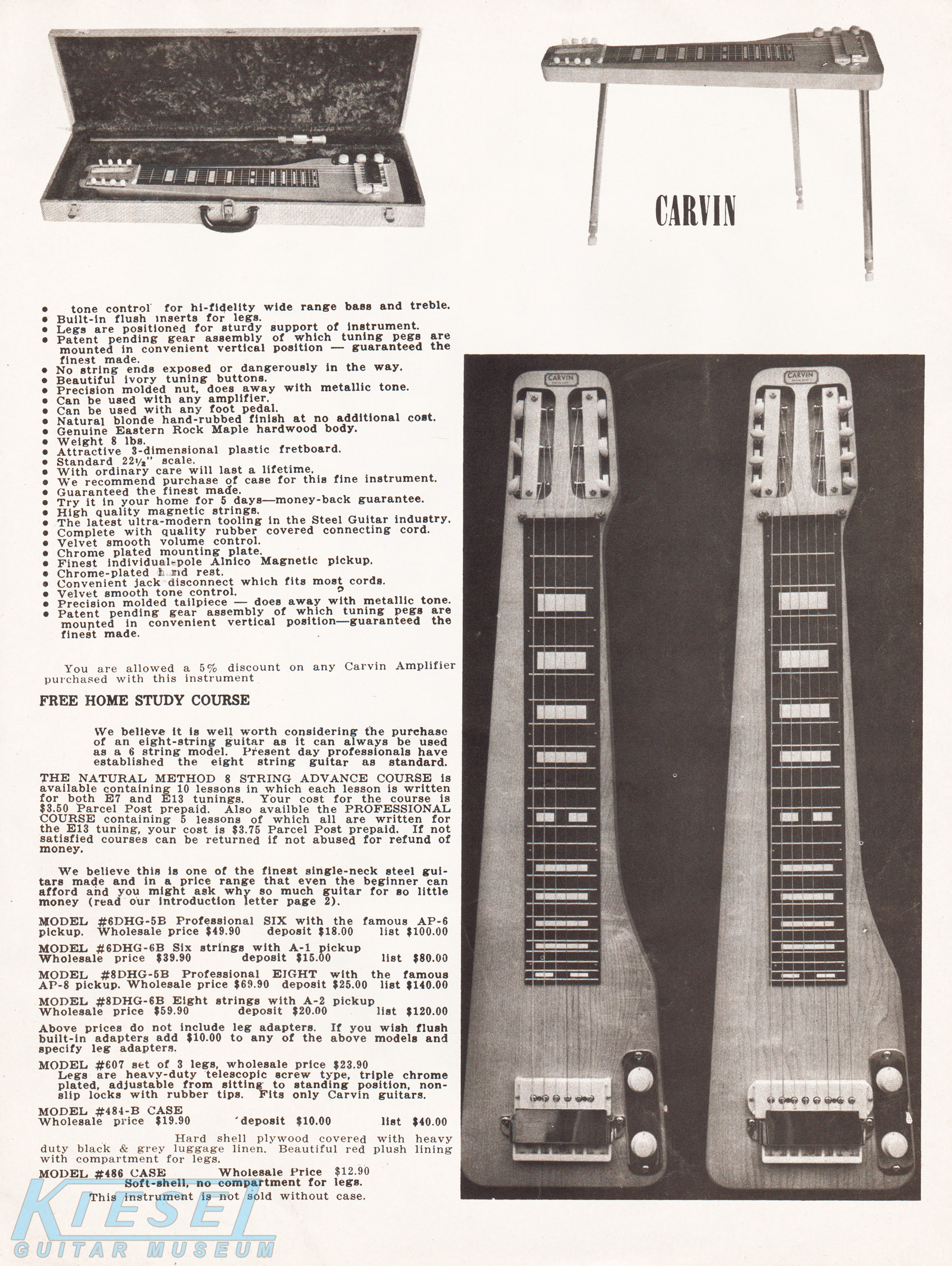 Carvin continued it's steel guitar tradition in 1963, offering single and doubleneck models, in 6 and 8 string configurations. Additionally, they offered a full line of accessories, including legs, cases and string changers.