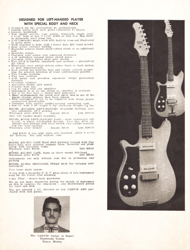 The Model #80-B and it's 6-string counterpart, the Model #60-B were Carvin's upscale single-neck models for 1963. They were similar in design to the DHG series, but had the 3-position tone changer (note the lever on the bridge) that allowed the guitar to be instantly retuned to A, E or Cm7. The model #80B sold for $129.90, and the 6-string #60B sold for $99.90.