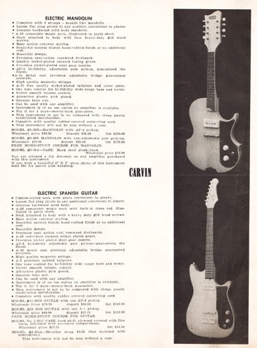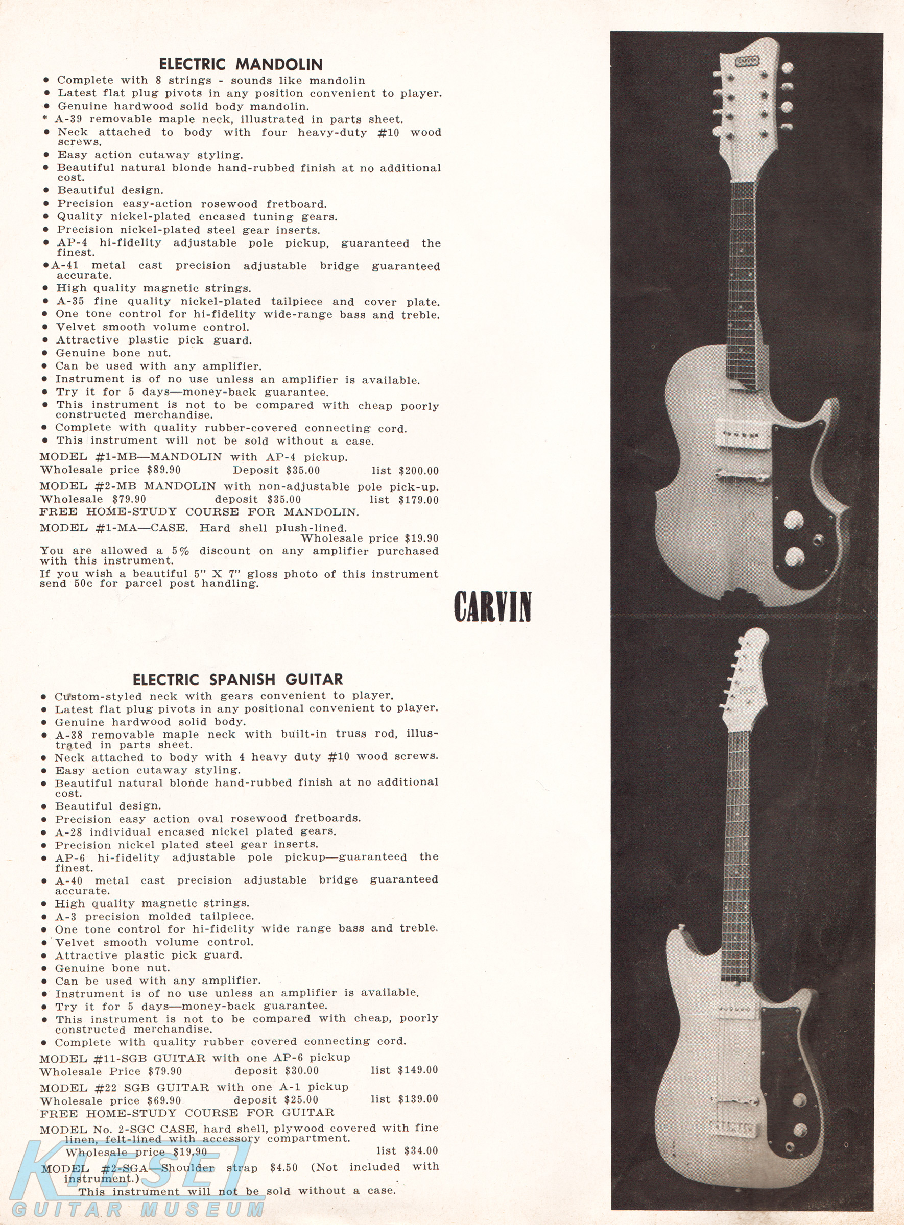 The Model #1-MB mandolin was unchanged from the 1962 model It had the same features and construction as Carvin's other 1962 models. Despite being unchanged, it still retained the design cues from Carvin's earliest guitars - notably, the outward points on the waist of the instrument. The Model #1-MB, with adjustable AP-4 pickup, sold for $89.90. It was also offered as the #2-MB, with a non-adjustable A-Series pickup, which sold for $79.90.