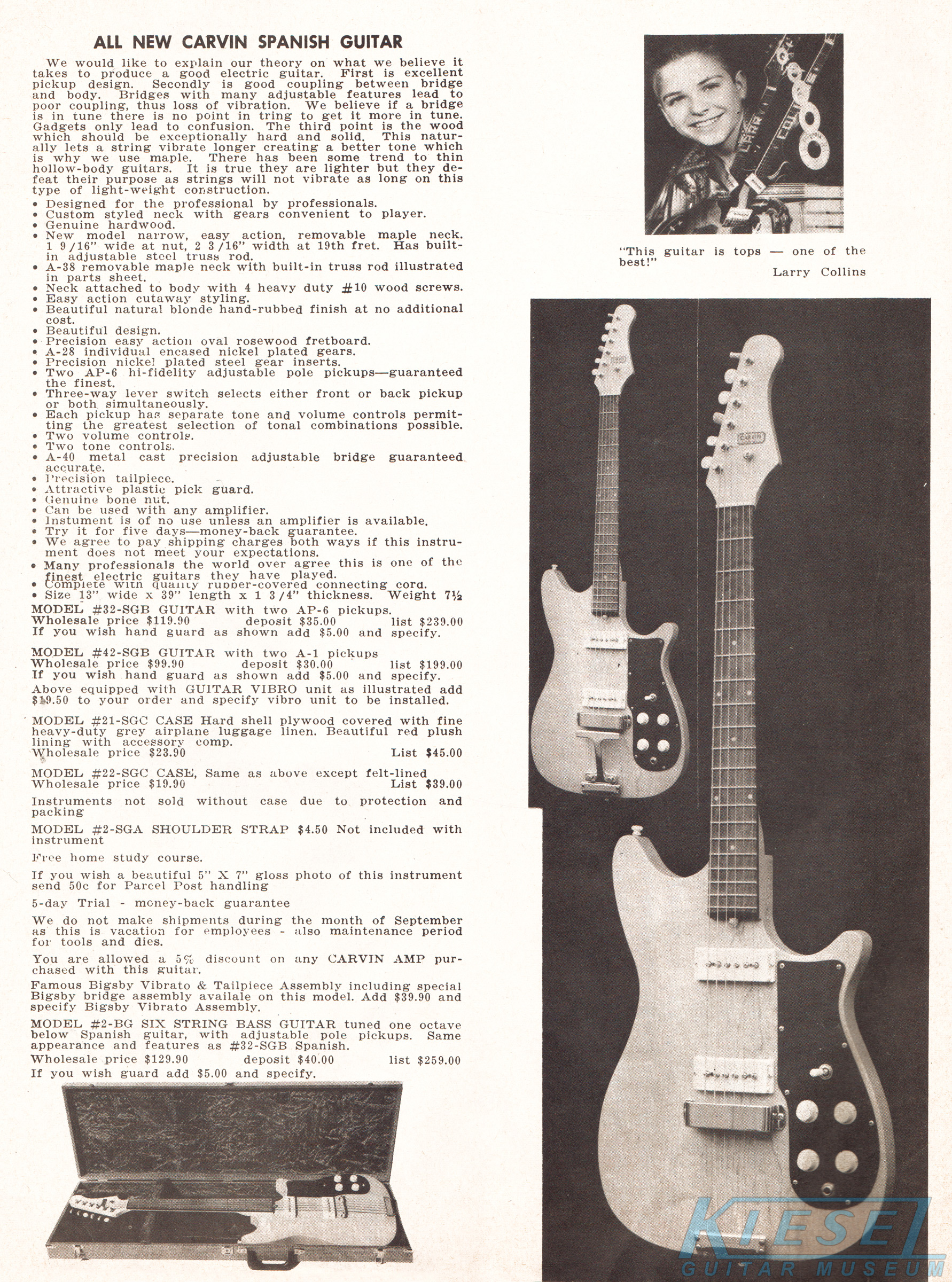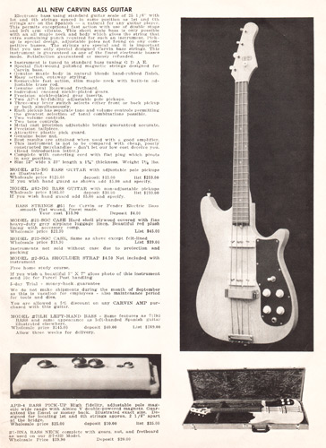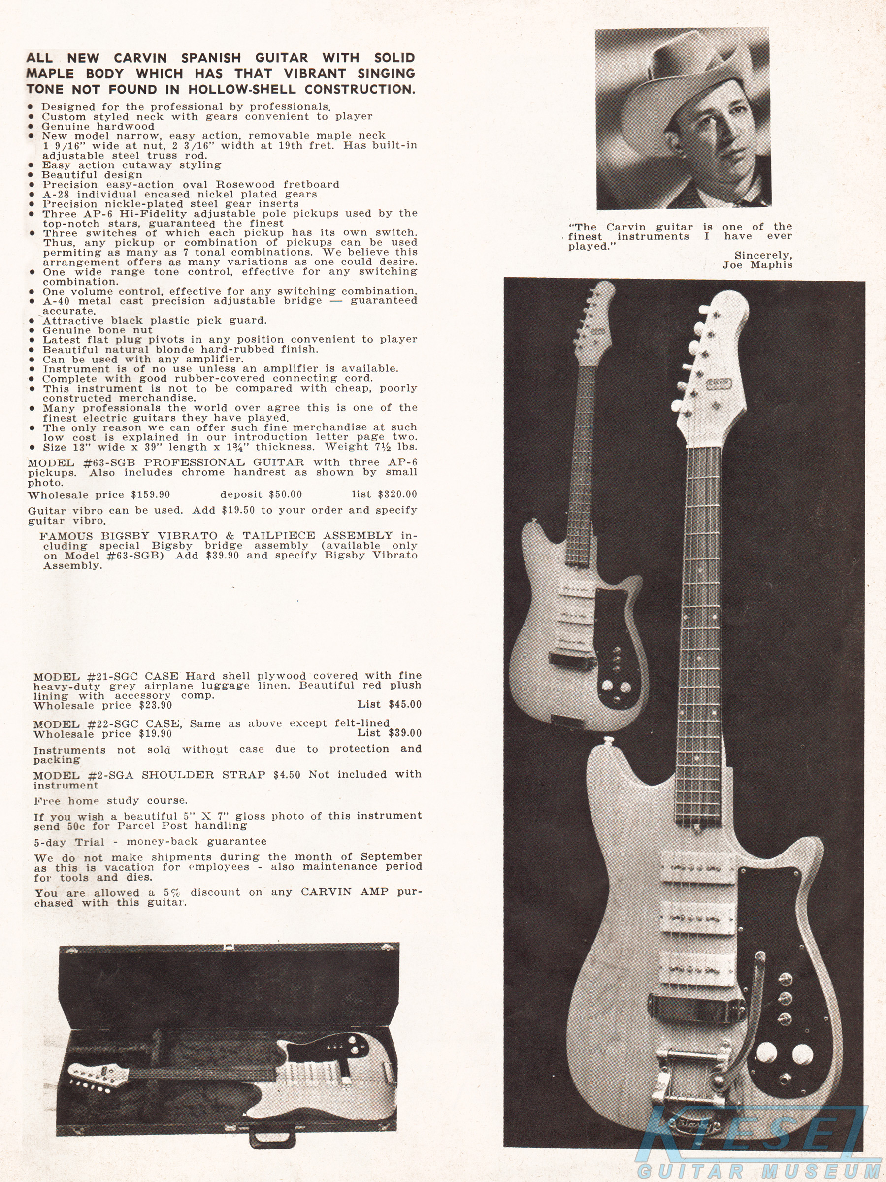 The Model #63-SGB was similar to the #62-SGB from the previous year, but it had one obvious and significant change - the addition of an optional Bigsby vibrato. This would be the first Carvin to offer a Bigsby, and would begin a tradition of these vibratos being used that would last into the 1970's. The other obvious change from the '62 model was the reconfiguration of the electronics. Instead of dual volume and tone controls, the #63-SGB had a master tone and volume control, with on/off switches for each pickup. As in 1962, the body wood was specified as "genuine hardwood", with a 19 fret, 25 1/8" scale maple neck with rosewood fingerboard. The #63-SGB sold for $159.90, and the optional Bigsby vibrato was $39.90. Carvin's own Guitar Vibro could also be used, and it was $19.50.
