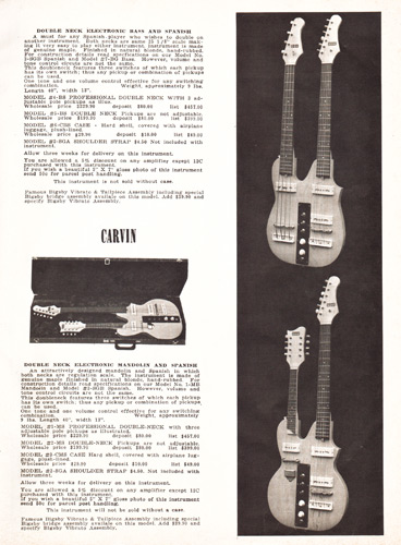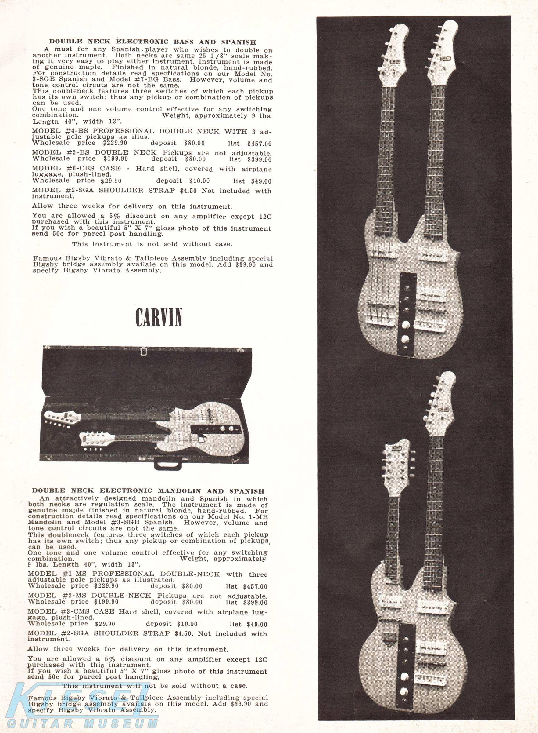 Both of Carvin's doubleneck models were redesigned for 1963. Primarily, the bodies were redesigned to more closely match the solid-body guitars, which meant the outward point on the upper waist (similar to the #1-MB mandolin) was removed. The electronics configuration on both was changed, also - instead of 2 volume and 2 tone controls with a 3-way pickup selector switch, these new models had a master volume and master tone control with an on/off switch for each pickup, which meant any combination of the 3 pickups could be used at the same time. The Model #1-MS had the same features as the Model #32-SGB guitar and #1-MB mandolin. It sold for $229.90, and was also offered as the #2-MS, which had non-adjustable A-Series pickups, and sold for $199.90. The Bigsby vibrato was offered on the guitar neck for an additional $39.90. The Model #4-BS had the same features as the #32-SGB guitar and the #72-BG bass. The #4-BS sold for $229.90, and the #5-BS (without adjustable pickups) sold for $199.90. The Bigsby vibrato was also offered on this model.