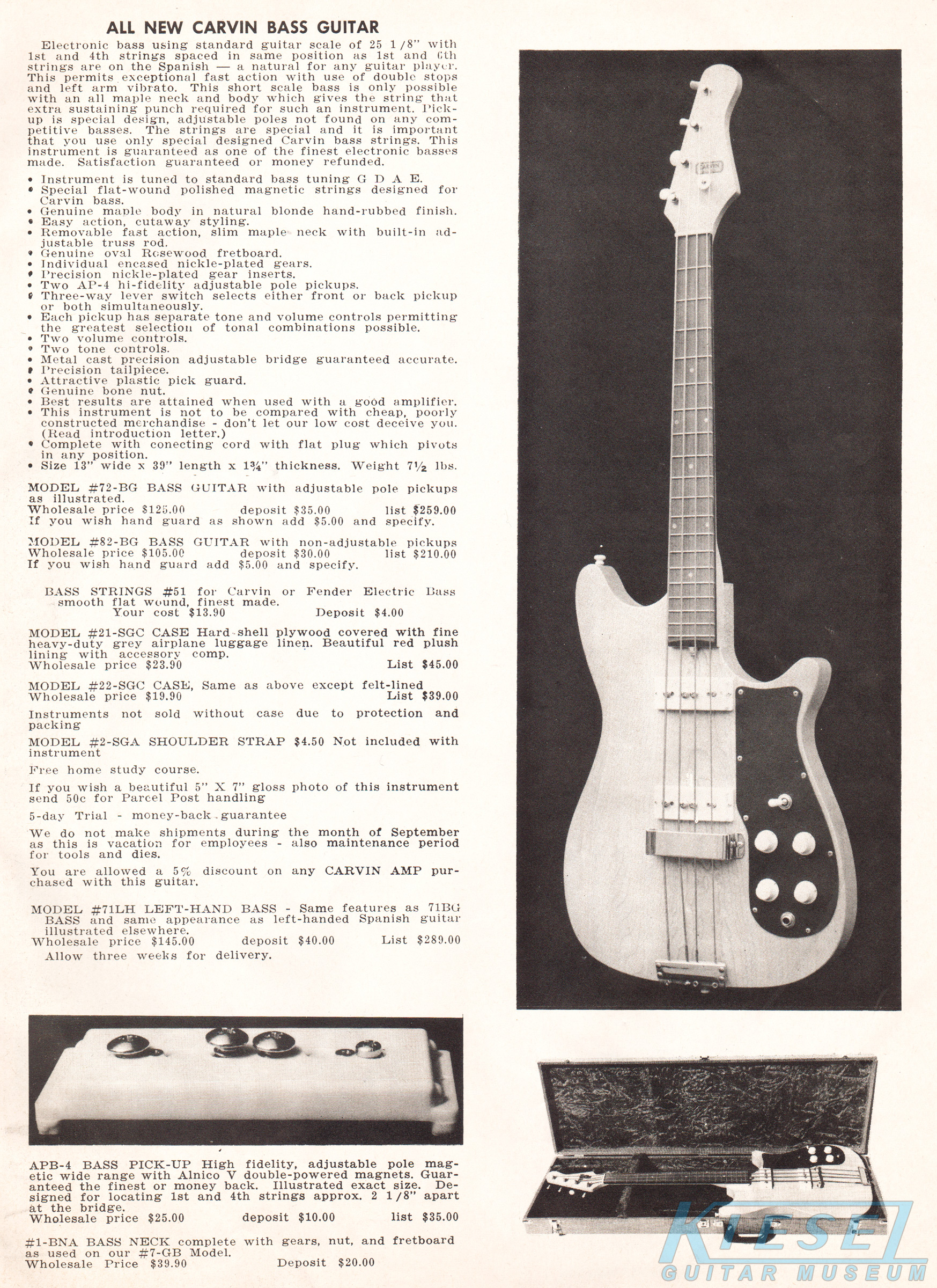 The Model #72-BG bass was unchanged for 1963. This bass was made from maple, with a clear hand-rubbed finish, with a 25 1/8" short scale maple neck with rosewood fingerboard. Electronics consisted of two AP-4 pickups with adjustable pole pieces, and volume and tone controls for each, and a 3-way pickup selector. Other features included a bone nut, cast metal bridge and tailpiece and plastic pickguard. Prices remained the same, with the model #72-BG selling for $125.00, and the model #82-BG, which was the same as the #72-BG, except for non-adjustable pickups, selling for $105.00.