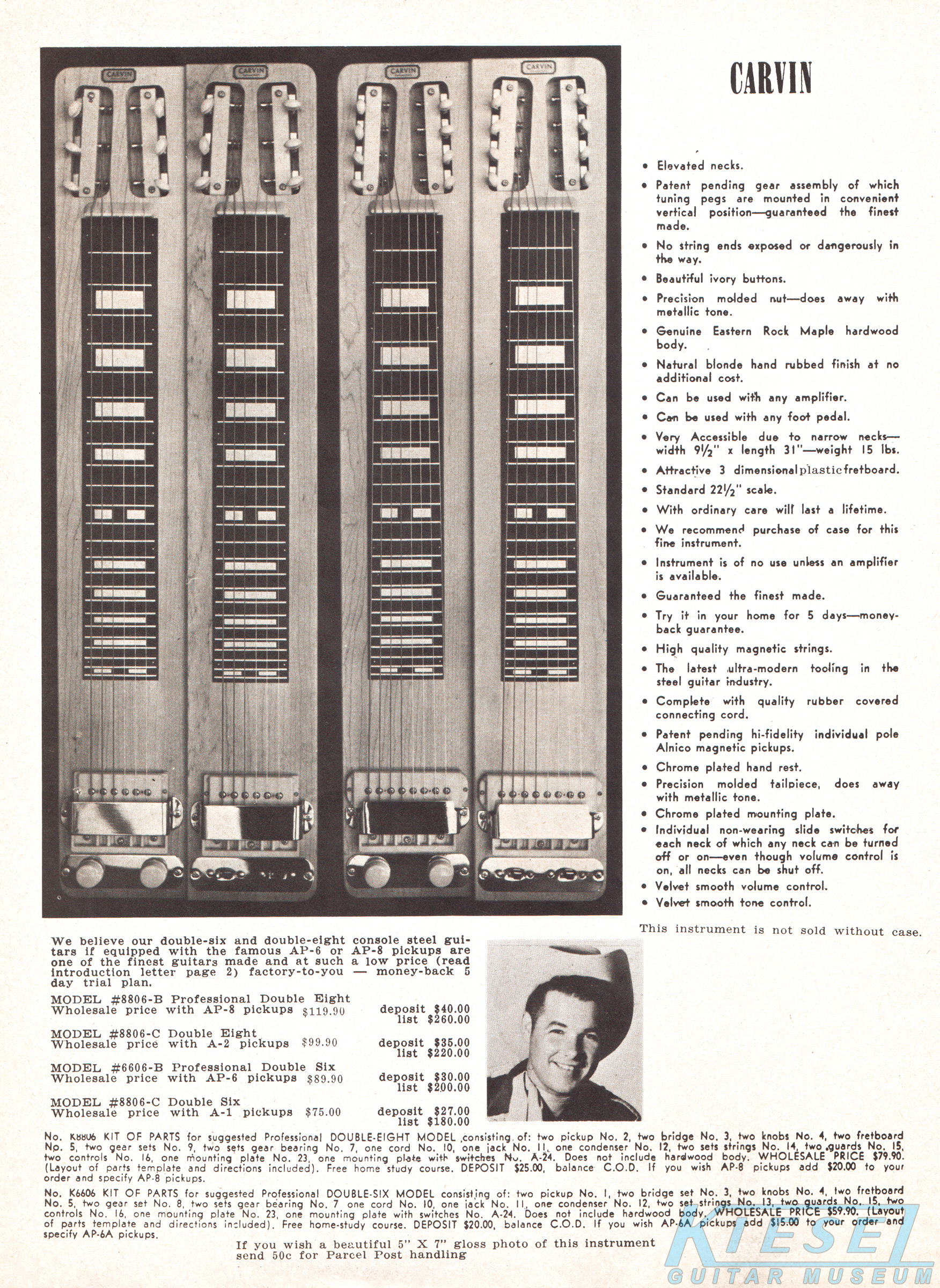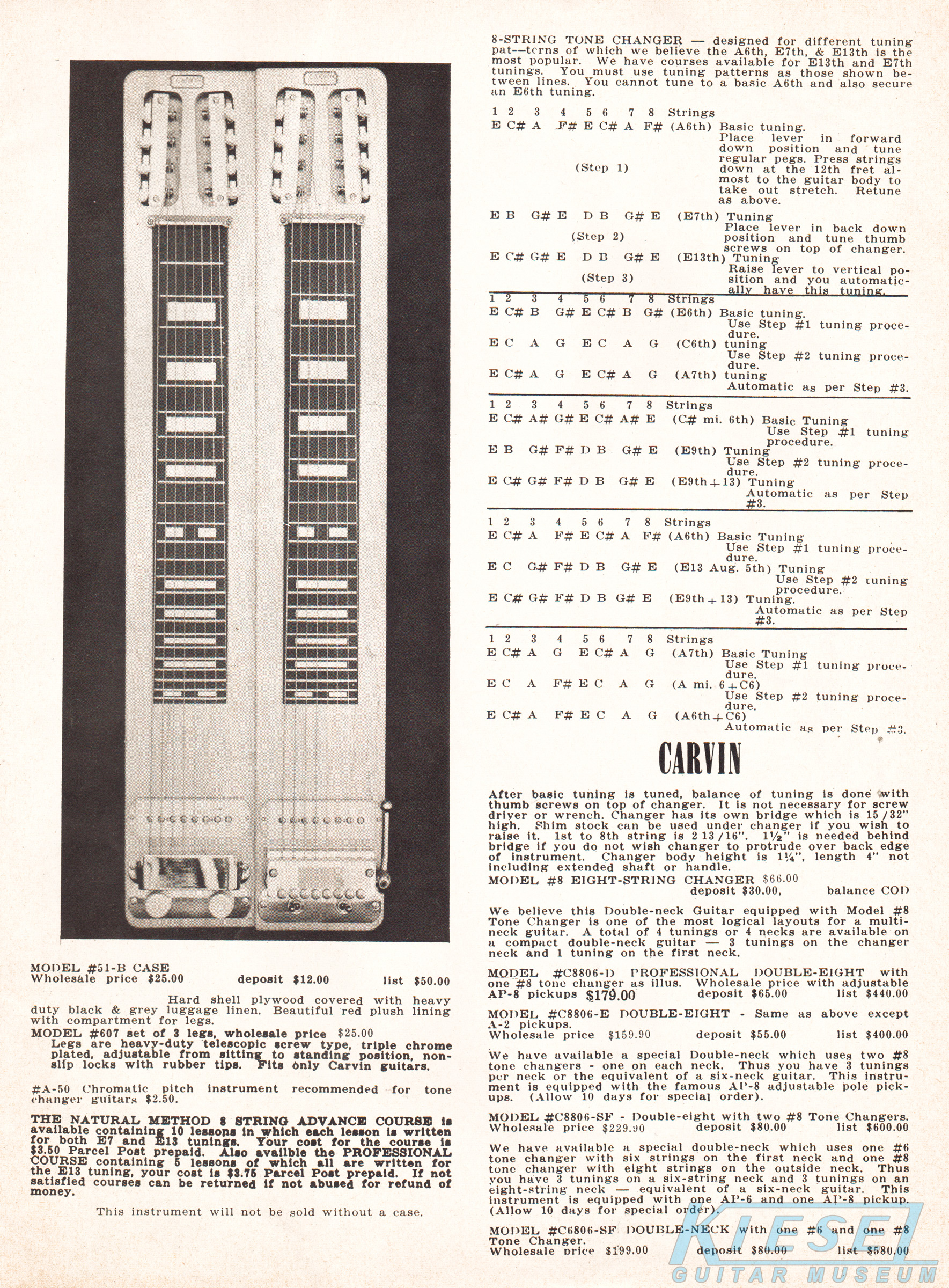 The model #C8806-D was a double-8 steel guitar, that had the 3-position changer on the outer neck. Construction & materials were the same as other Carvin steel guitars. The #C8806-D with adjustable AP series pickups sold for $179, and the #C8806-E, with non-adjustable pickups, sold for $159.90. There were some other variants available, such as the #C8806-SF, which had two tone changers on 8-string necks, and the #C6806-SF, which was a 6-string/8-string doubleneck with tone changers on each neck.