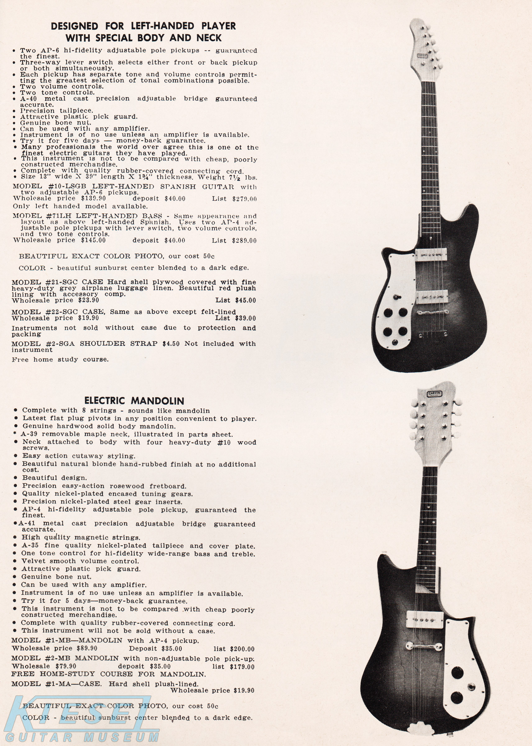 The Model #1-MS was a doubleneck 6-string guitar/mandolin combination. The guitar was based on the #35-SGB guitar, and the mandolin was based on the #1-MB mandolin. Necks were maple with rosewood fingerboards and the body was finished in Sunburst on maple. Electronics consisted of two AP-6 adjustable pickups on the guitar neck, and 1 AP-4 adjustable pickup on the mandolin neck, with master volume and tone controls, and on/off switches for each pickup. The #1-MS sold for $229.90, and the #2-MS, which was identical except for non-adjustable pickups, sold for $199.90. The #3-CMS case sold for $29.90.