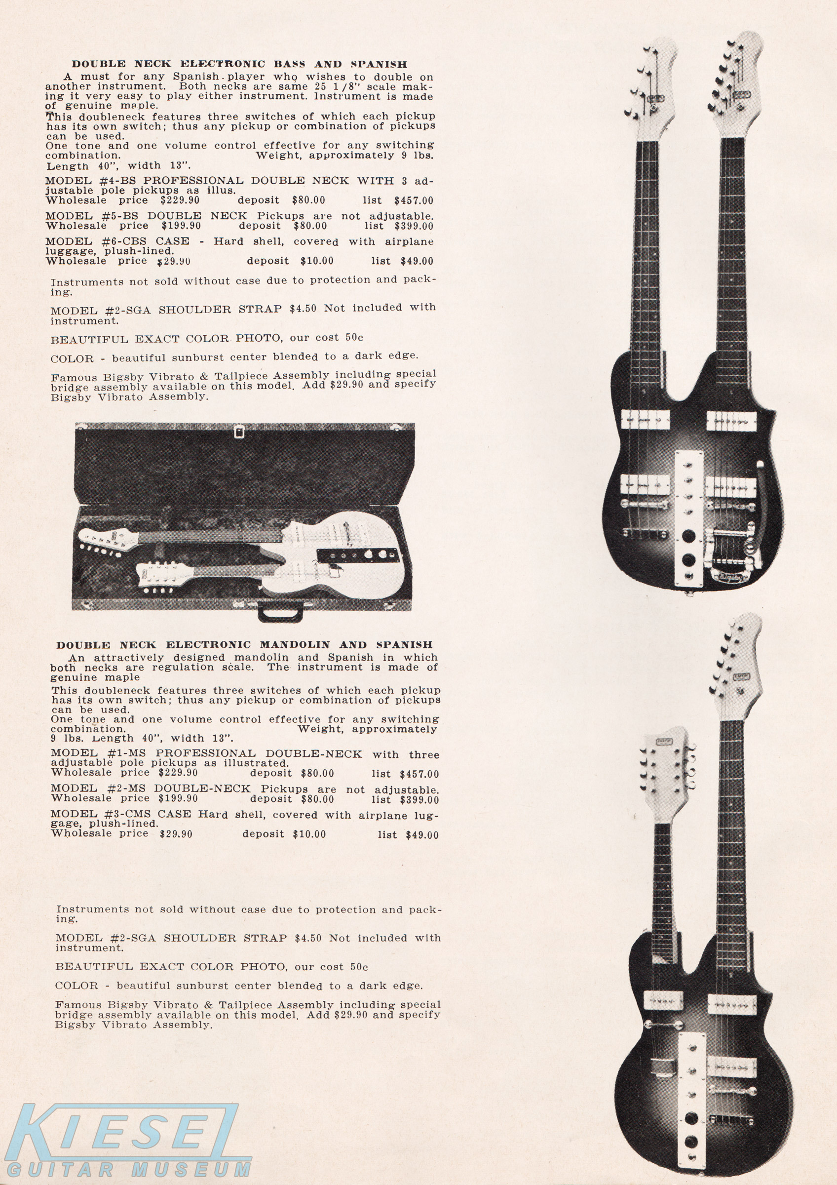 The Model #4-BS doubleneck Spanish guitar/bass retained the same basic shape as it had at the beginning of the decade, but with improved features. Pickups were available in adjustable or non-adjustable configurations, and the electronics were rounded out by a single tone and volume control, with individual on-off switches for each one, allowing any combination of pickups to be used. The #4-BS with adjustable pickups sold for $229.90, and the #5-BS, with non-adjustable pickups, sold for $199.90. A Bigsby vibrato tailpiece could be added for an additional $29.90. The #6-CBS hardshell case was an additional $29.90.