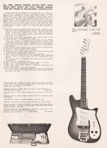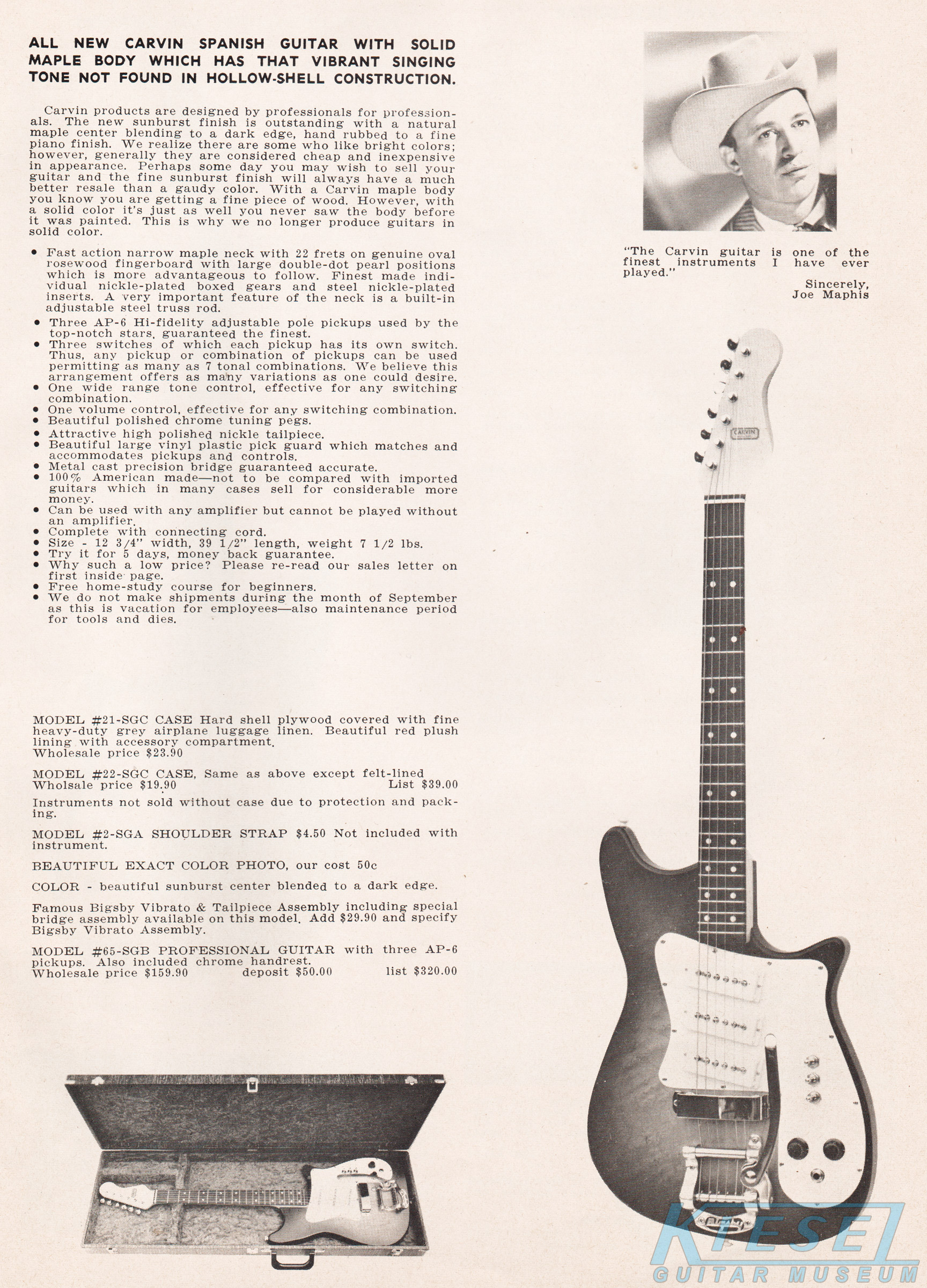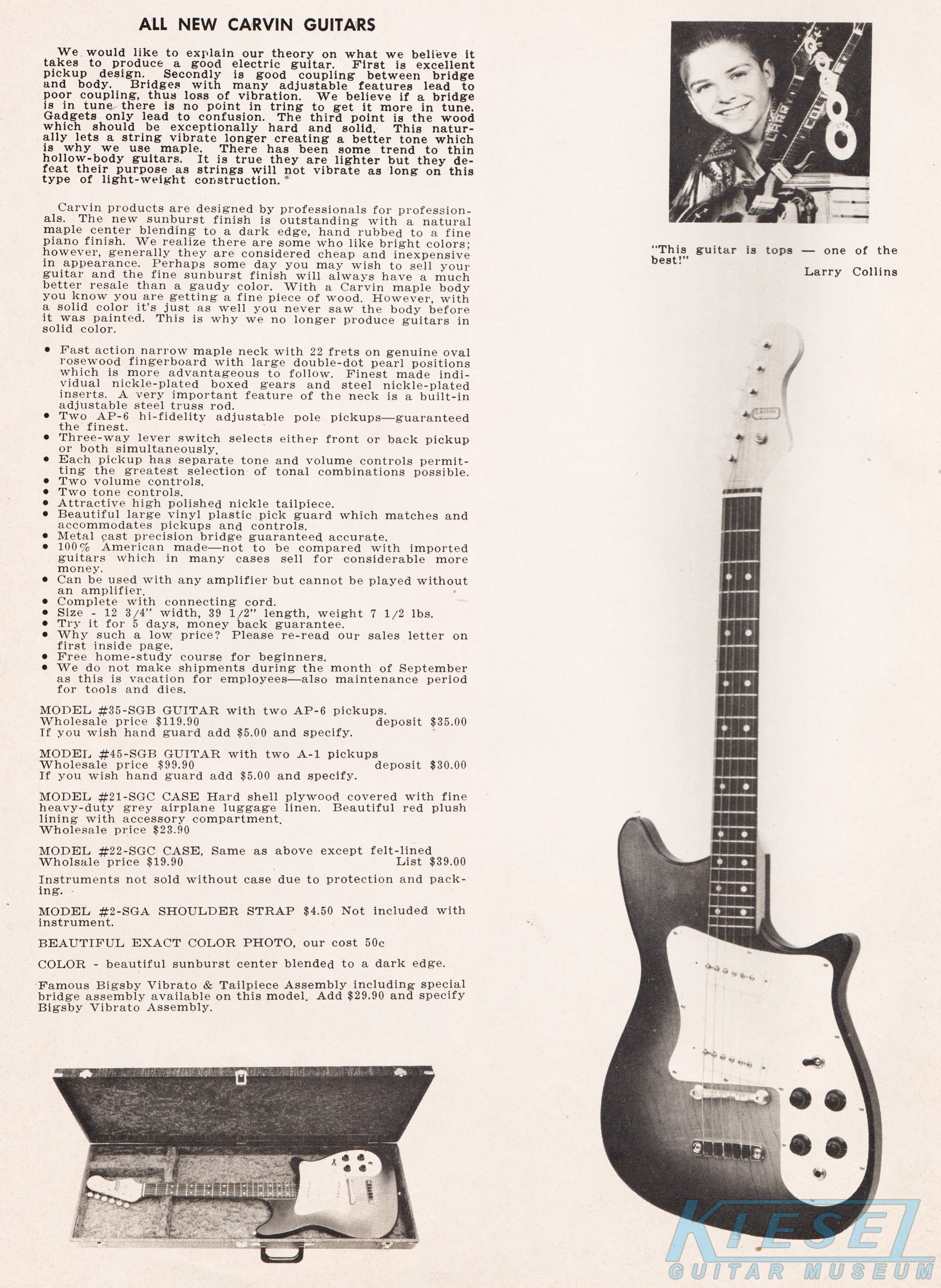 The Model #35-SGB was a 22-fret, bolt maple neck guitar, available in Sunburst finish a on maple body. Like other Carvins of the era, it had a rosewood fingerboard, MOP dot inlays, and a steel adjustable truss rod. The tuners, bridge and tailpiece were chrome, but the manufacturer of these items was not explicitly stated. Electronics consisted of Carvin's adjustable AP-6 pickups, with volume and tone controls for each, as well as a 3-way pickup selector switch. The price on this guitar was $119.90, and the model #21-SGC case was an additional $23.90. A felt-lined case, the #22-SGC, was also offered for $19.90. Also available was the Model #45-SGB guitar. This was the same as the #35-SGB, except it used the non-adjustable A-1 pickups. Price on this model was $99.90. The Bigsby Vibrato was available as an option on both these models for an additional $29.90. A chrome handrest which covered the bridge was also available as an option on either model for $5.00.