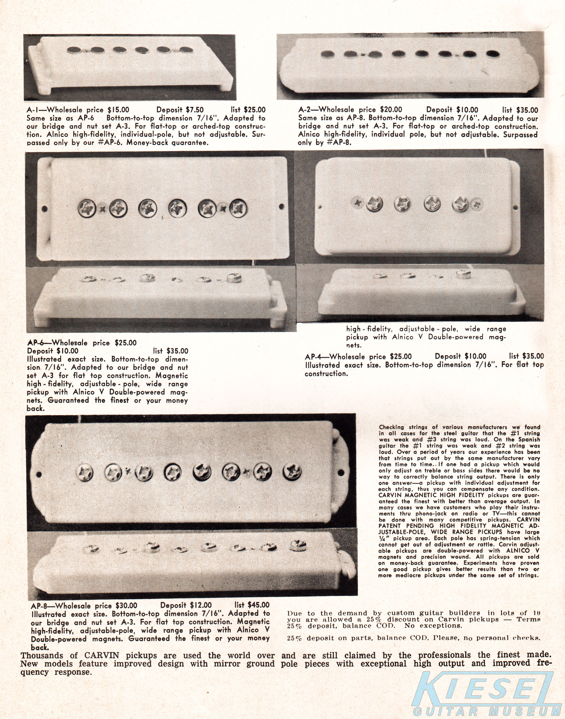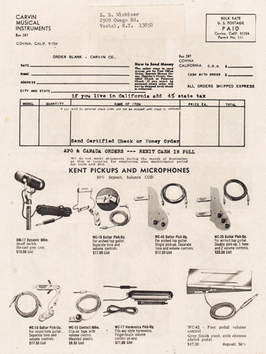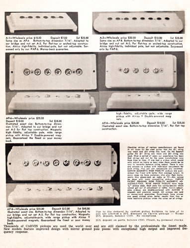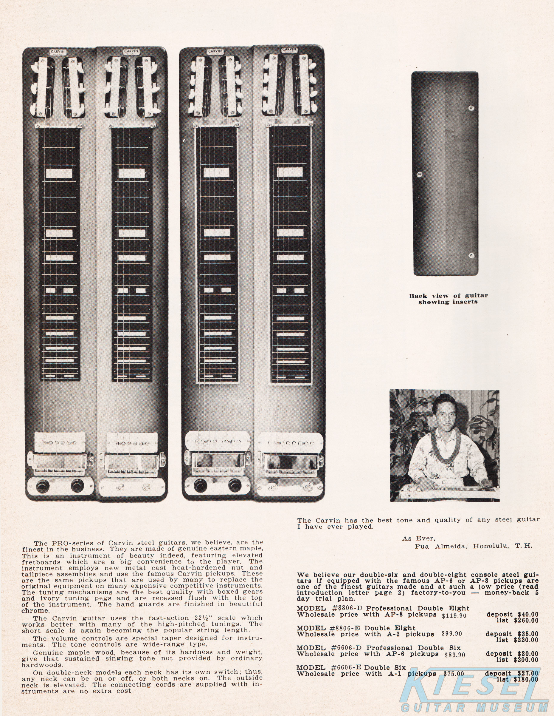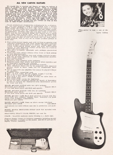 Carvin also offered doubleneck steel guitars in 1966, as they had for many years. The #6606-D was a double six, with the same features of it's single-neck counterpart. The electronics were also the same, with a pair of AP-6 pickups and master volume/tone controls. The #6606-D sold for $89.90, and was available as the #6606-E with non-adjustable A-1 pickups for $75.00. The #8806-D double eight was the same as it's single-neck counterpart, and had two AP-8 pickups. Price on it was $119.90. The #8806-E, with A-2 non-adjustable pickups, sold for $99.90.