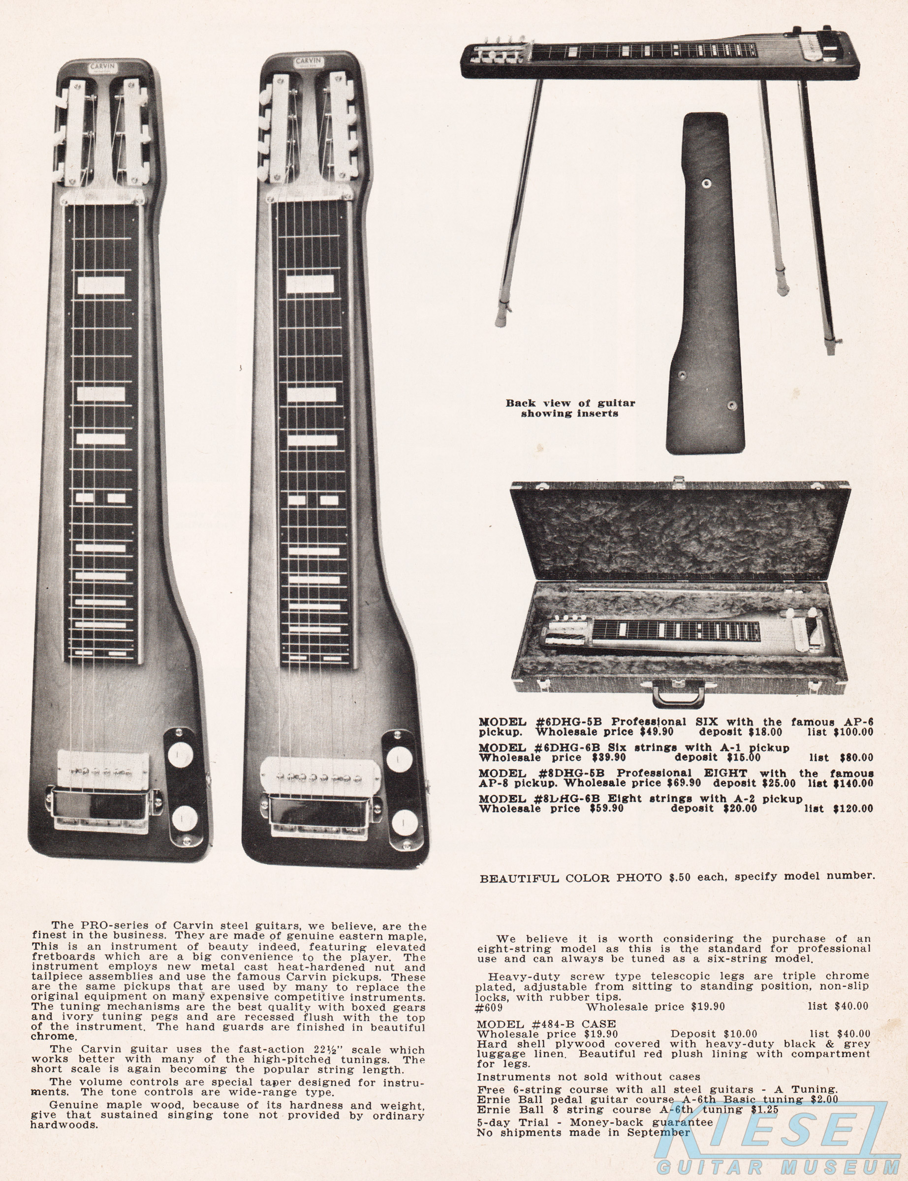 The Model #6DHG-5B six-string lap steel guitar was constructed with the same high-quality materials and techniques as Carvin's other instruments - in this case, Eastern hardrock maple with sunburst finish, ivory tuning pegs and metal cast heat-hardened nut and tailpiece. Electronics consisted of an AP-6 pickup with single volume and tone controls. This model sold for $49.90. The #8DHG-5B was an 8-string version of the #6DHG-5B. Features were the same, except this model used an AP-8 pickup. The 8-string version was $69.90. Also available was the #6DHG-6B and #8DHG-6B, both of which were the same as the above models, but used the A-1 or A-2 non-adjustable pickups. Prices on these models were $39.90 and $59.90, respectively. Available options for these models included chrome-plated telescoping legs ($19.90) and the #484-B hardshell case ($19.90).