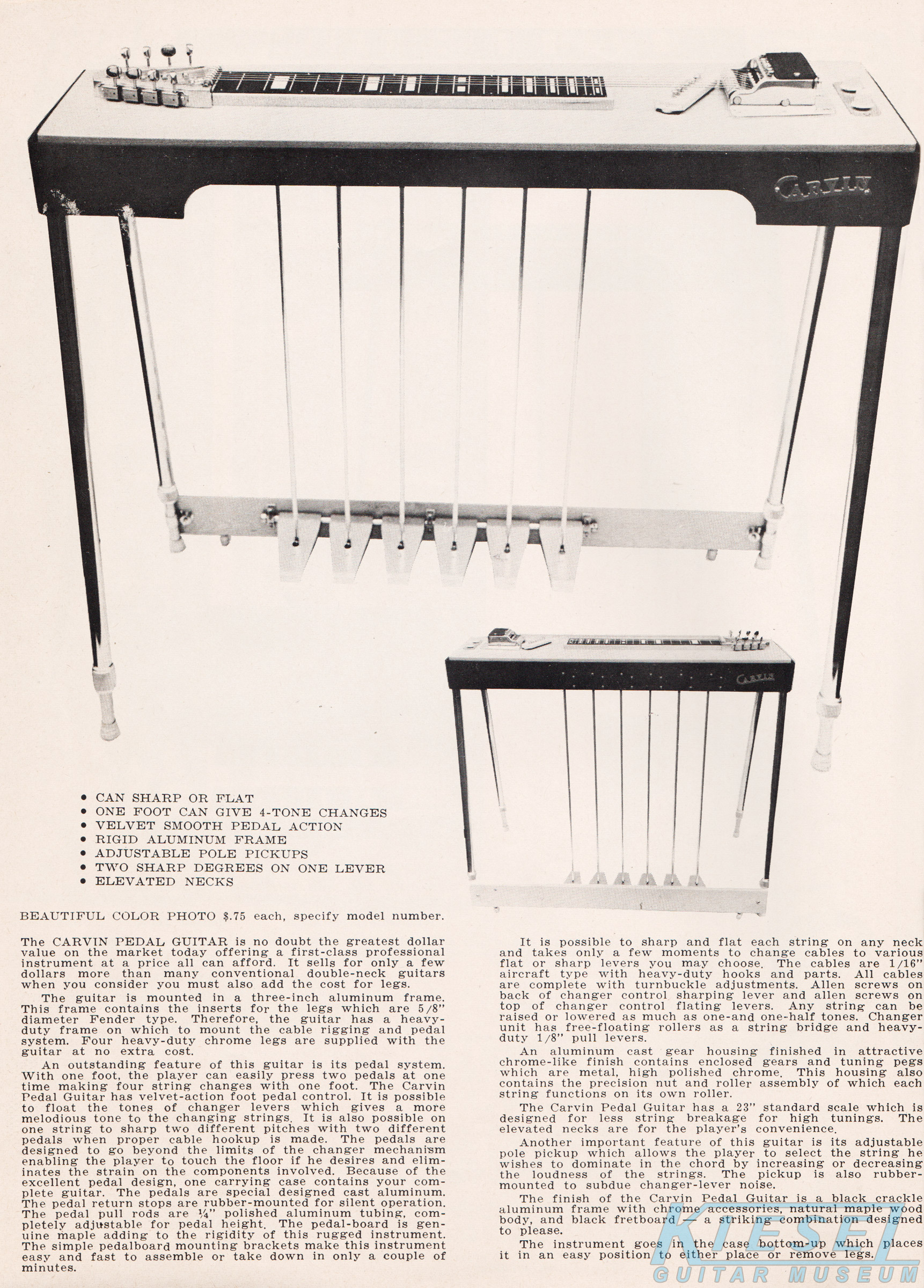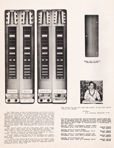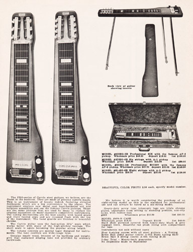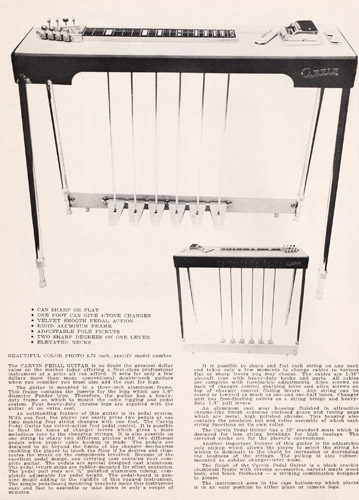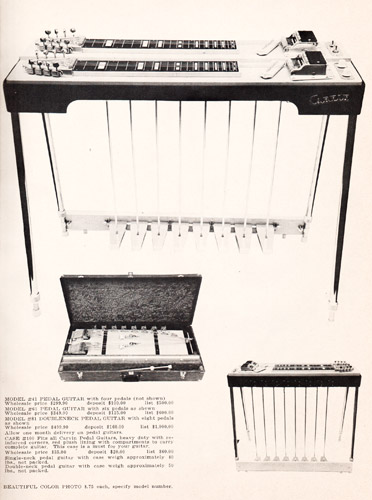 The 8-string Model #61 Pedal Guitar had a 6-pedal assembly could be connected in a variety of ways, but it's basic function was to allow the player to sharpen or flatten the pitch of any string while playing. The body of the guitar was made from natural-finished maple, with chrome hardware, and an AP-8 pickup. Price on this model was $349.90, and the #100 case was $35.00. Not shown was the model #41 Pedal Guitar, which was the same as the #61, but with 4 pedals. It sold for $299.90.