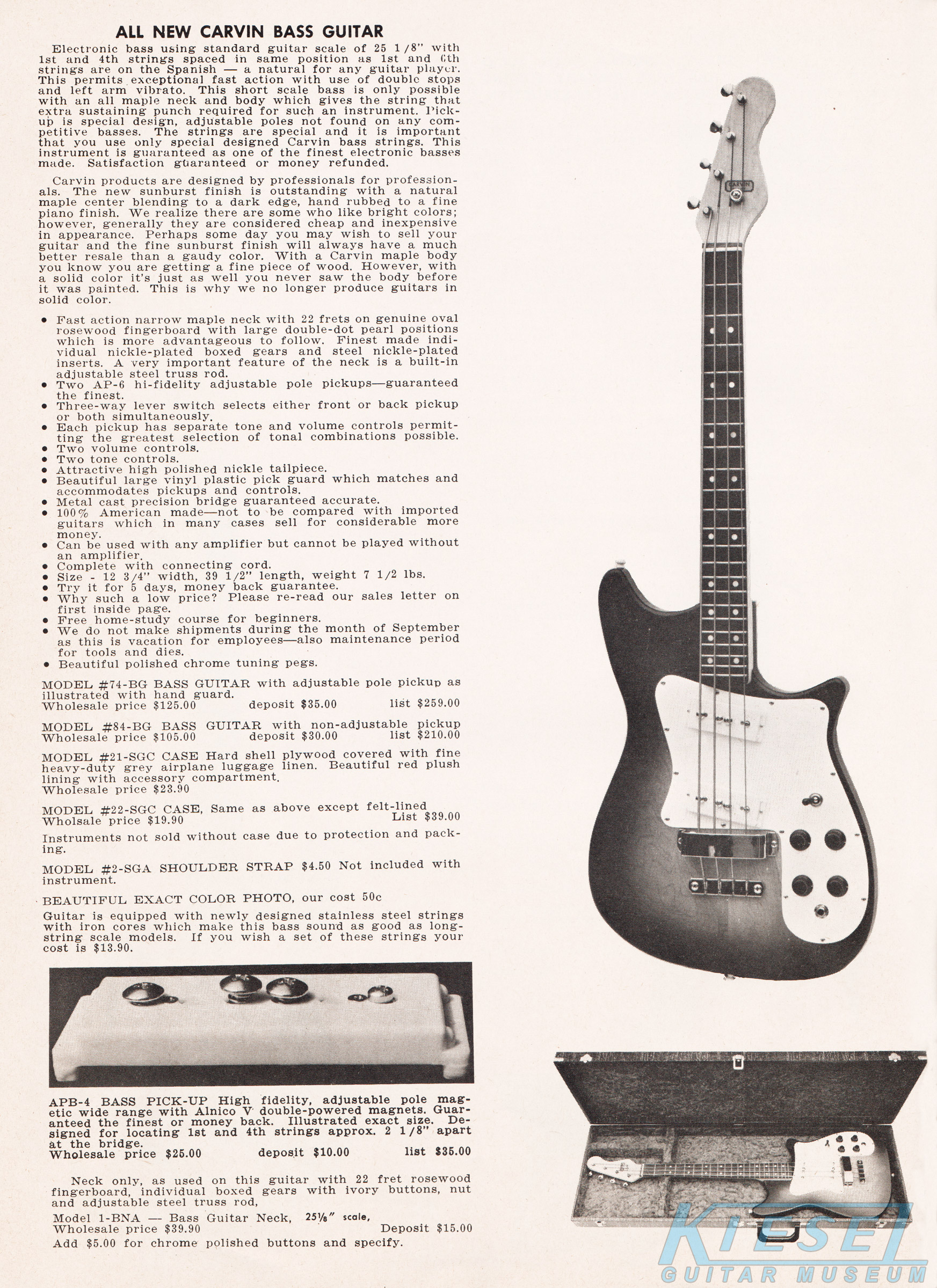 The #73-BG bass that was introduced in 1965 was retired, and replaced by the upgraded #74-BG. The most obvious difference between these models was the new, full size pickguard and slanted pickups, a feature that was common on Carvin basses and guitars of the era. The remainder of the features were essentially the same as the '65 model, with AP-6 (adjustable) or APB-4 (non-adjustable) pickups, dual volume & tone controls, and a pickup selector switch. The sunburst finish body and neck were made from maple. Interestingly, the catalog said: "Perhaps some day you may wish to sell your guitar and the fine sunburst finish will always have a much better resale than a gaudy color." My, how things change! But, at the time, sunburst finishes were the rage. Other features included a rosewood fretboard with double-dot pearl inlays, nickel tailpiece, nickel-plated tuners and a steel truss rod. The #74-BG, with adjustable pickups, sold for $125, and the #84BG, with non-adjustable pickups, sold for $105. The plush-lined #21-SGC hardshell case was $23.90, and the felt-lined #22-SGC hardshell case was $19.90.