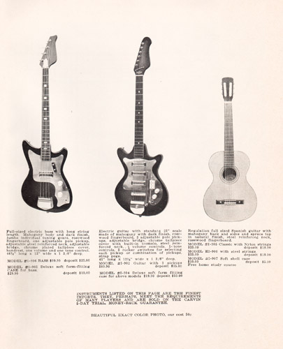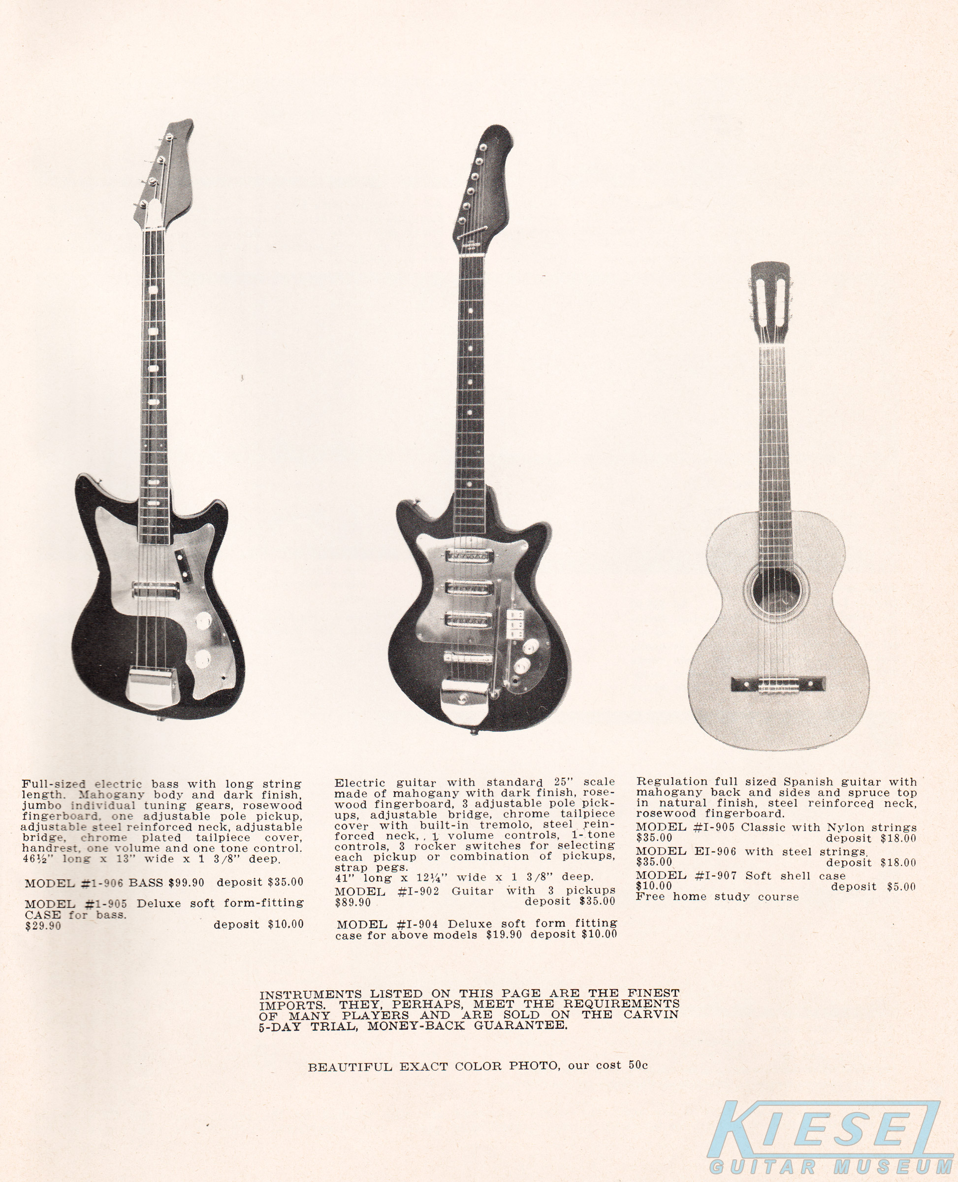 The #I-902 was a lower-cost, import model offered by Carvin in 1966 and probably made by Teisco. The body was mahogany, with rosewood fingerboard, adjustable bridge and chrome tailpiece/tremolo. Electronics consisted of 3 adjustable pickups, with master volume/tone controls, and on/off rocker switches for each pickup. Price on the #I-902 was $89.90, and the #I-904 soft case was $19.90.