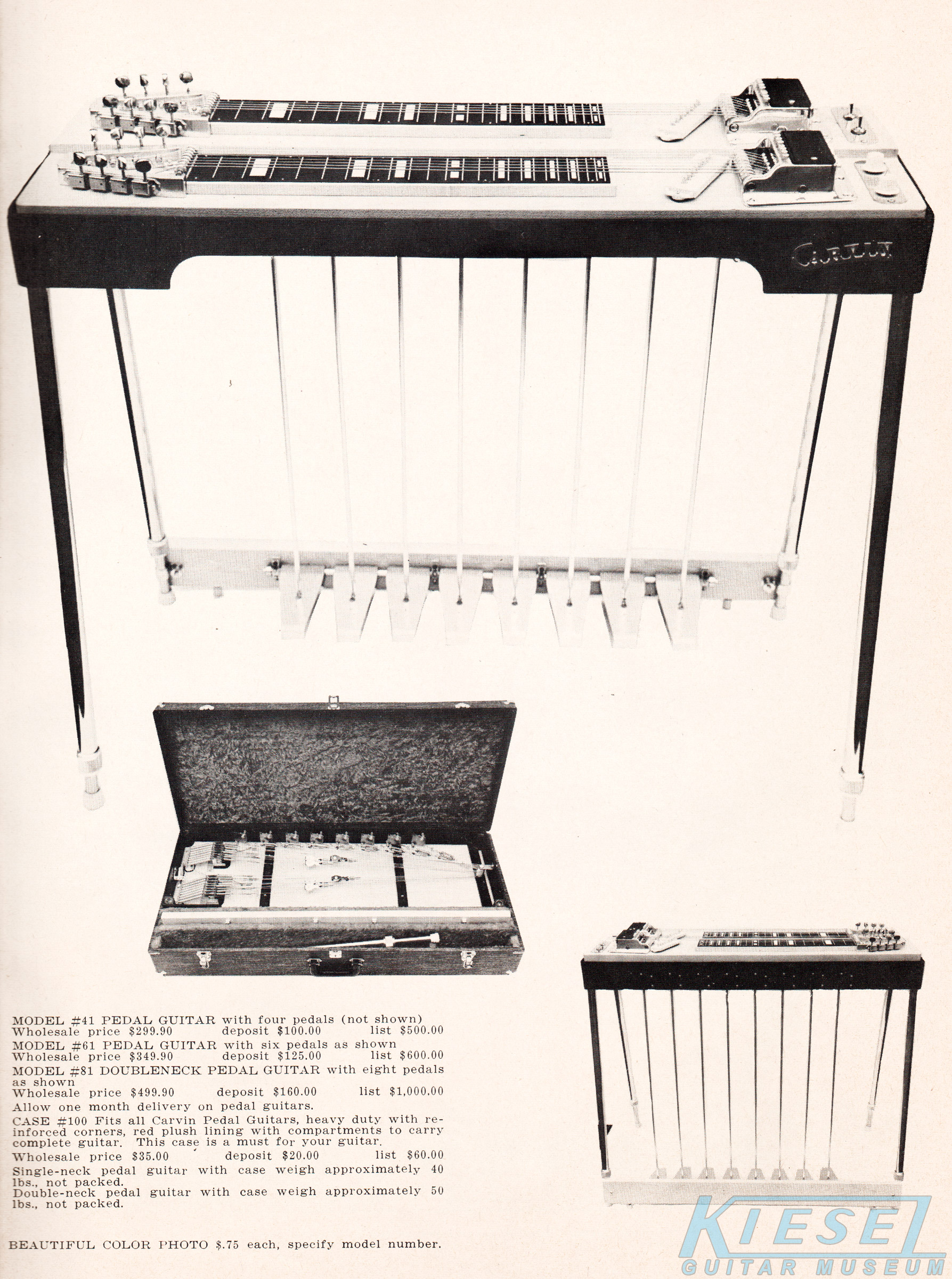 The Model #81 Doubleneck Pedal Guitar (above) was similar to it's single-neck counterparts, with two 8-string necks and 8-string pedals. Construction and features were the same as the others, and this model carried a direct price of $499.90.