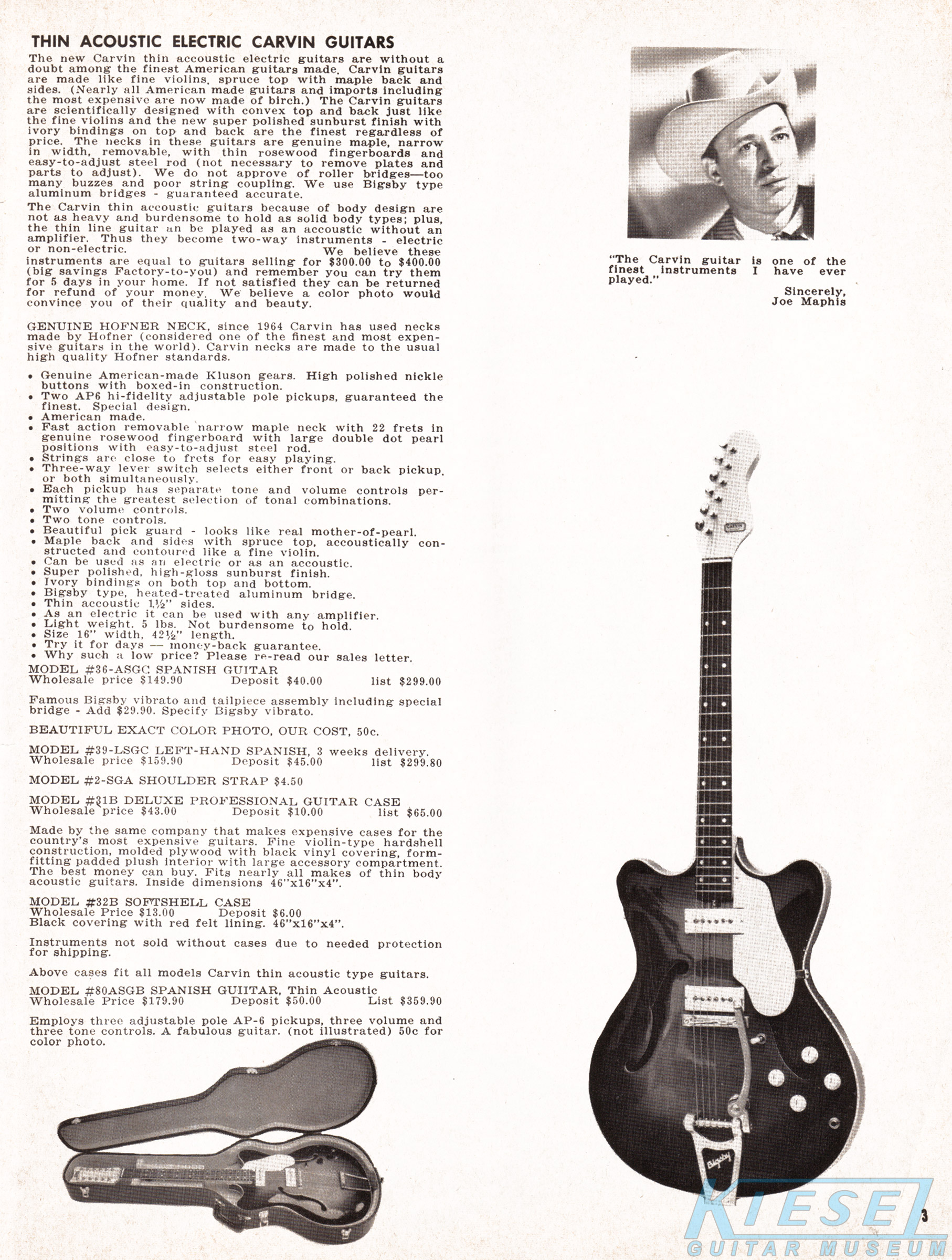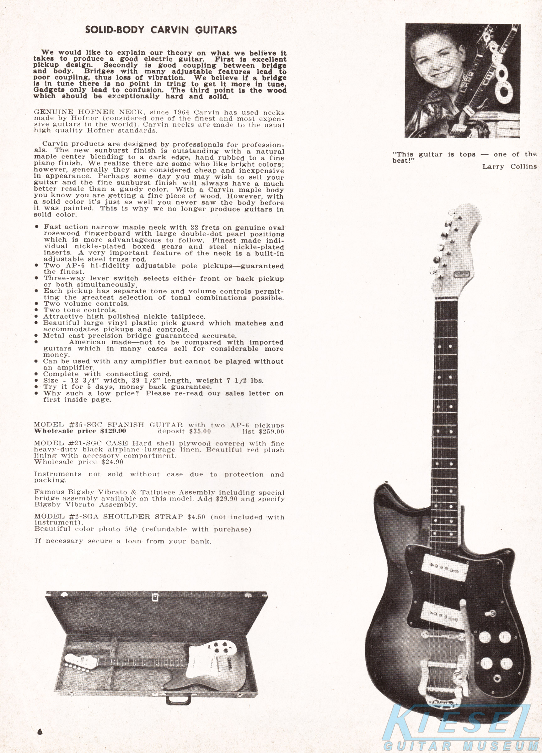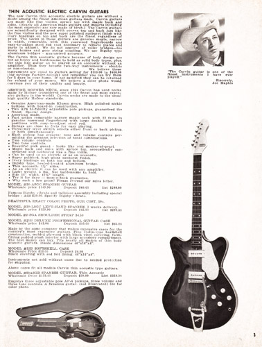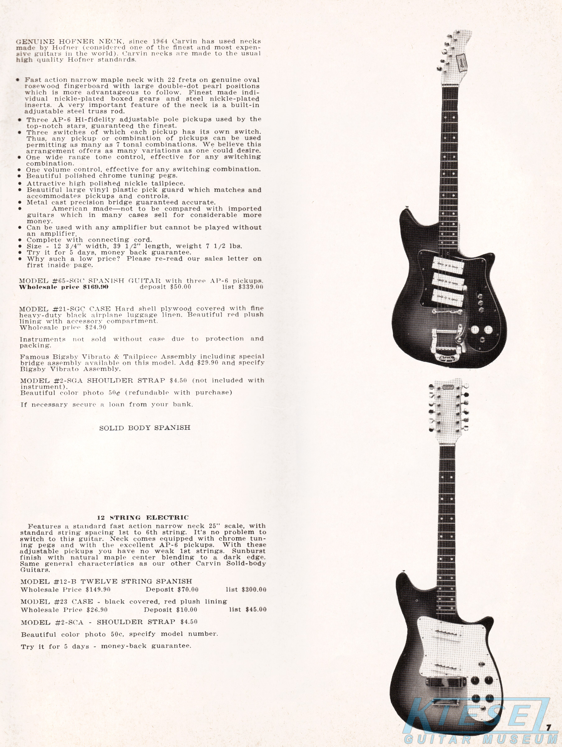 The Model #65-SGC Spanish guitar was similar to the #35-SGC, but it had three AP-6 pickups, versus 2 as on the #35. Controls consisted of a master volume and tone, and an on/off switch for each pickup, which allowed 7 different combinations of pickups to be in use at once. Like other Carvin guitars of the era, the neck was made by Höfner with a rosewood fingerboard, and the body was maple with sunburst finish. The #65-SGC sold for $169.90, and the Bigsby vibrato was an additional $29.90. The #21-SGC case sold for $24.90.