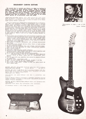 First up is the Model #35-SGC Spanish guitar. Even in the late 60's, Carvin referred to electric 6 string instruments as "Spanish" guitars, although this was actually a standard regular 6-string electric. This model was constructed from a maple Hofner neck with rosewood fingerboard and a maple body with a sunburst finish. Electronics consisted of a pair of Carvin AP-6 pickups, with dual volume and tone controls and three-way selector switch. The manufacturer of the tuners, bridge and tailpiece was not specified, although a Bigsby vibrato tailpiece was available as an option. Base price on the #35-SGC was $129.90 with a standard bridge/tailpiece assembly, and the Bigsby was an additional $29.90. The #21-SGC hardshell case was an additional $24.90.