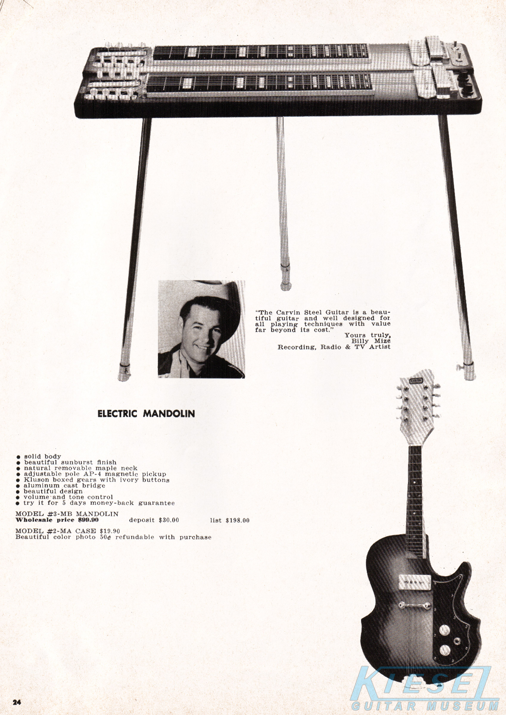Carvin also offered an electric mandolin in 1969, the Model #3-MB. This instrument had a solid body with male bolt-on neck, single AP-4 pickup with volume and tone controls and Kluson tuners. It sold for $99.90, plus $19.90 for the #2-MA case.