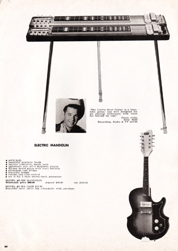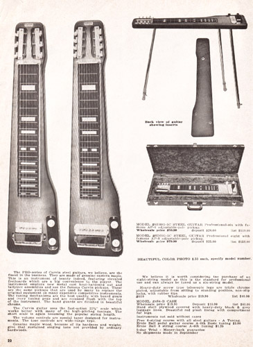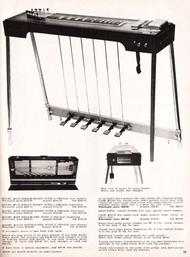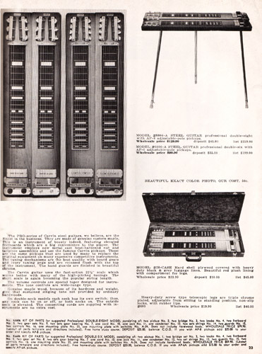 There were also doubleneck steels offered. These models had the same quality construction features as their single-neck counterparts, in a double-6 or double-8 configuration. The Model #6606-A sold for $99.90, and the Model #8806-A sold for $129.90.