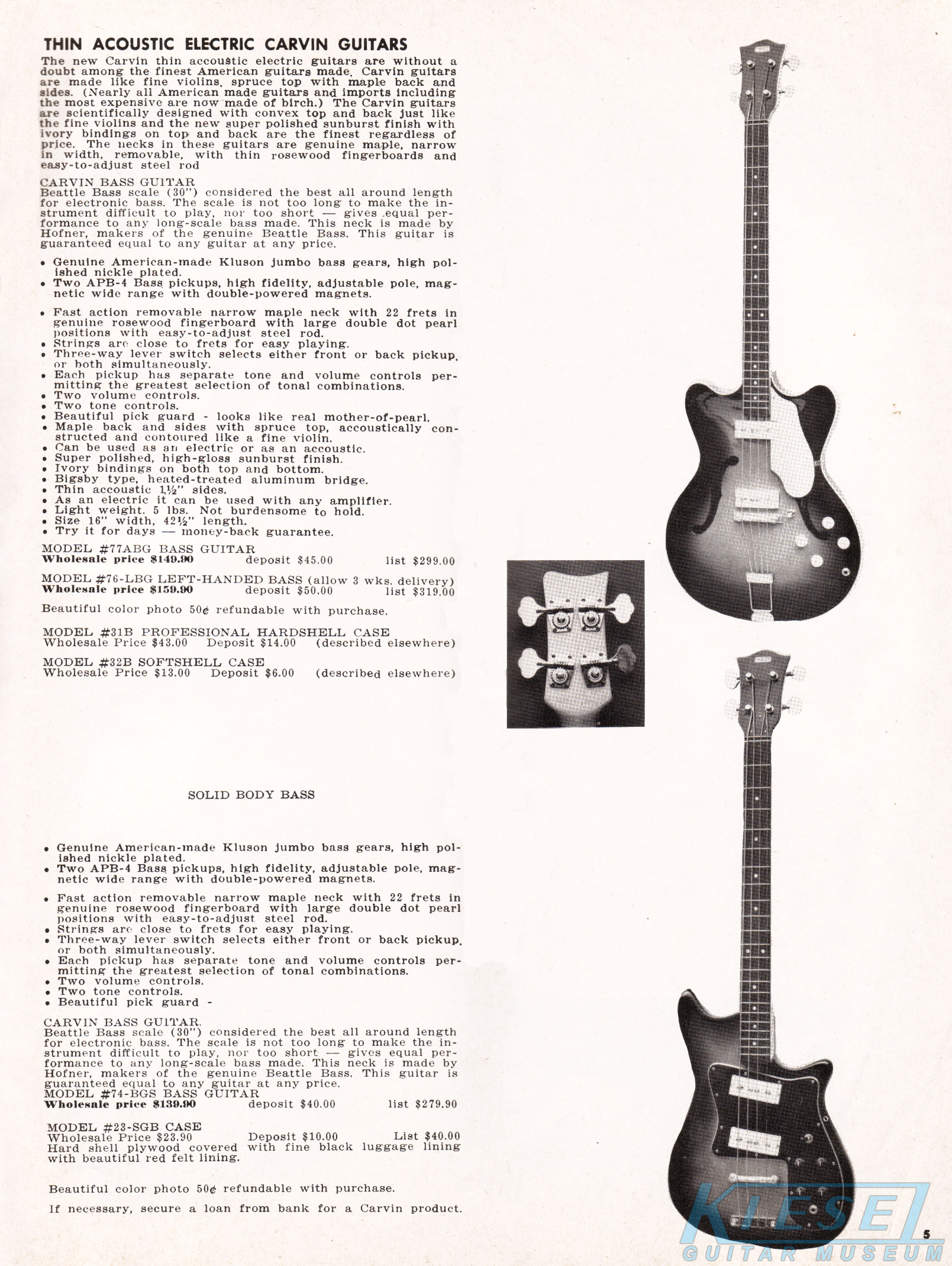 The Model #77-ABG had been offered in 1968, but wasn't pictured in the catalog until '69. This was an acoustic/electric bass with a 30" scale, Kluson tuners, and spruce top with maple back and sides. Electronics consisted of the Carvin APB-4 pickups, with dual volume and tone controls and 3-way selector switch. The Model #77-ABG sold for $149.90, and the left handed model (#76-LBG) sold for $159.90.