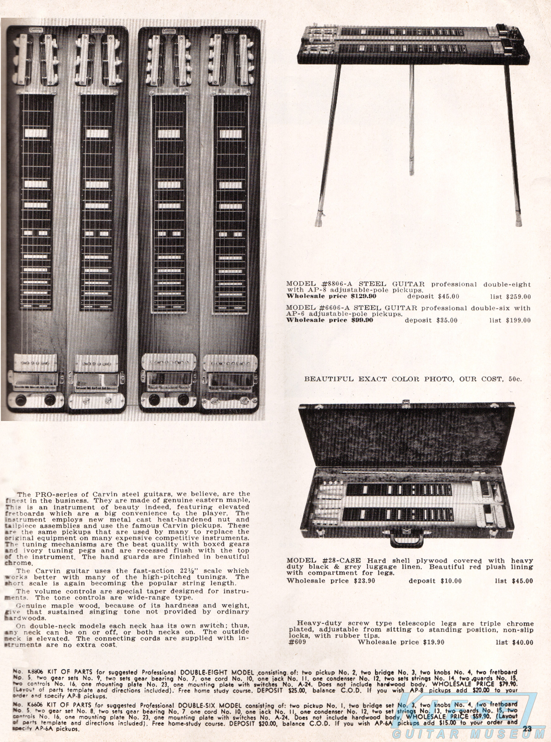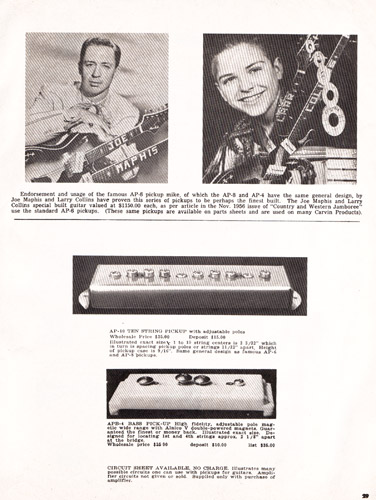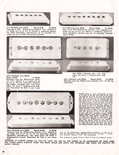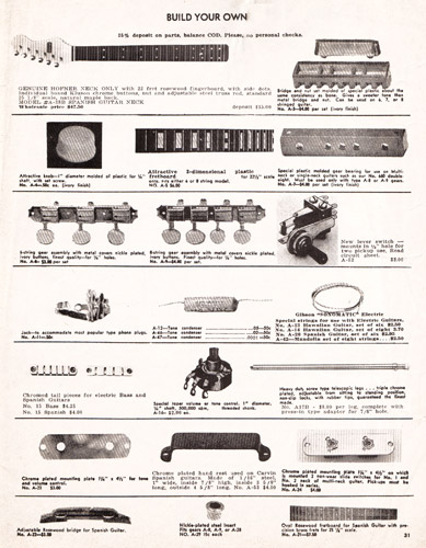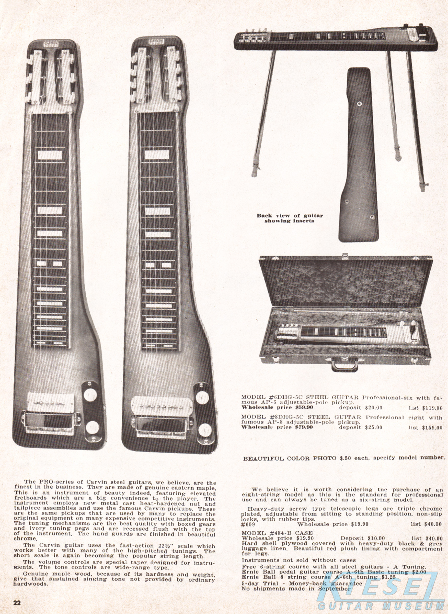 There were also lap steep guitars to choose from, in 6 and 8 string, and single and doubleneck varieties. Like other Carvin lap steels, the Model #6DHG-5C 6-string lap steel was constructed of maple, with a single AP-6 pickup, volume and tone controls, cast nut and tailpiece, chrome trim and ivory tuning pegs. Scale length was 22.5" on all lap steels. The #6DHG-5C sold for $59.90, and the model #8DHG-5C 8-string model (near left) sold for $79.90.