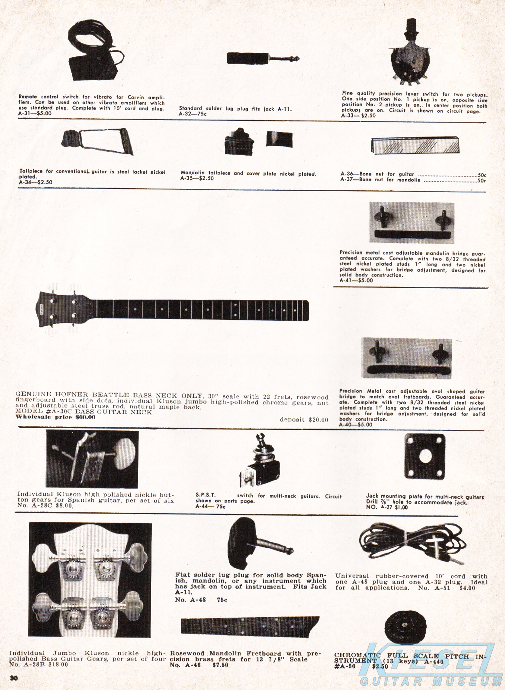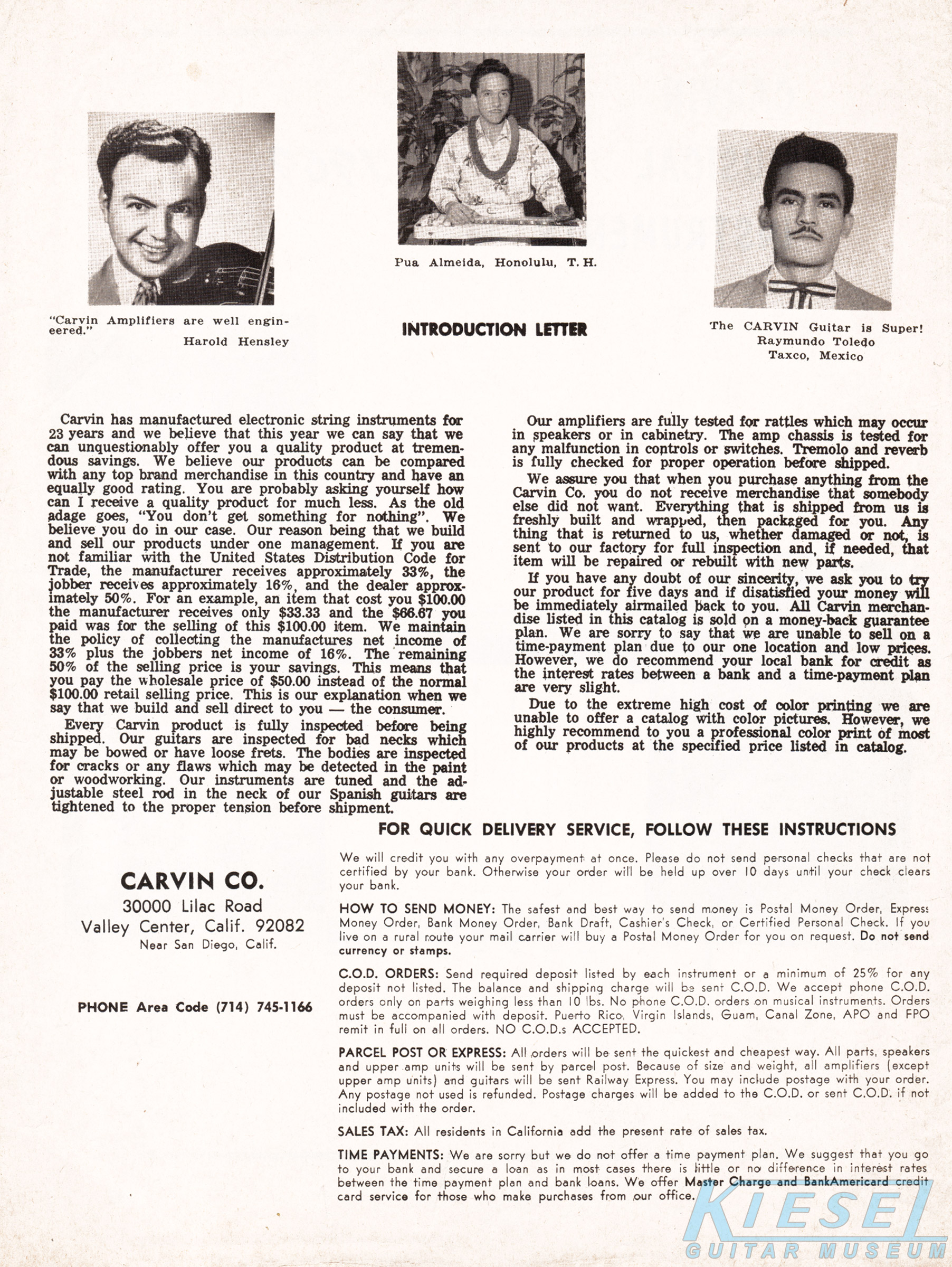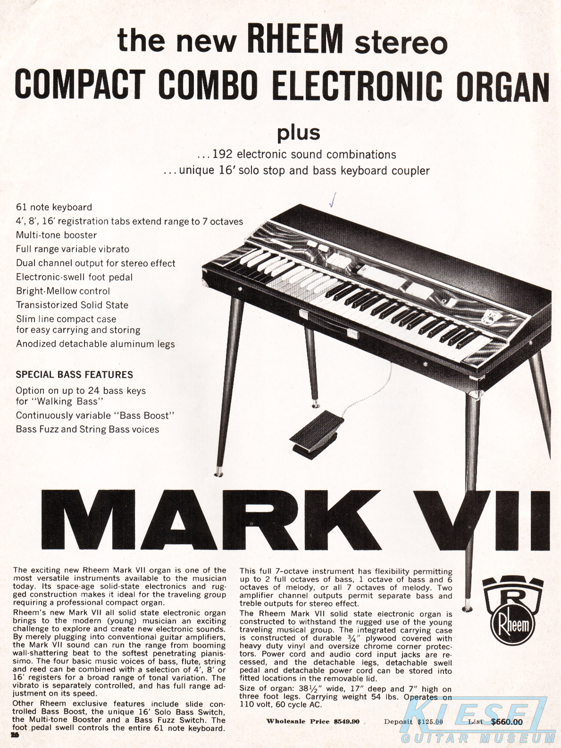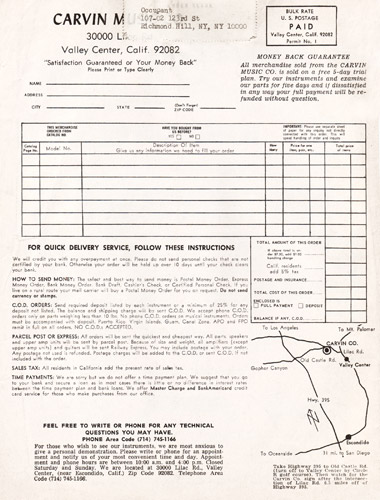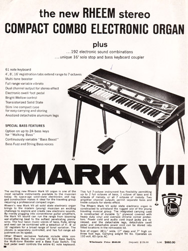 Interestingly, there were more instruments offered by Carvin than just guitars and basses in 1969. As they had done off and on throughout their history, Carvin was an authorized reseller of instruments made by other manufacturers. The catalog featured the Mark VII organ, which was made by Rheem (known now primarily for air conditioners!). Direct price on this item was $549.90.