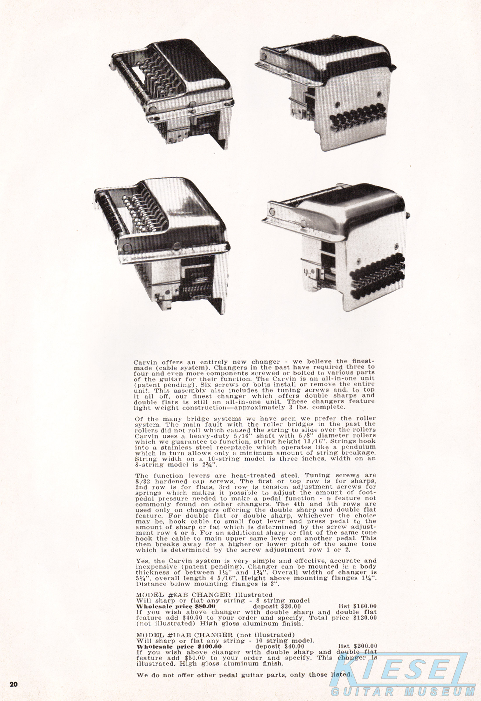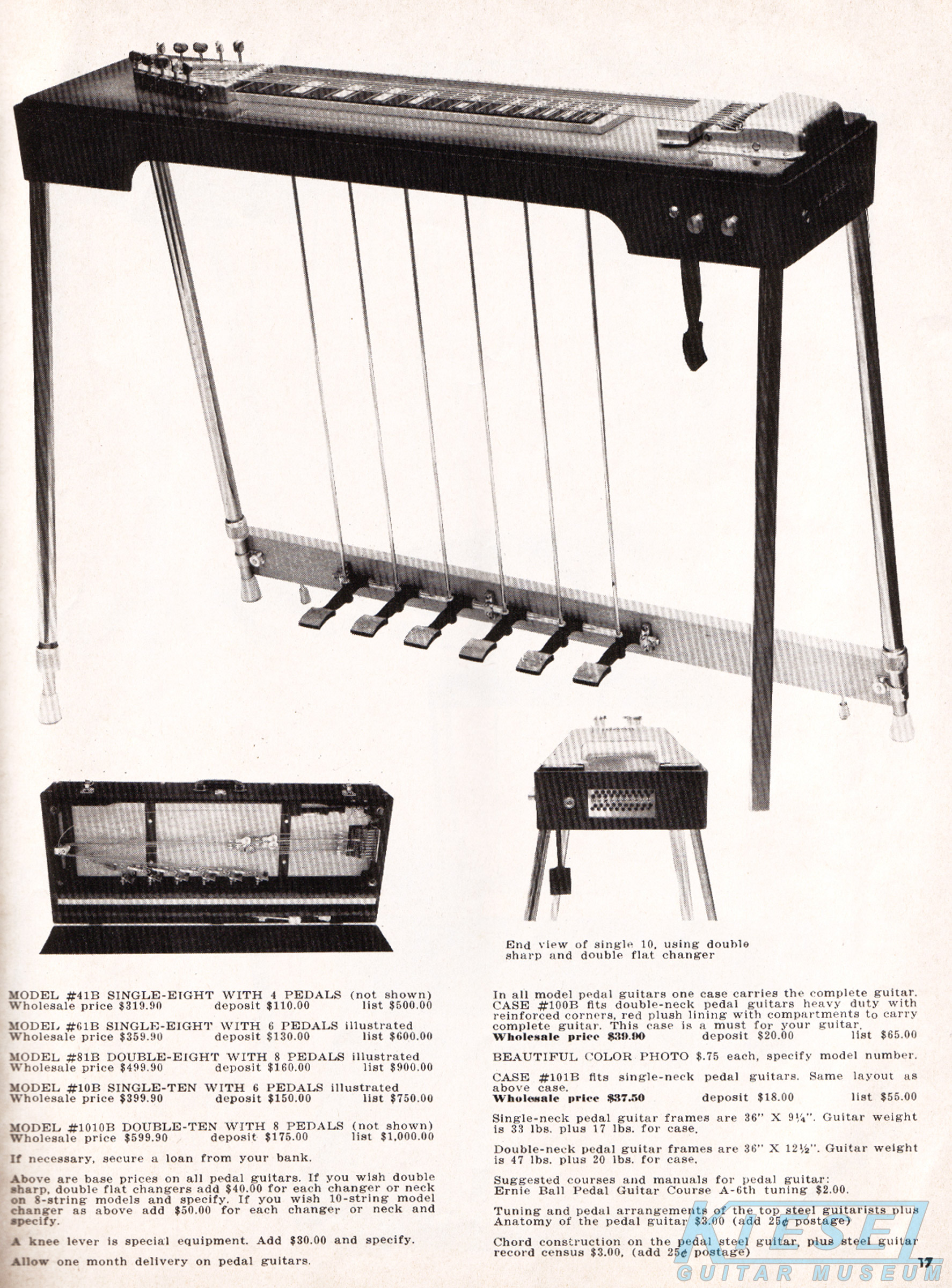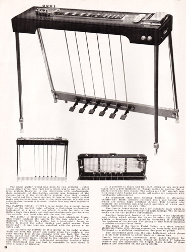 In addition to guitars and basses, Carvin also offered a wide selection of steel guitars, in both lap and pedal varieties. The Model #61-B 8-string steel guitar was which was an 8-string model with 6 pedals. It sold for $359.90. Below is the model #81-B, which was a doubleneck 8-string with 8 pedals. It sold for $499.90. Also available was the Model #41-B, which was an 8-string with 4 pedals that sold for $319.90; the Model #10B 10-string with 6 pedals that sold for $399.90; and the model #1010B, which was a doubleneck 10-string with 8 pedals that sold for $599.90. Carvin also offered a variety of accessories for their pedal steel guitars, including cases, pickups and double sharp and double flat changers.