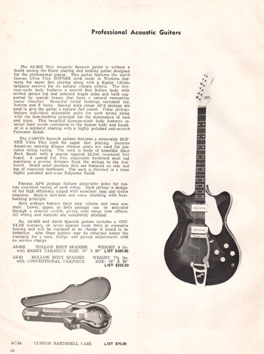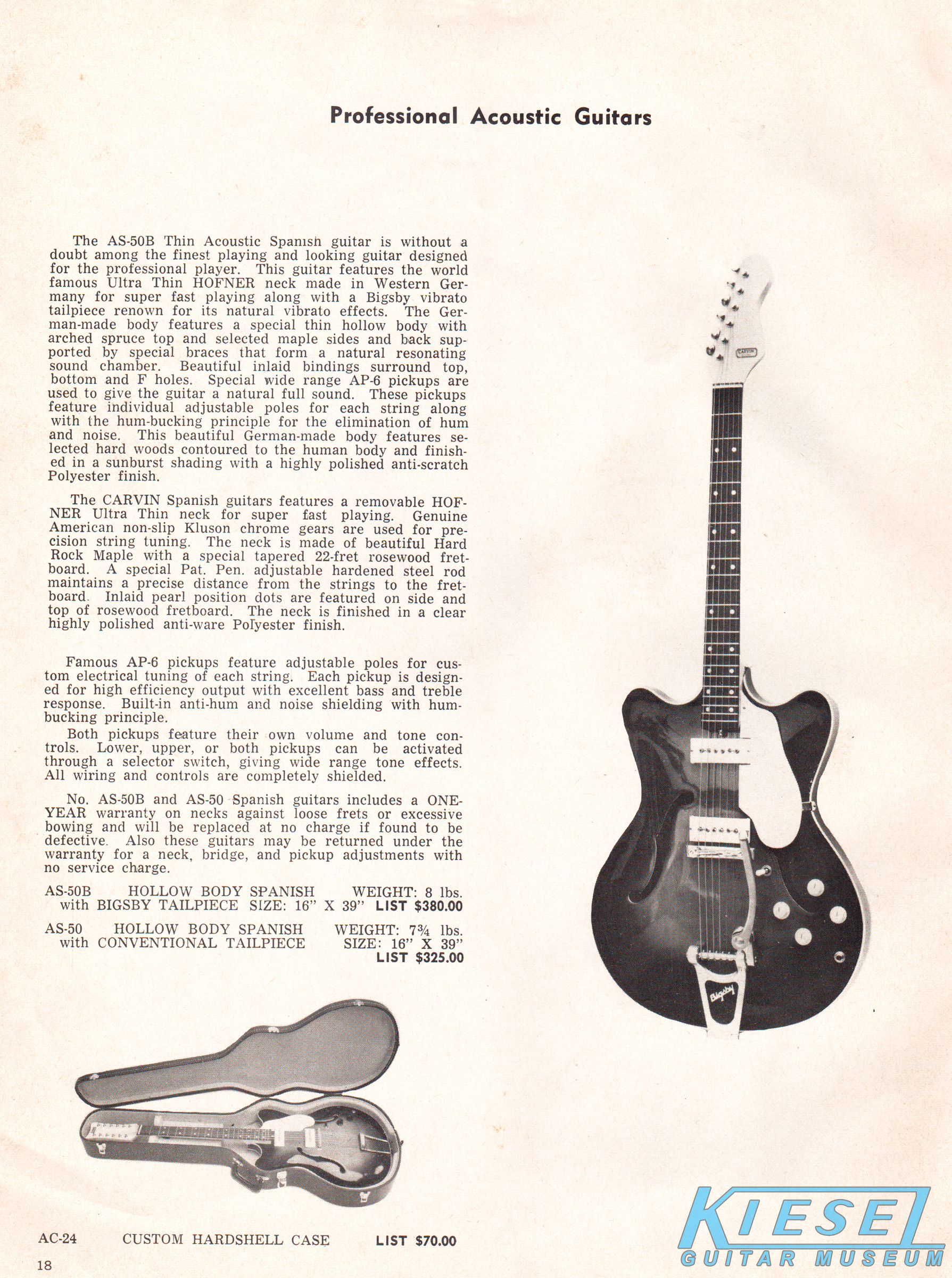 The semi-hollow AS50B was identical to the 1969 #36-ASGC. This model had a standard Hofner maple neck with rosewood fingerboard, maple body with spruce top, Kluson tuners and AP-6 pickups with dual volume and tone controls and a 3-way selector switch. The Bigsby vibrato tailpiece was optional. The AS50 sold for $160.00, and the AS50B was $190.00. The AC24 hardshell case was $40.00.